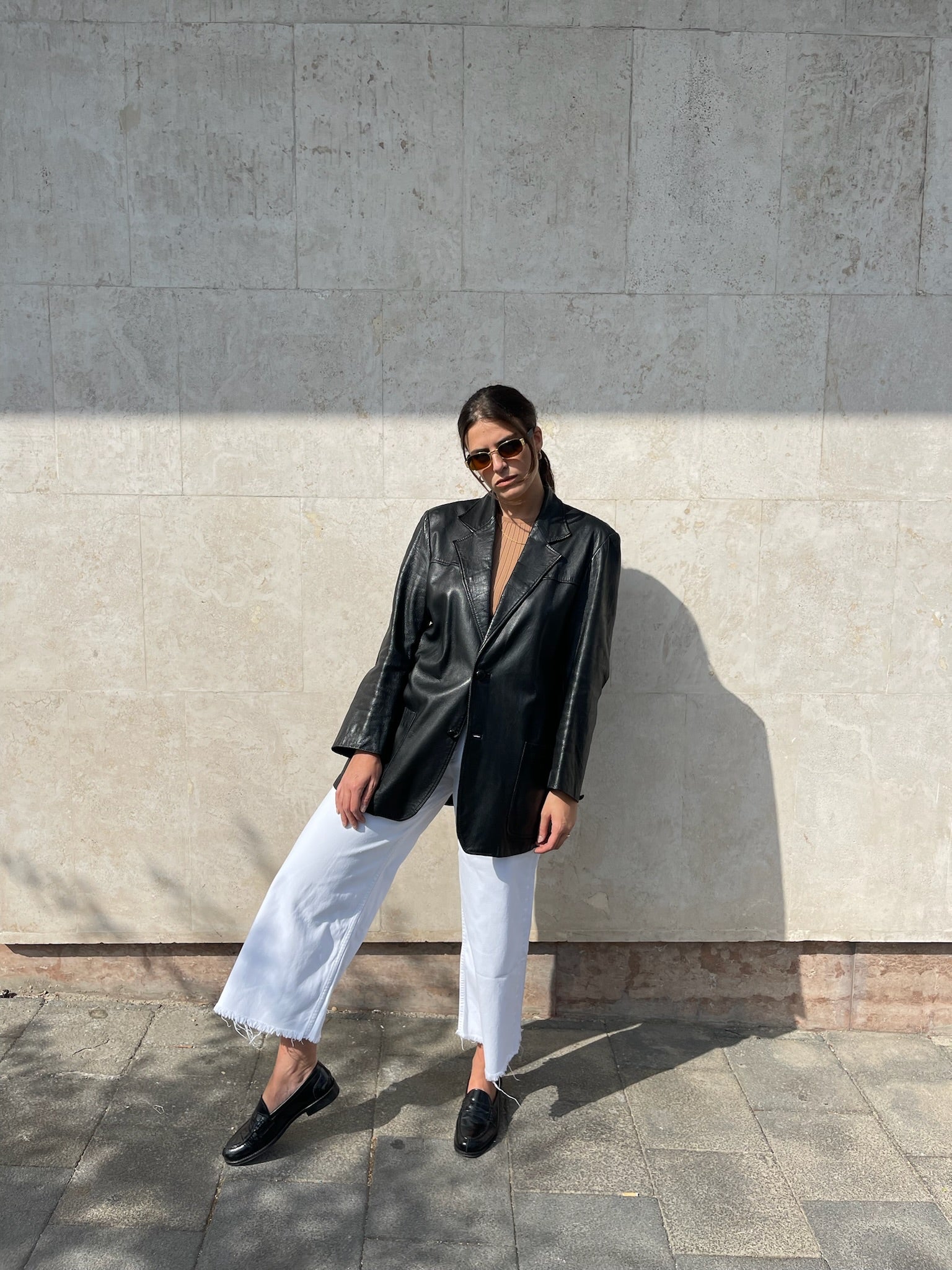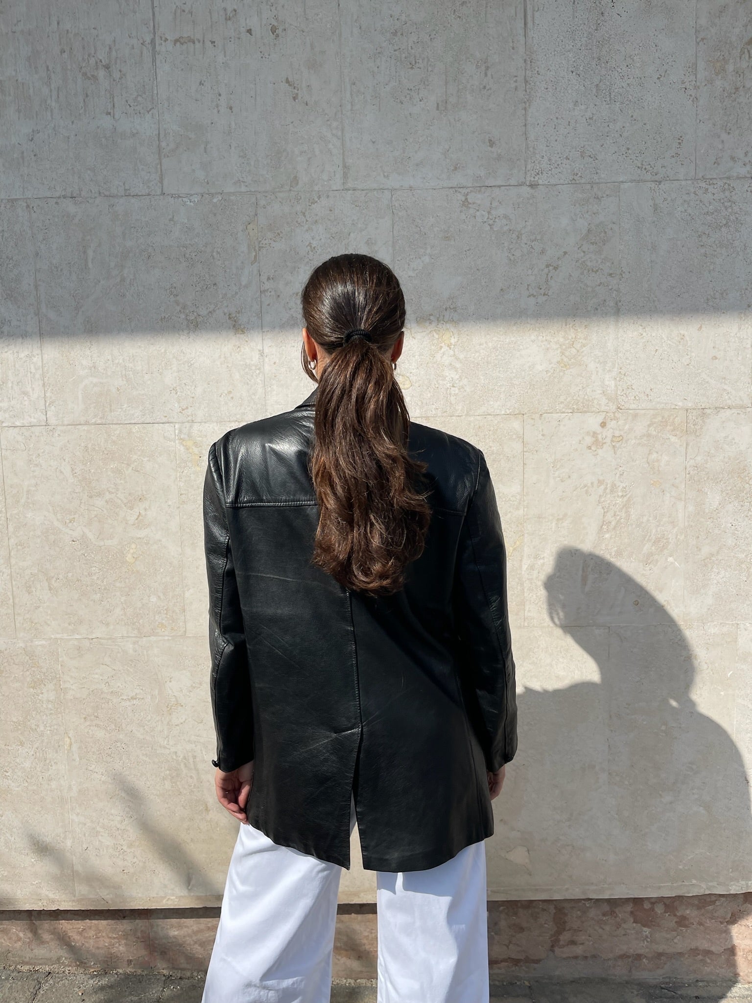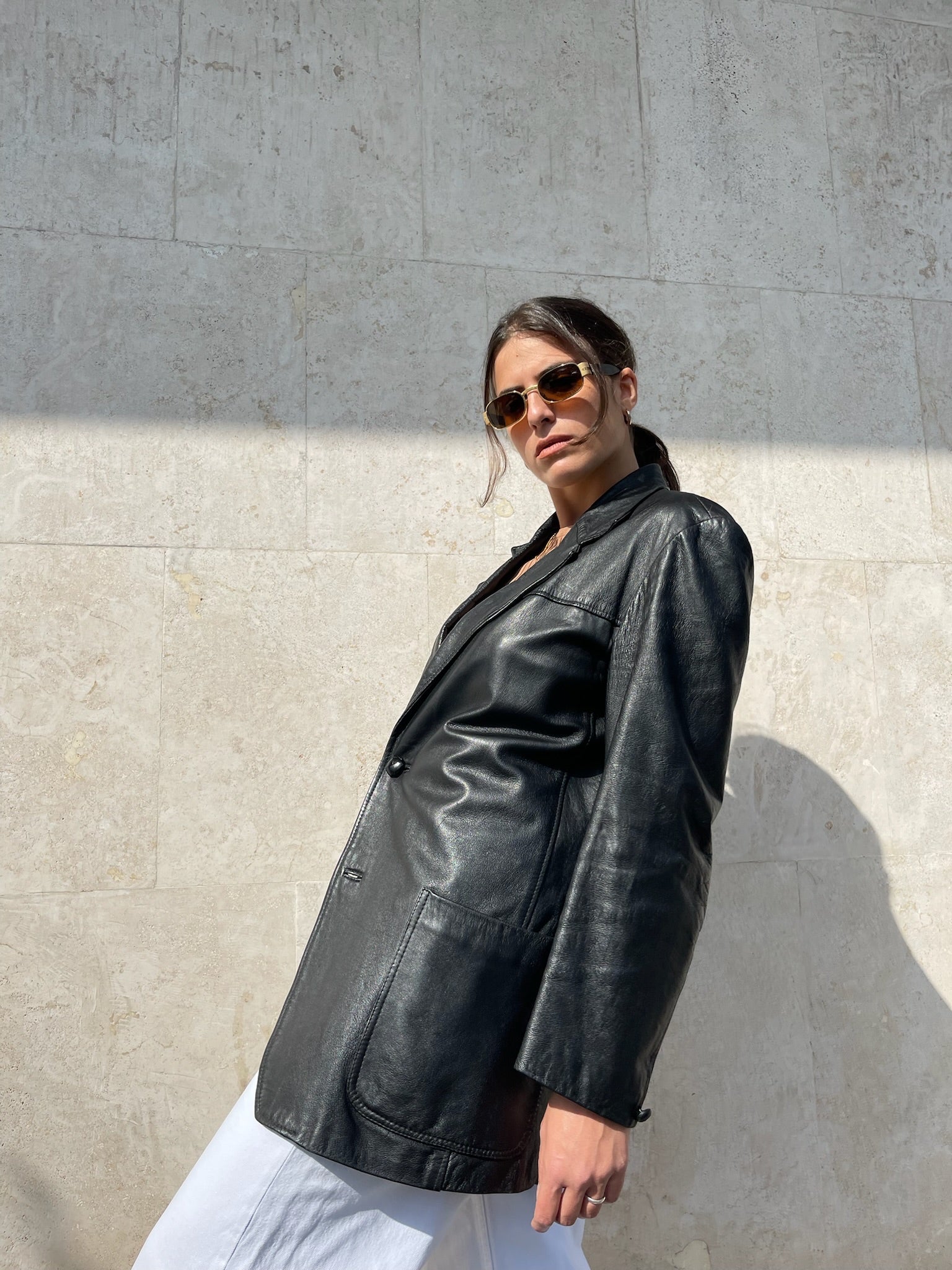 Blazer monopetto in vera pelle con revers classico e tasconi frontali, i bottoni sono rivestiti in pelle. Vestibilità dritta e comfy.