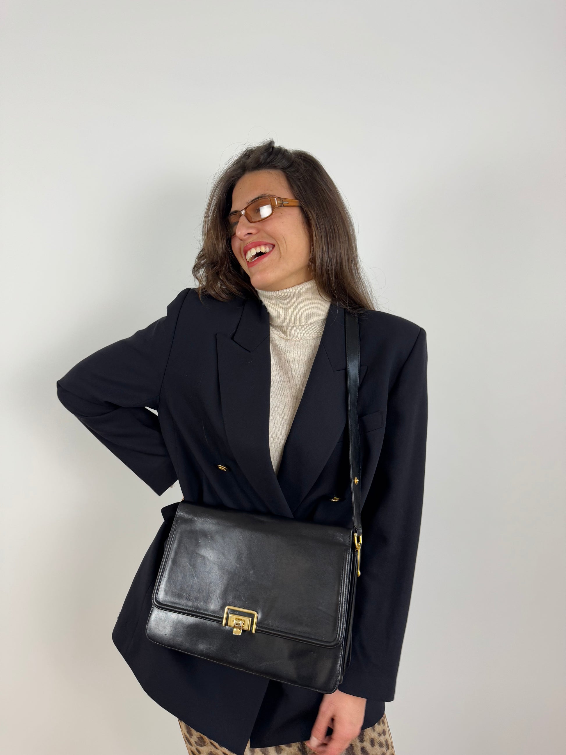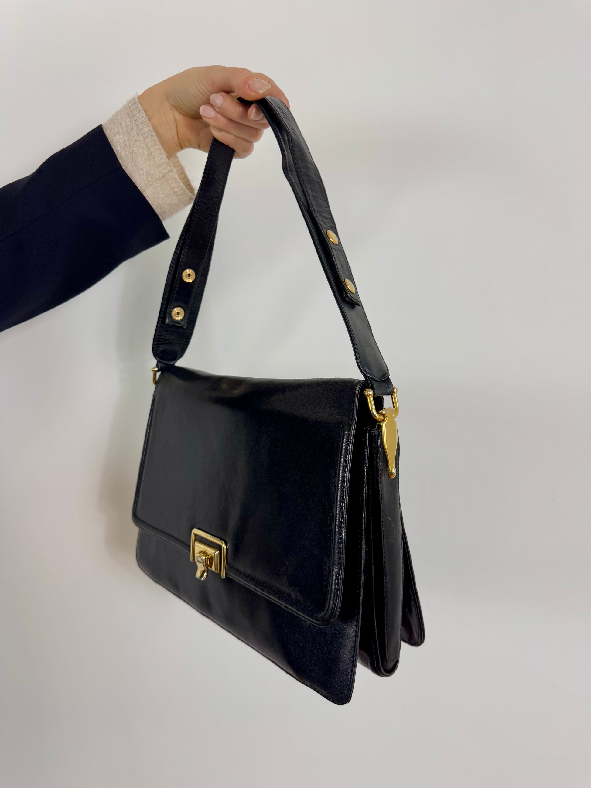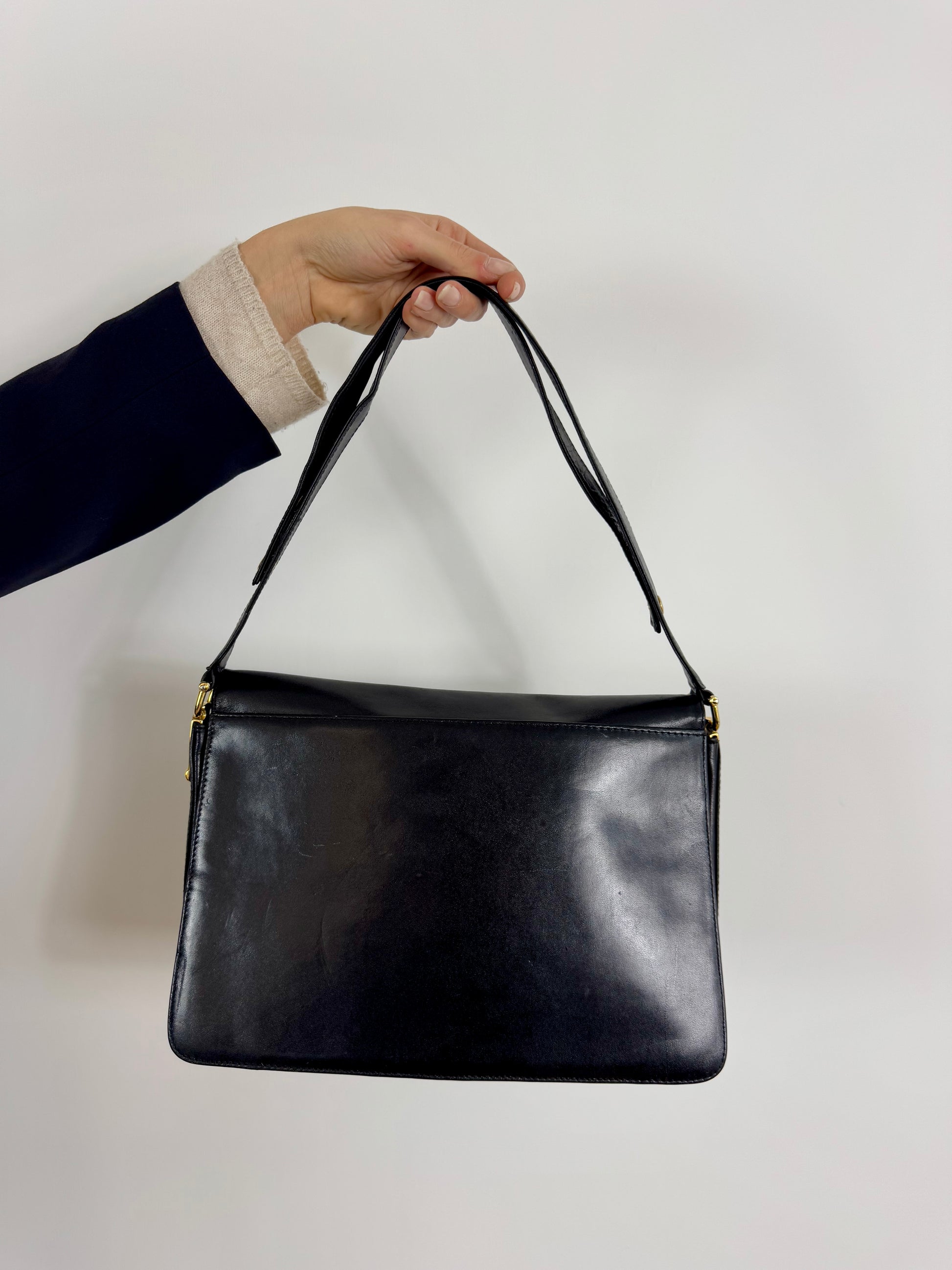 Borsa a spalla in vera pelle nera con tracolla regolabile, dalla forma rettangolare. Fibbia frontale in metallo dorato con meccanismo a scatto. Elementi metallici con finitura dorata. Scomparti interni e tasca con zip