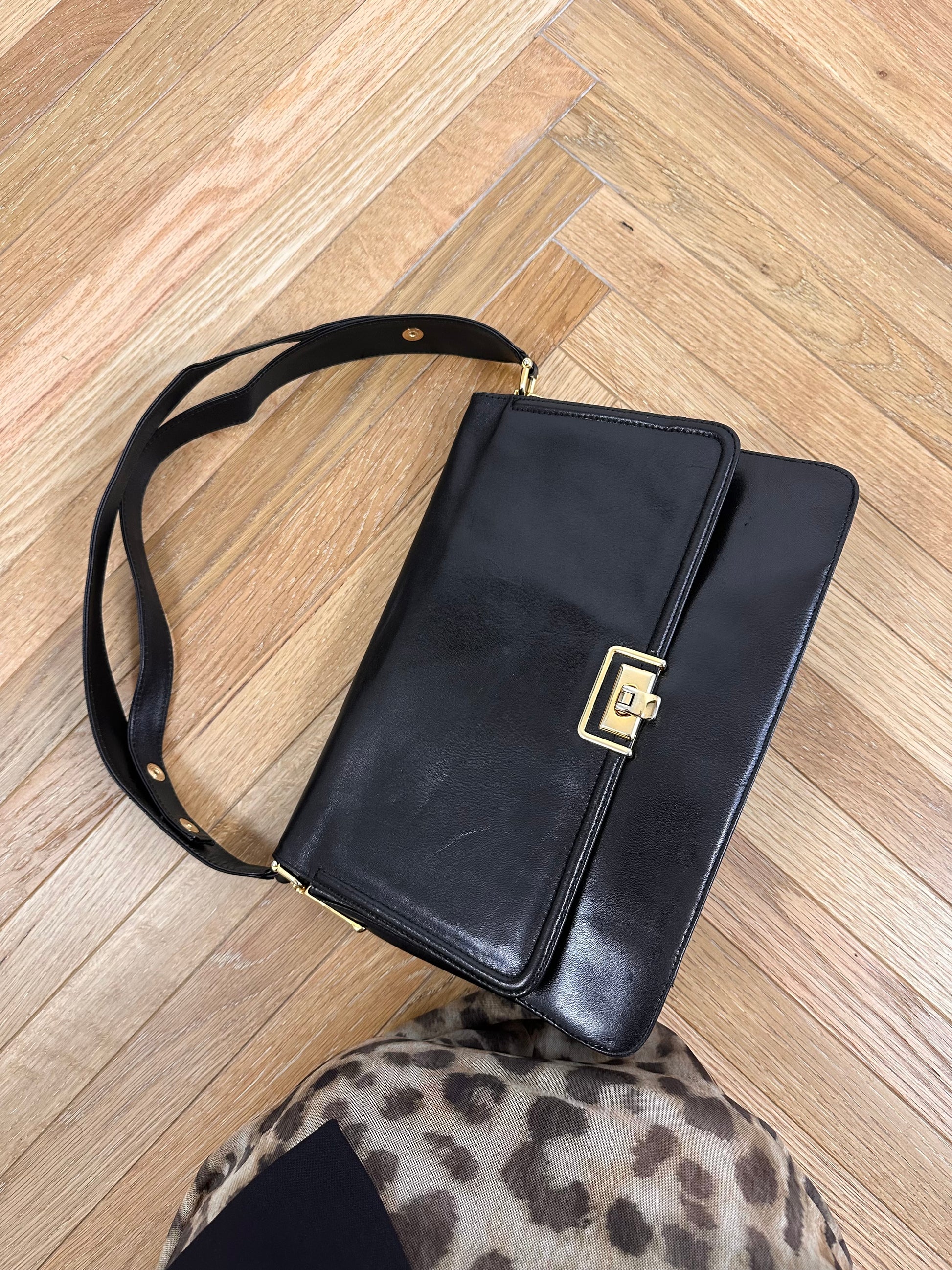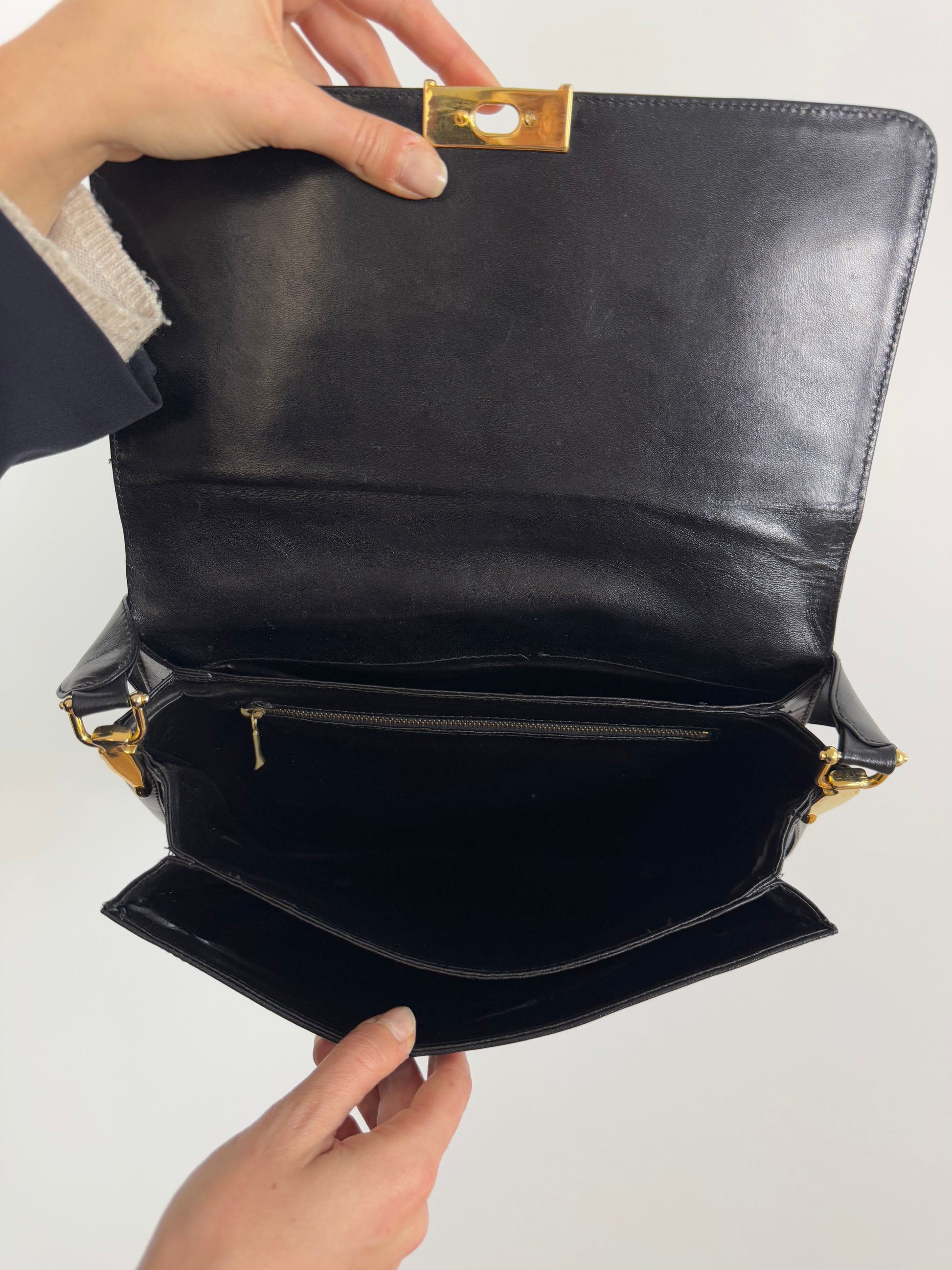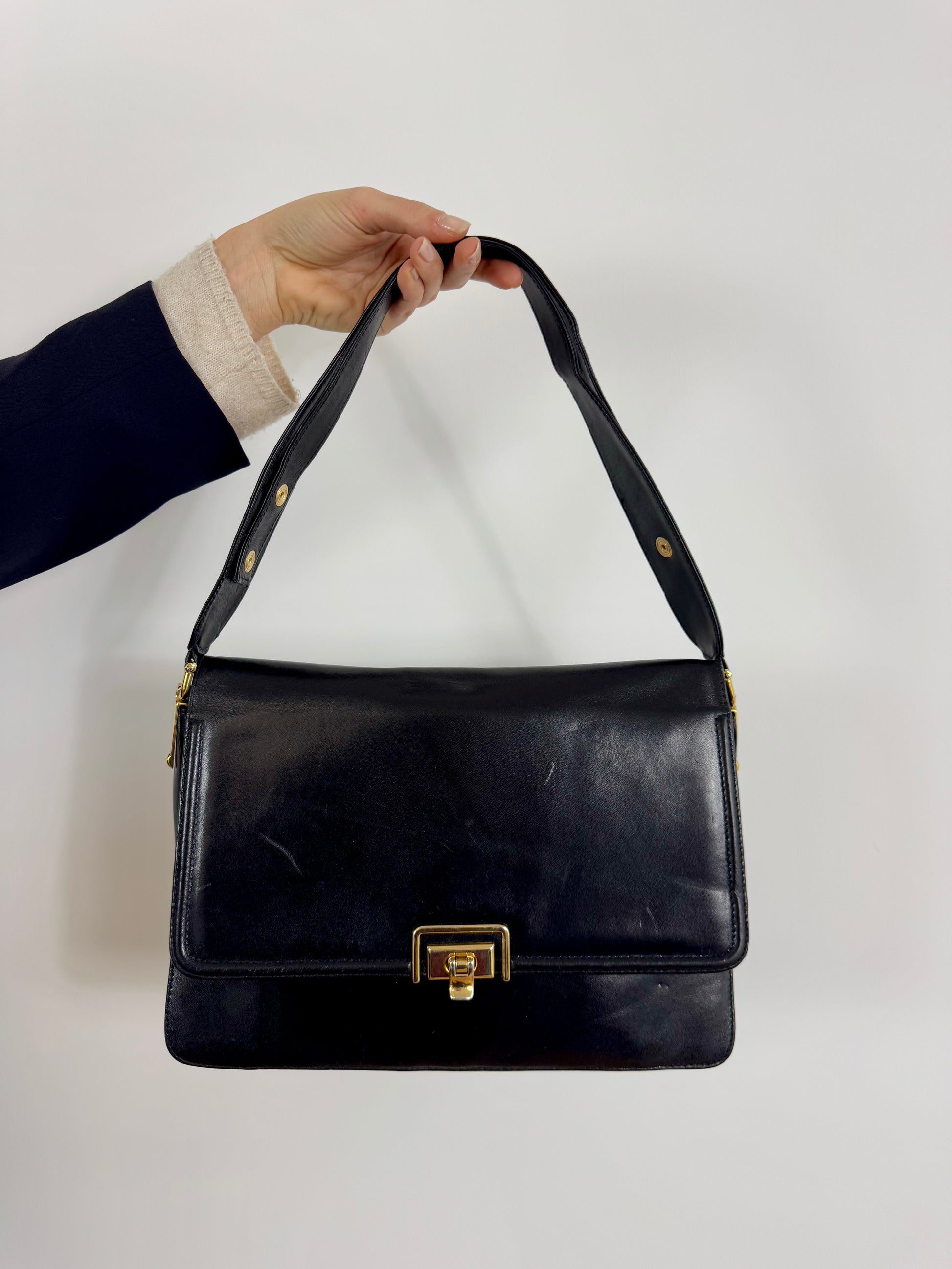 Borsa a spalla in vera pelle nera con tracolla regolabile, dalla forma rettangolare. Fibbia frontale in metallo dorato con meccanismo a scatto. Elementi metallici con finitura dorata. Scomparti interni e tasca con zip