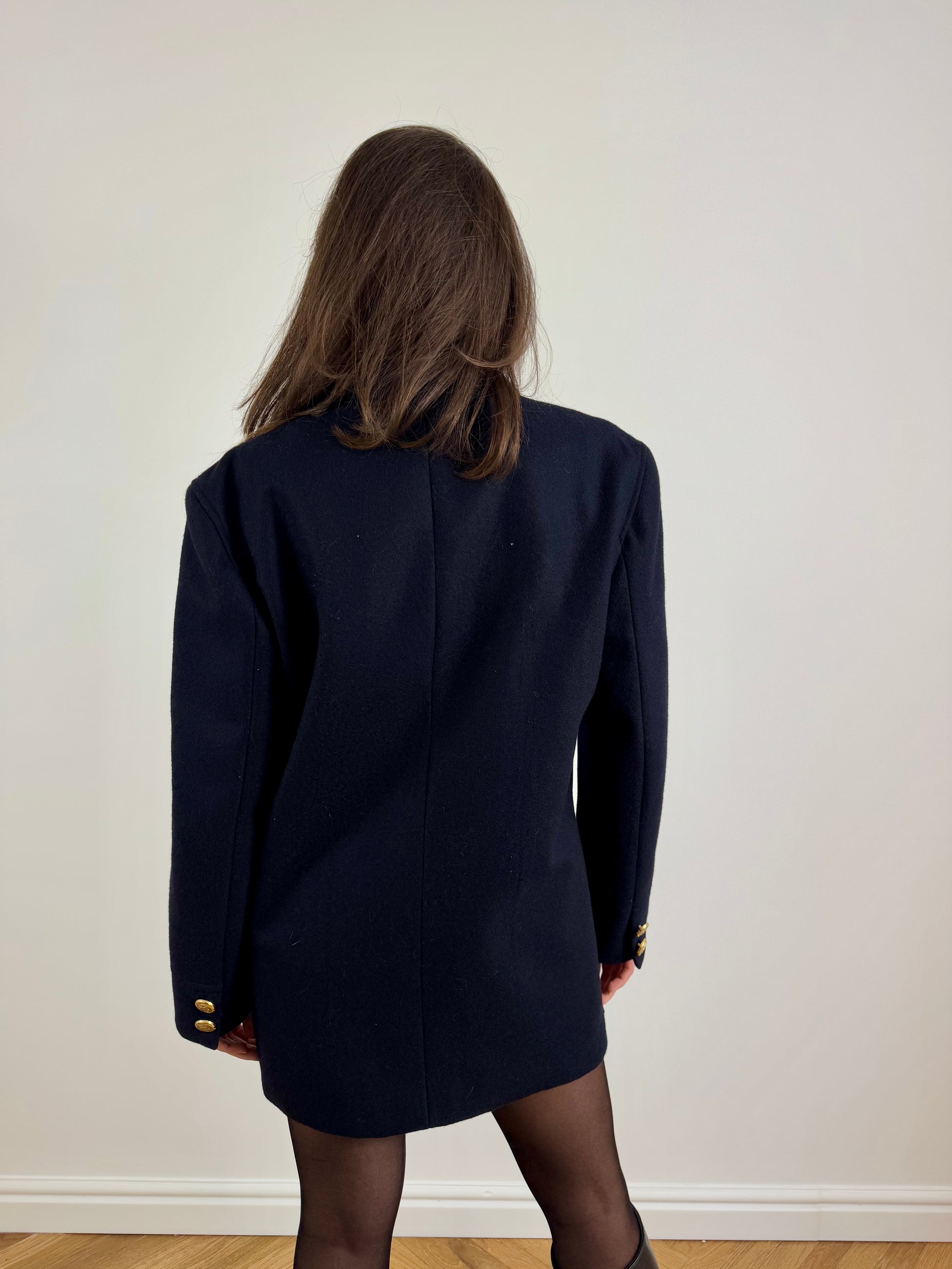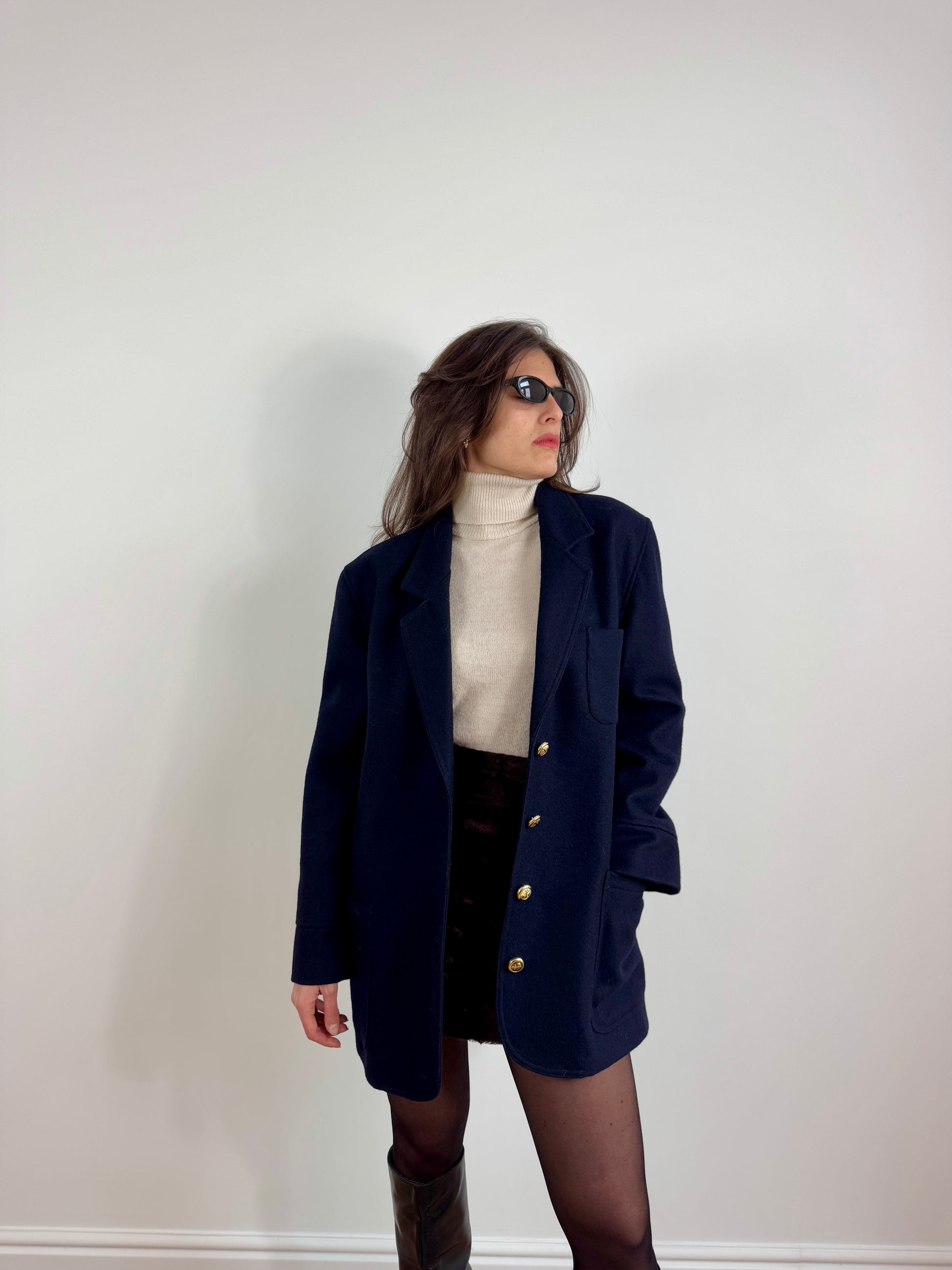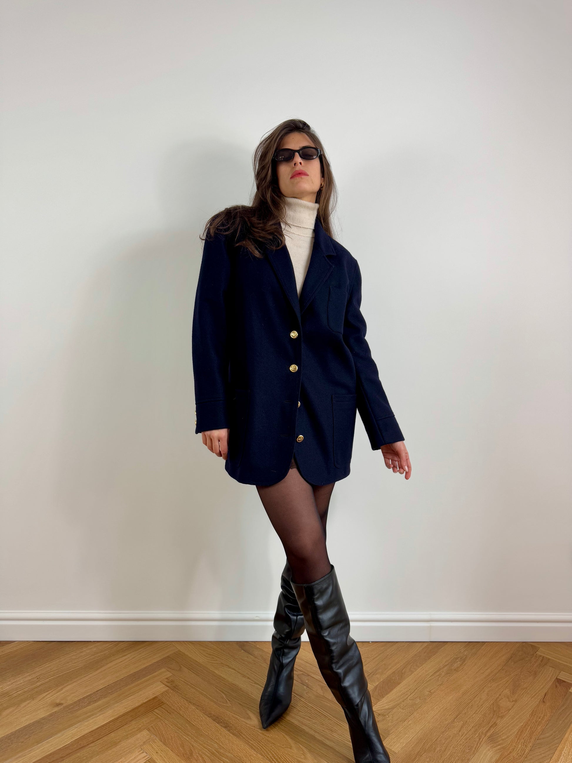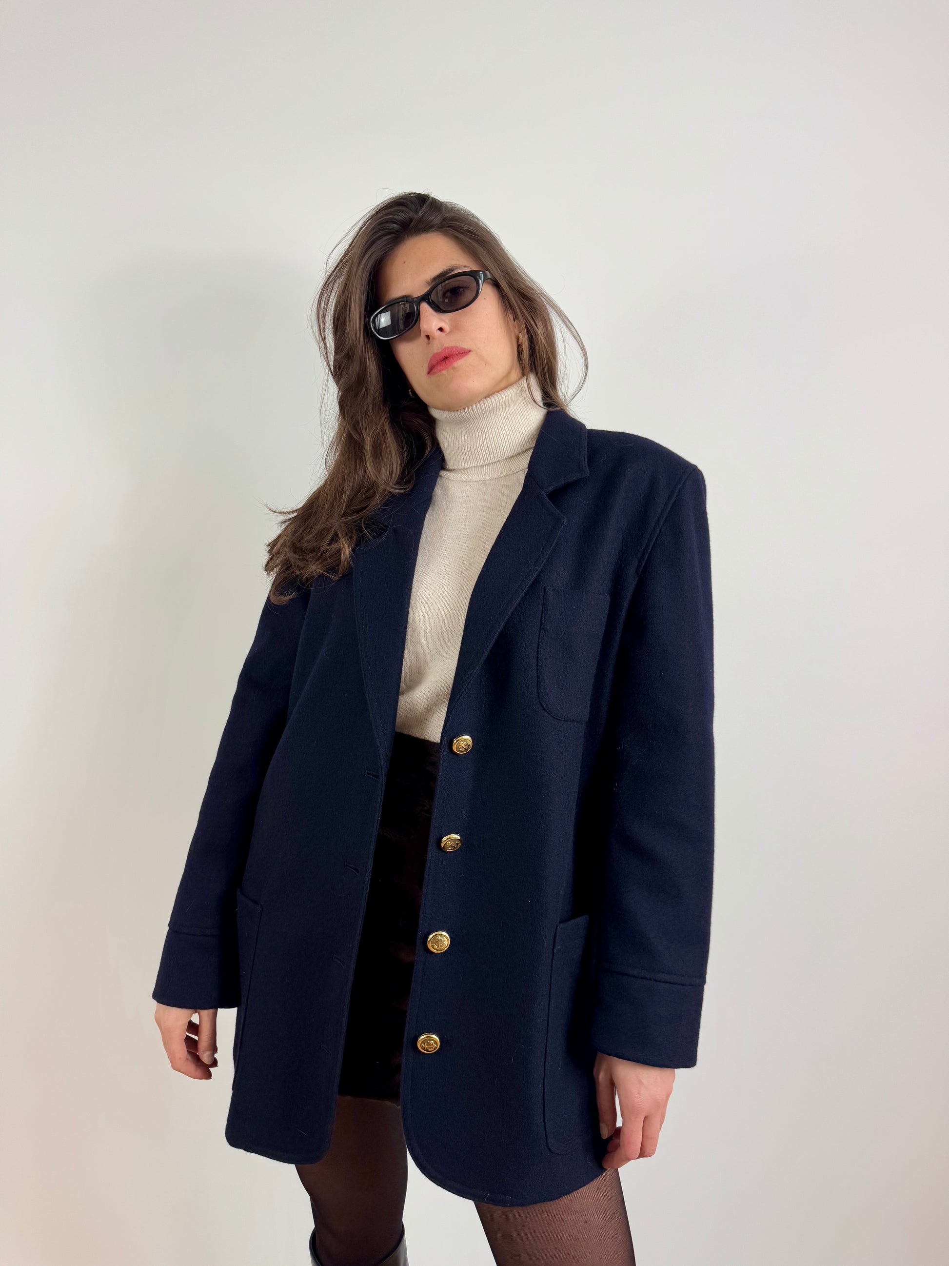 Blazer monopetto blu navy con bottoni dorati con incisione ,tasche frontali e una sul petto, Vestibilità dritta. Internamente foderata.