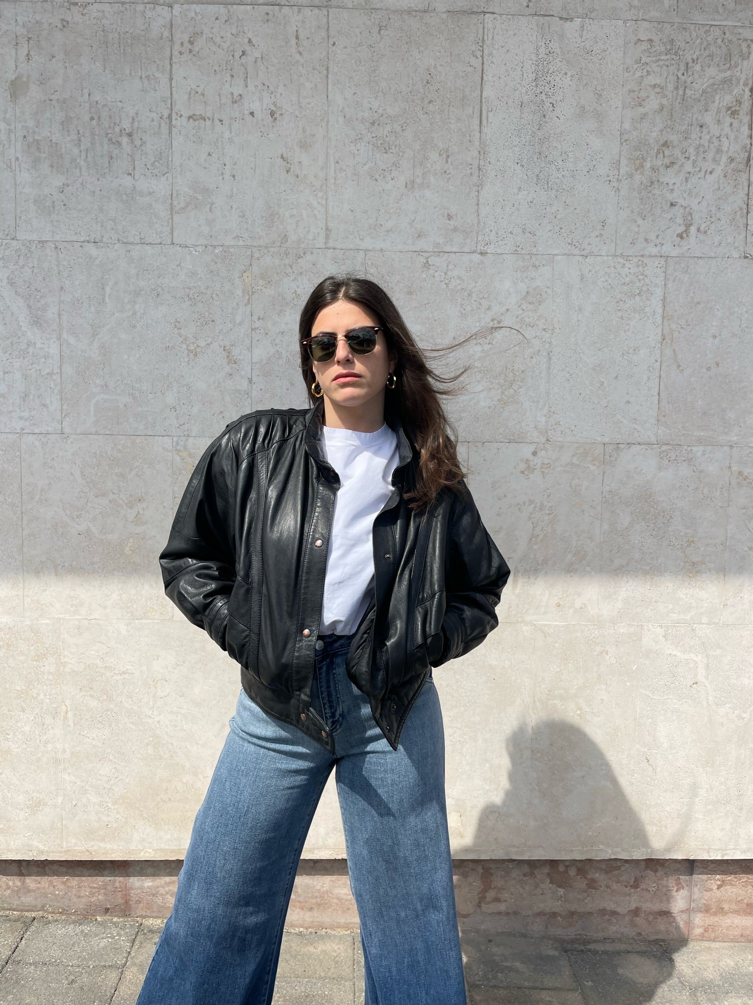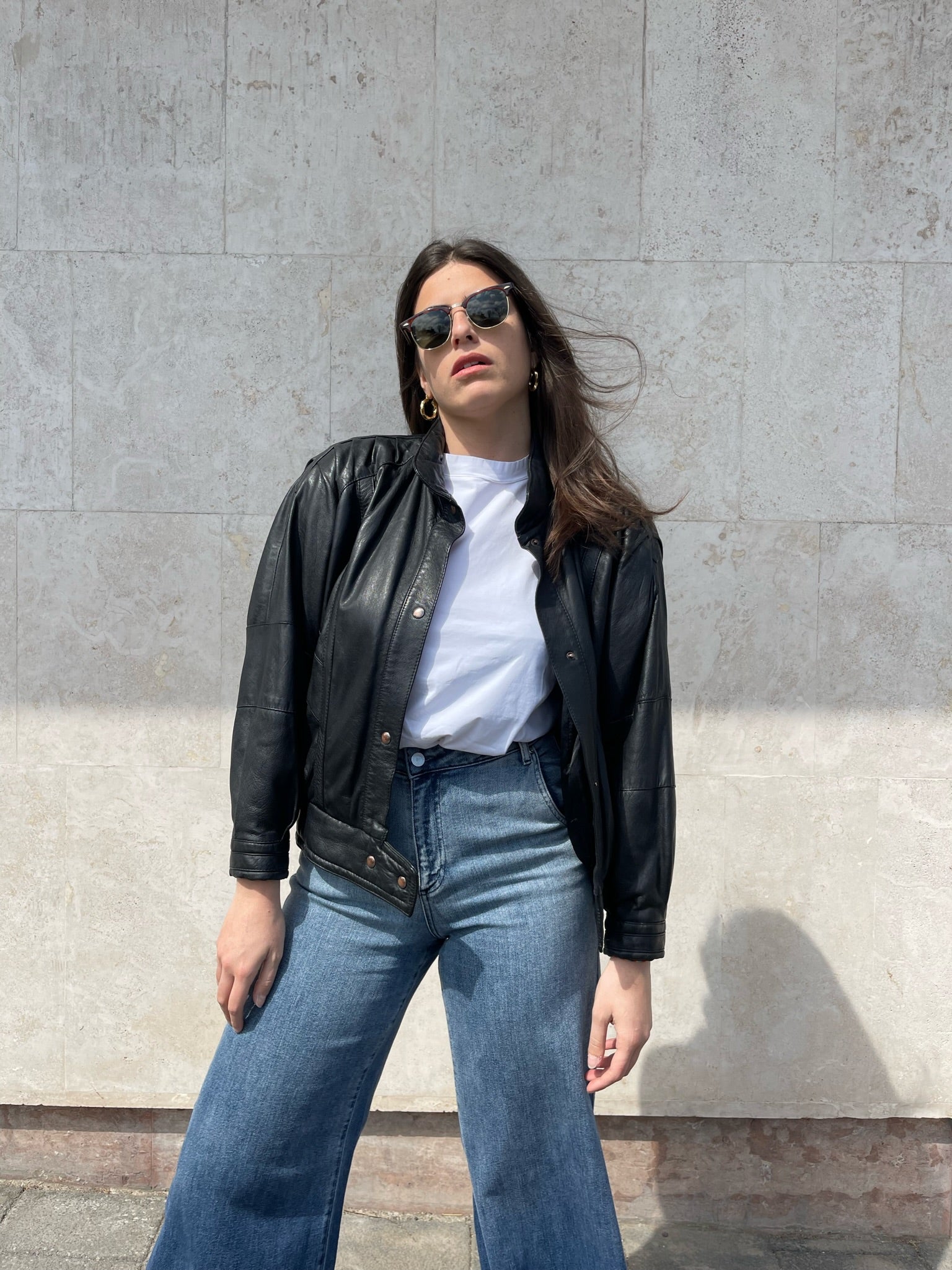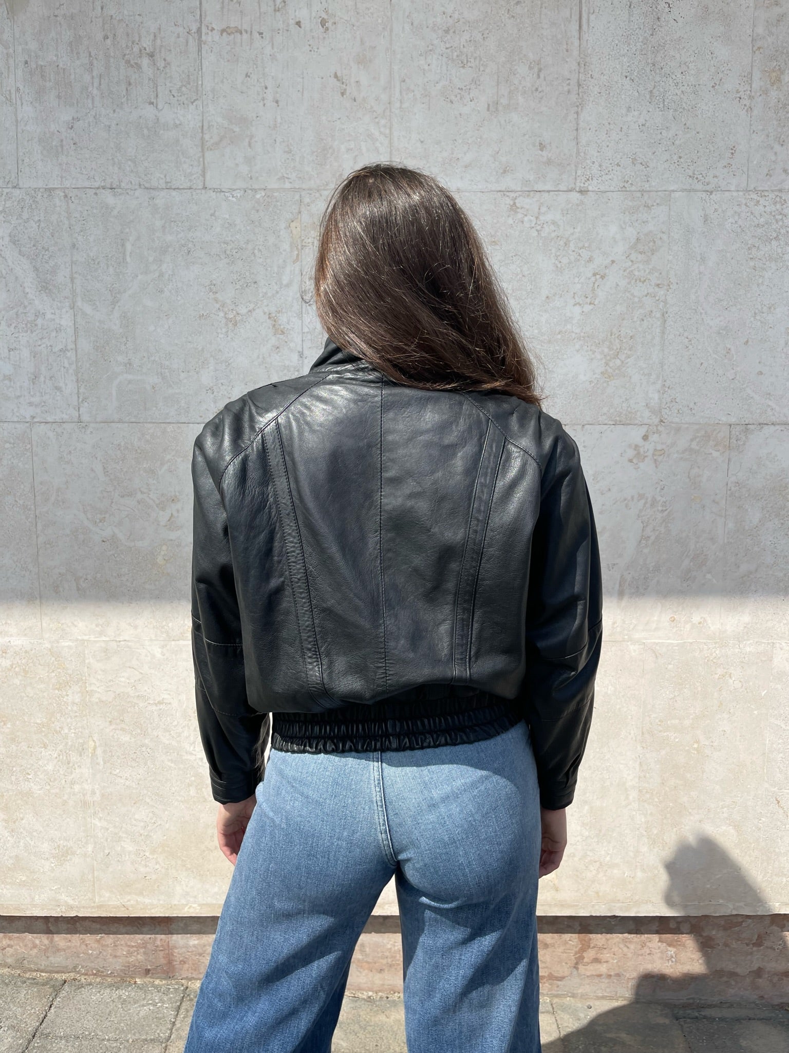 Giacca in pelle nera stile bomber con spalline sottili, taglio sportivo, chiusura con bottoni a pressione e tasche laterali.