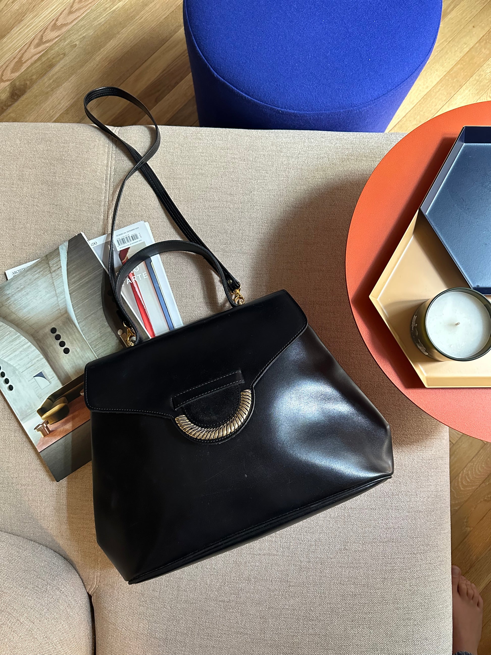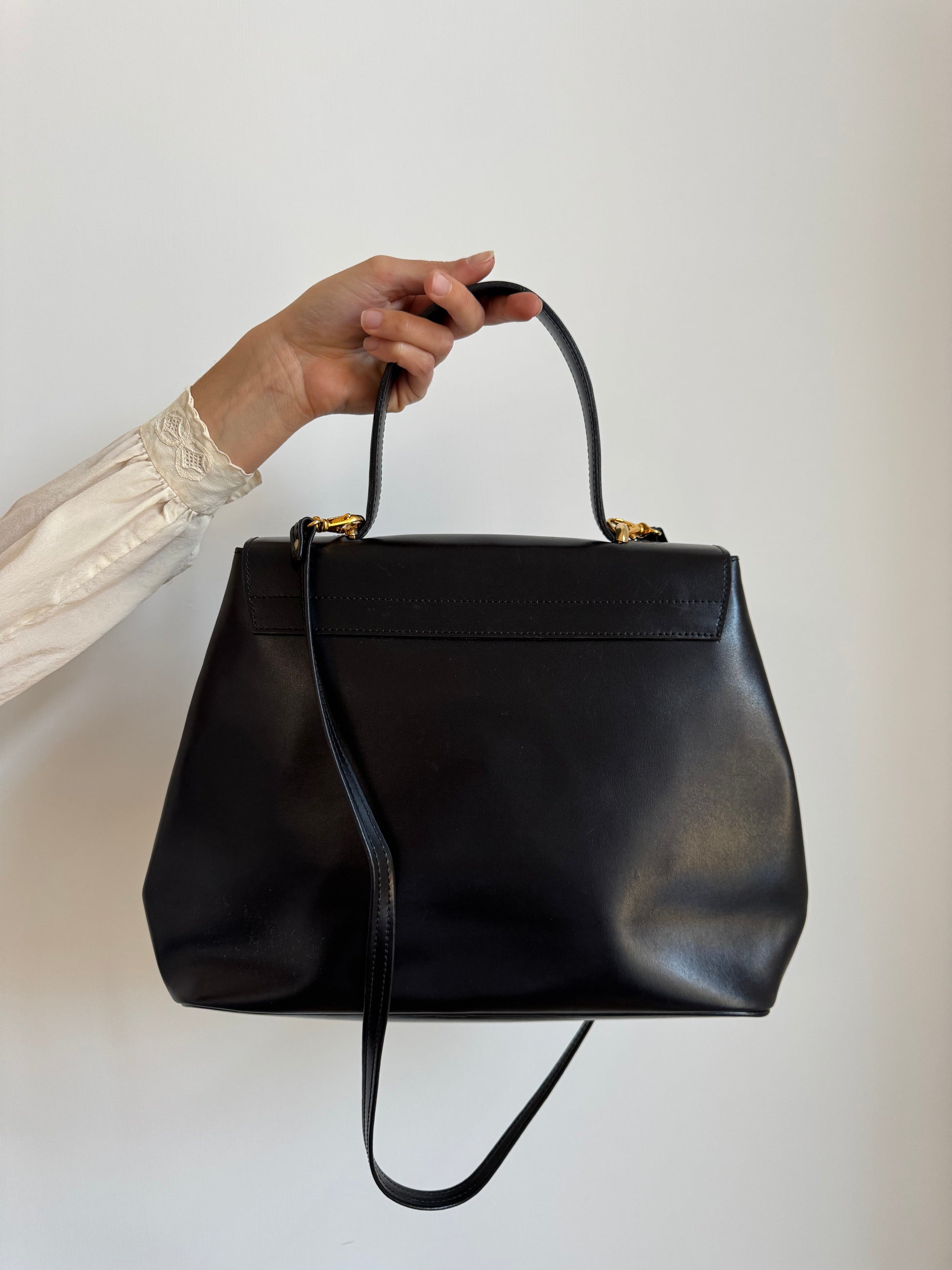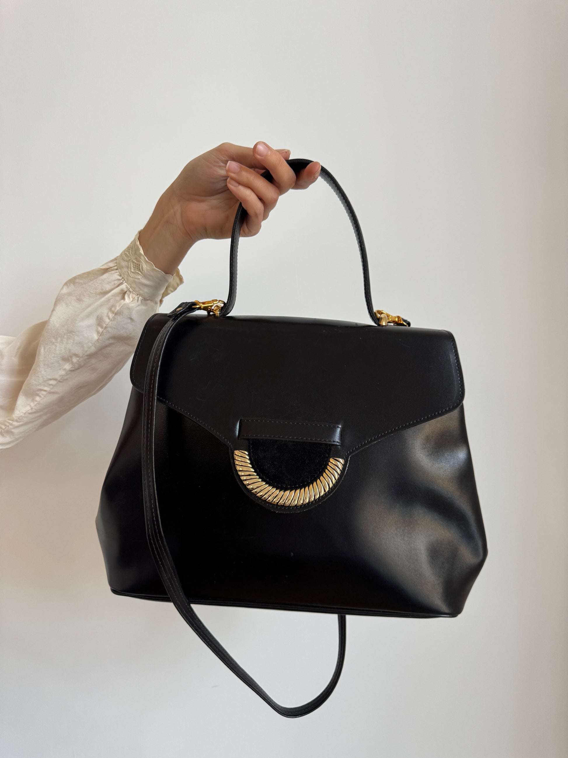 Borsa a mano in vera pelle liscia nera dalla forma trapezoidale, con tracolla removibile. Porta frontalmente una chiusura decorativa a mezzaluna dorata con centro in suede nero. Manico superiore rigido. Fodera interna in pelle nera e tasca con zip.