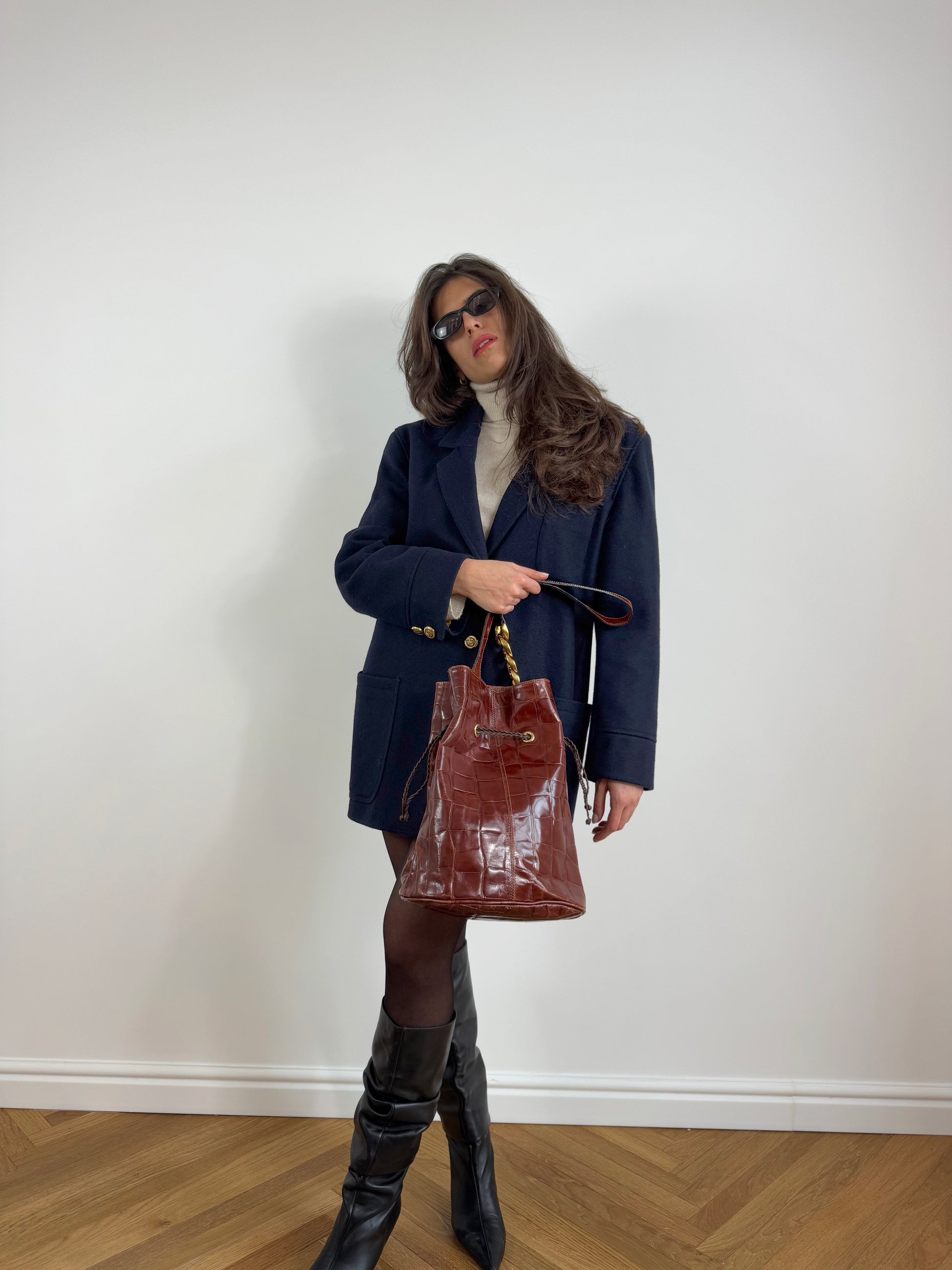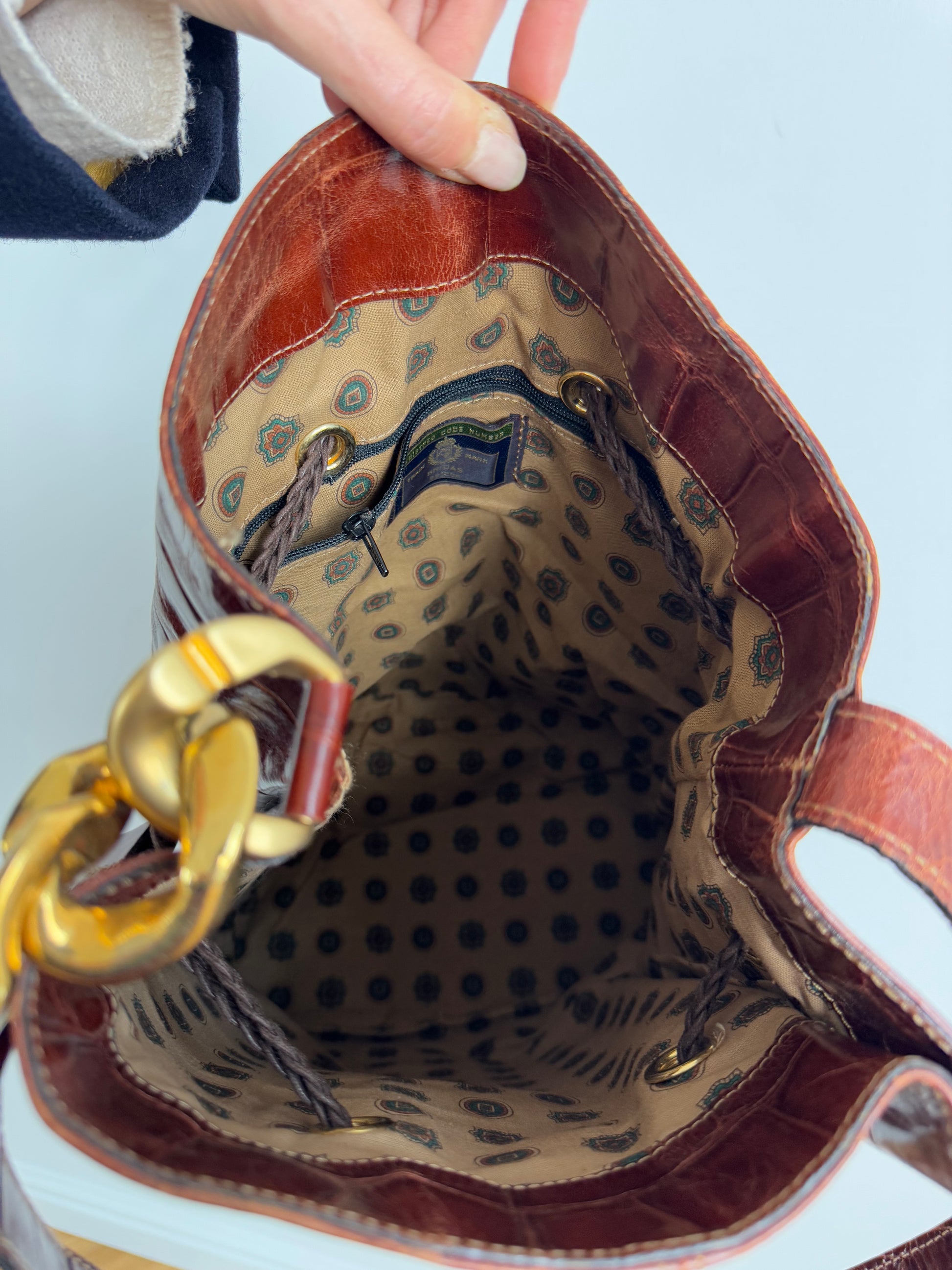 Secchiello vintage marrone in vera pelle con texture in coccodrillo, tracolla con dettaglio dorato. Chiusura modalità coulisse.