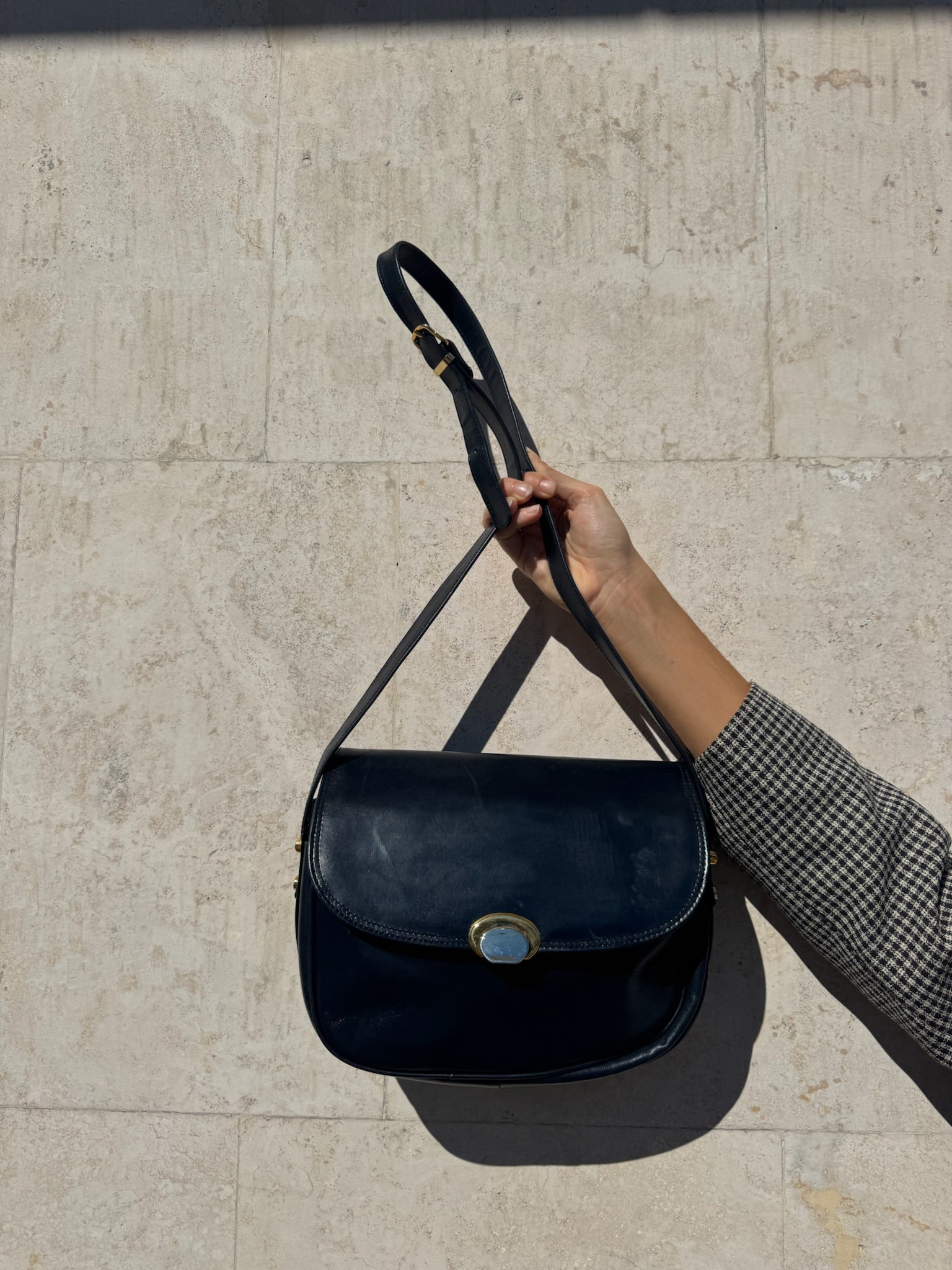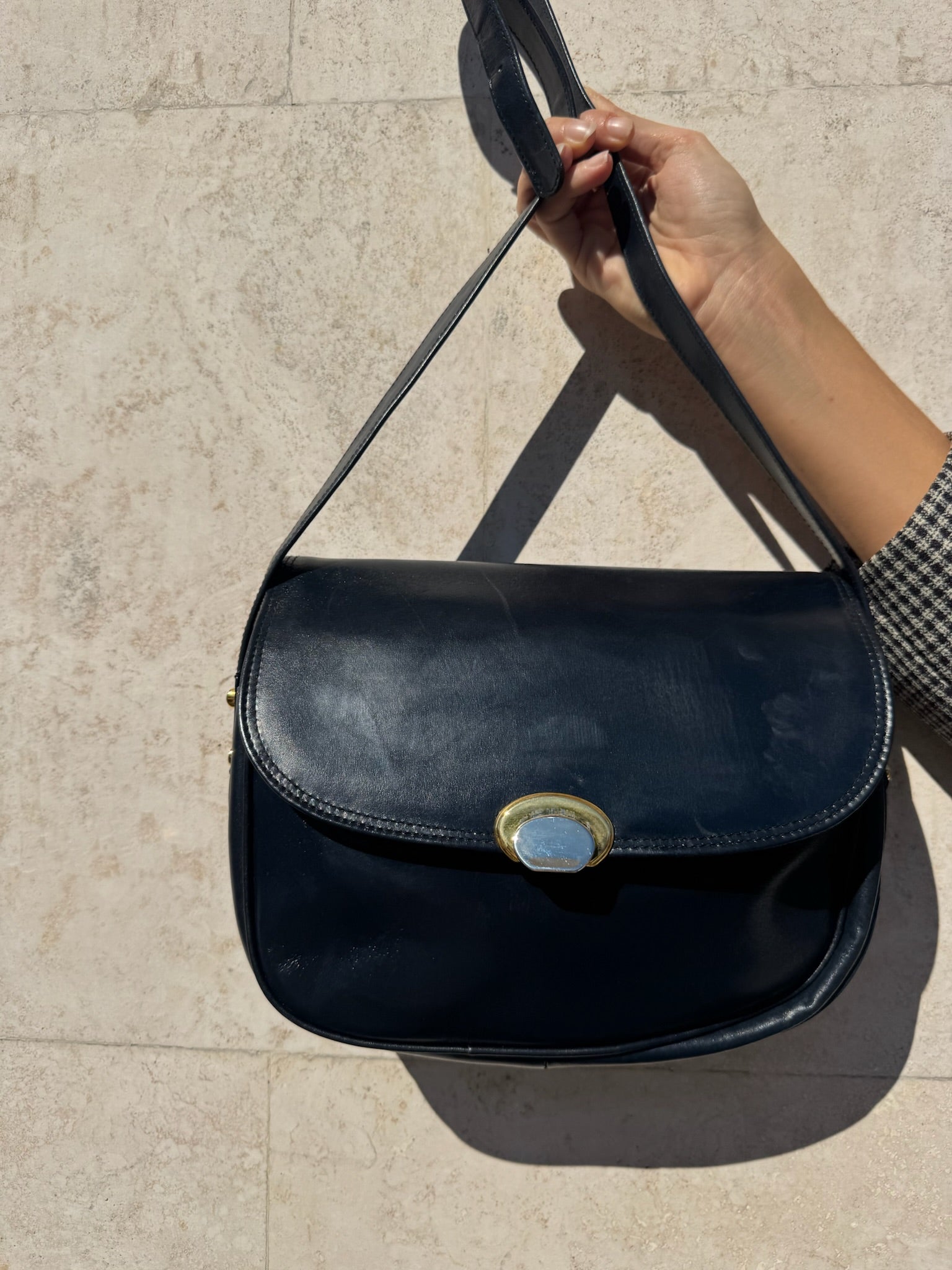 Borsa vintage a tracolla in in pelle, caratterizzata da una linea pulita e compatta. La patta dai Latin arrotondati porta una chiusura con pasta e da un bottone metallico dorato. La tracolla regolabile permette di portarla sia a spalla che a tracolla. Internamente ha doppio scomparto e tasca con zip.