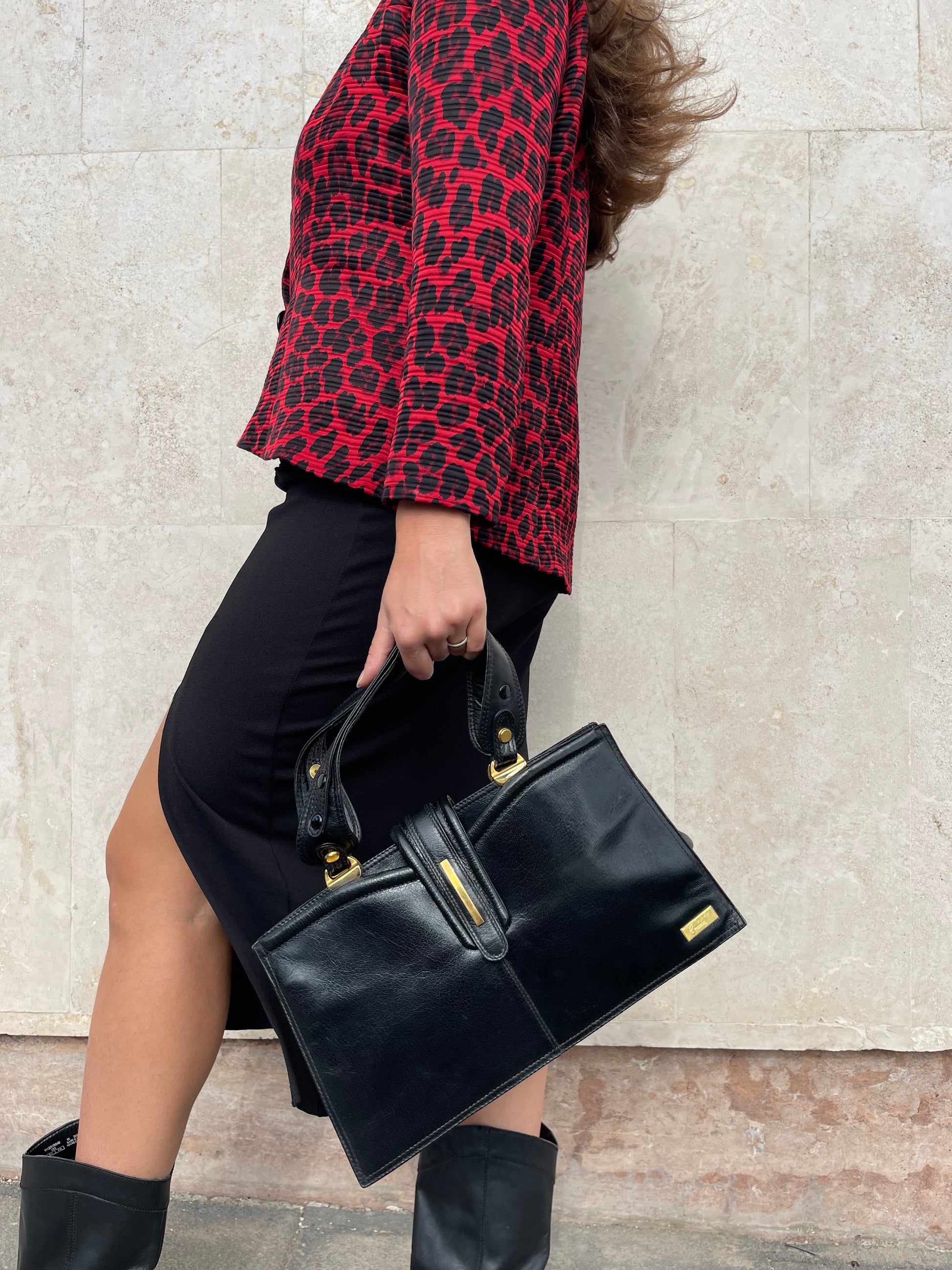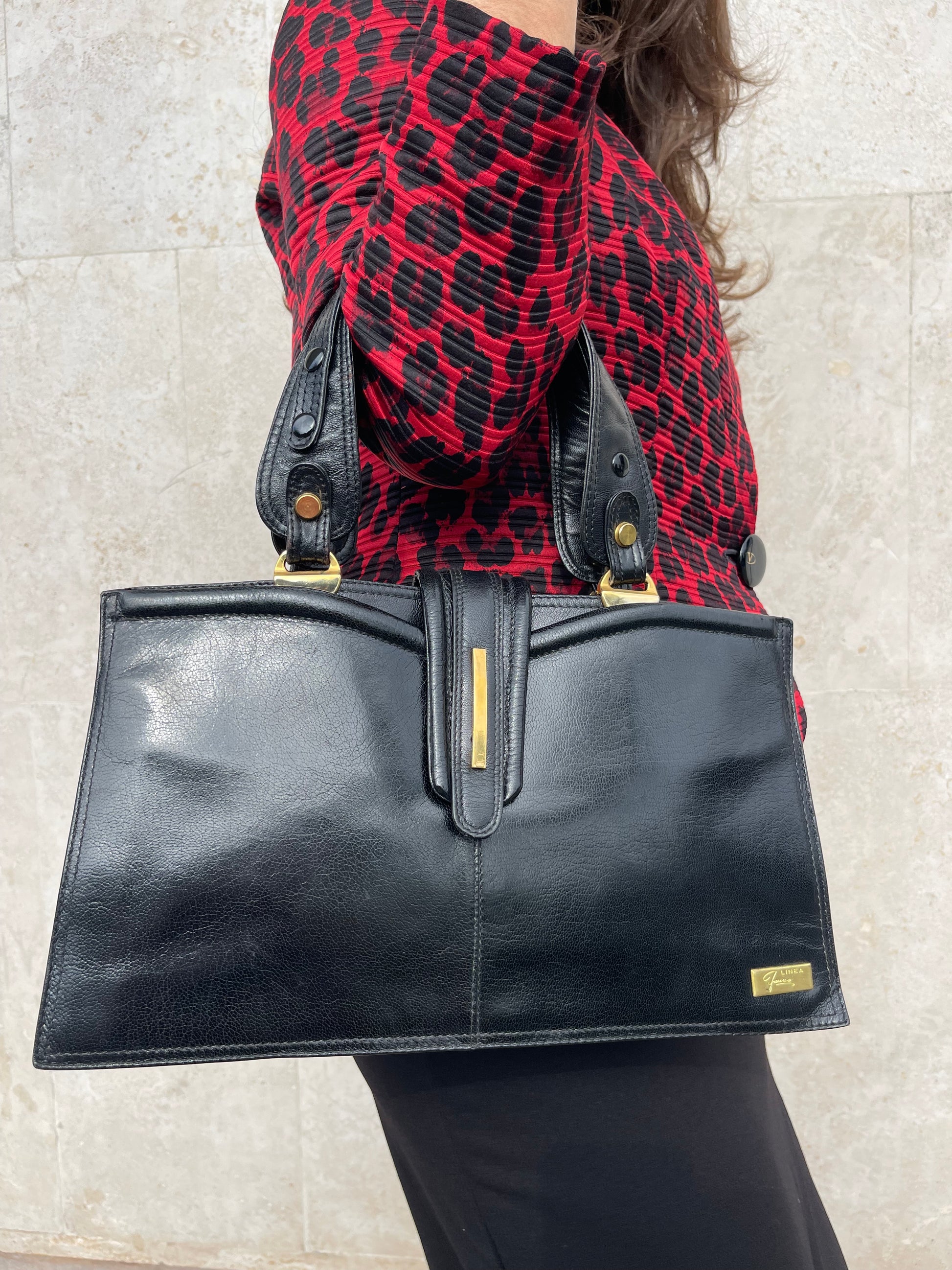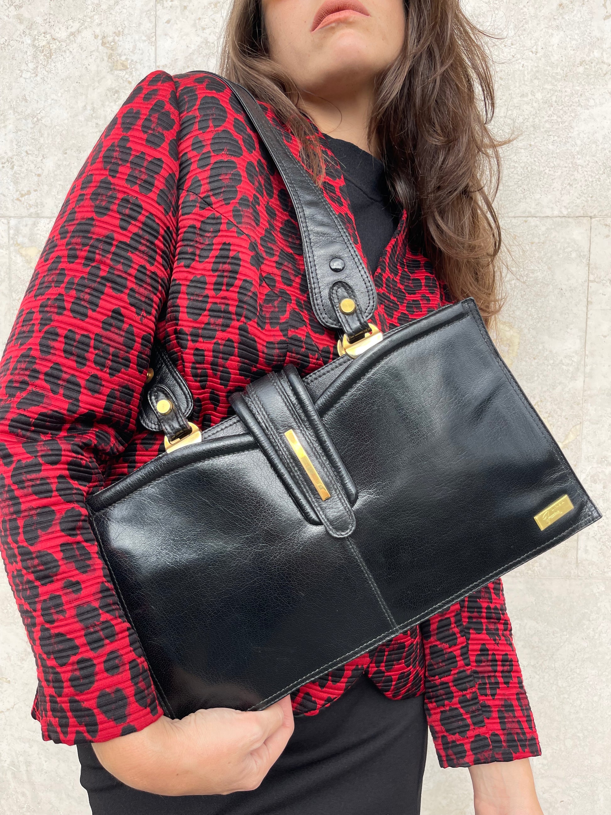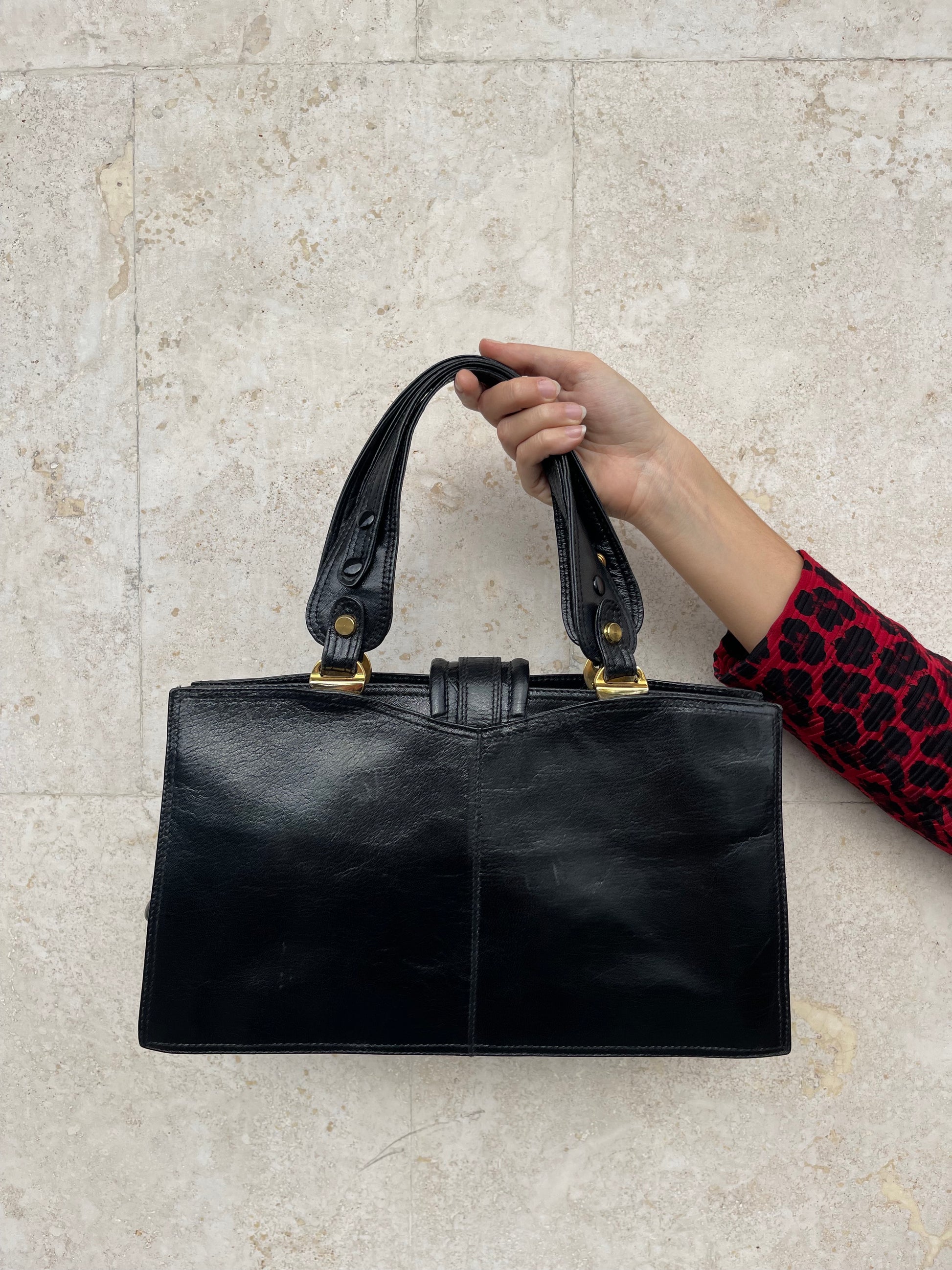 Borsa in vera pelle nera vintage con doppi manici allungabili così da renderla più versatile.