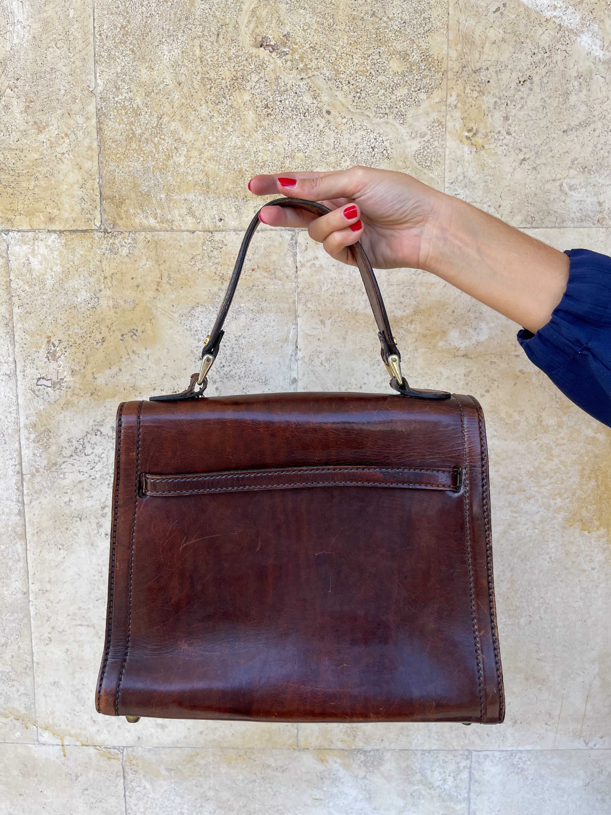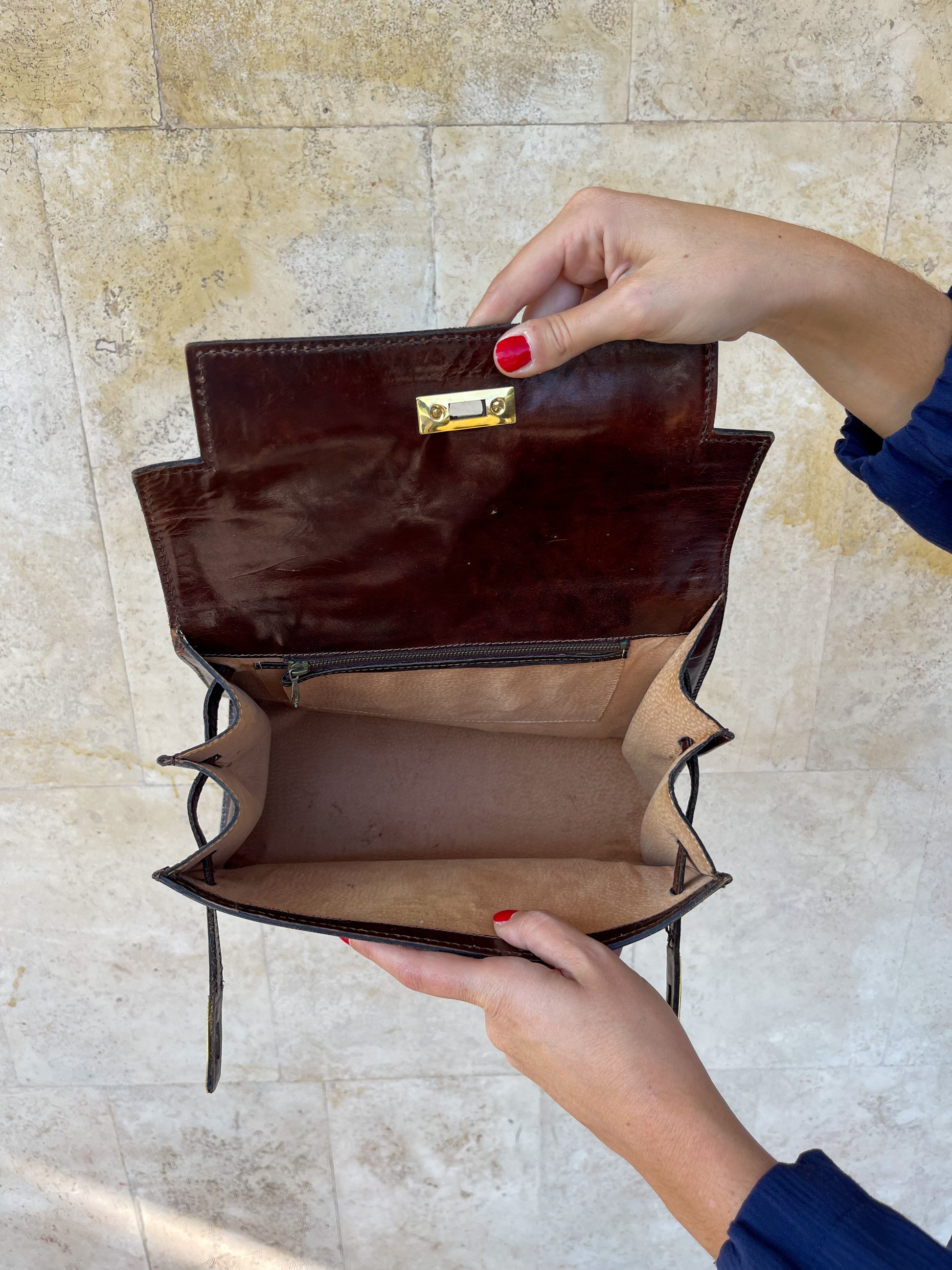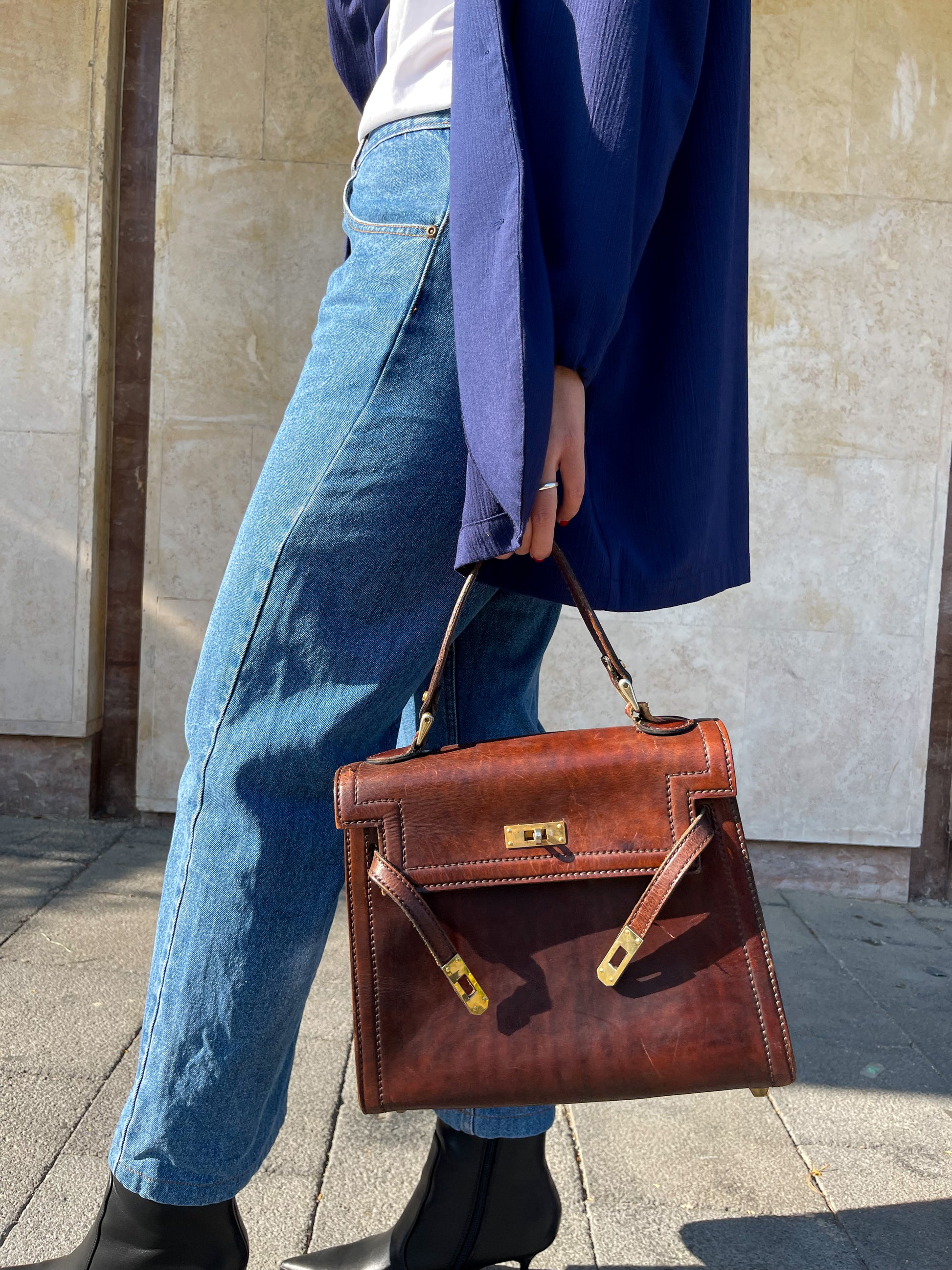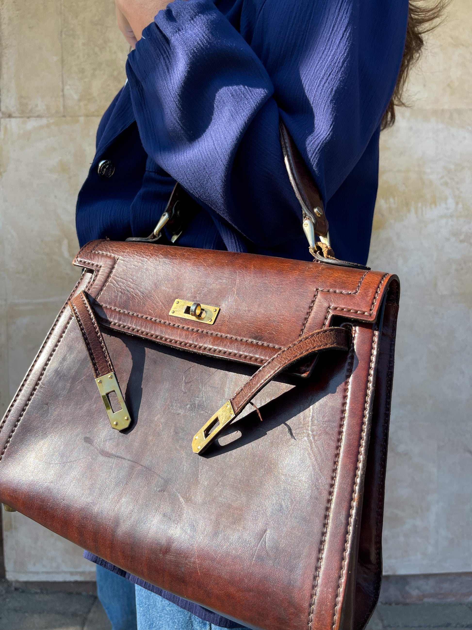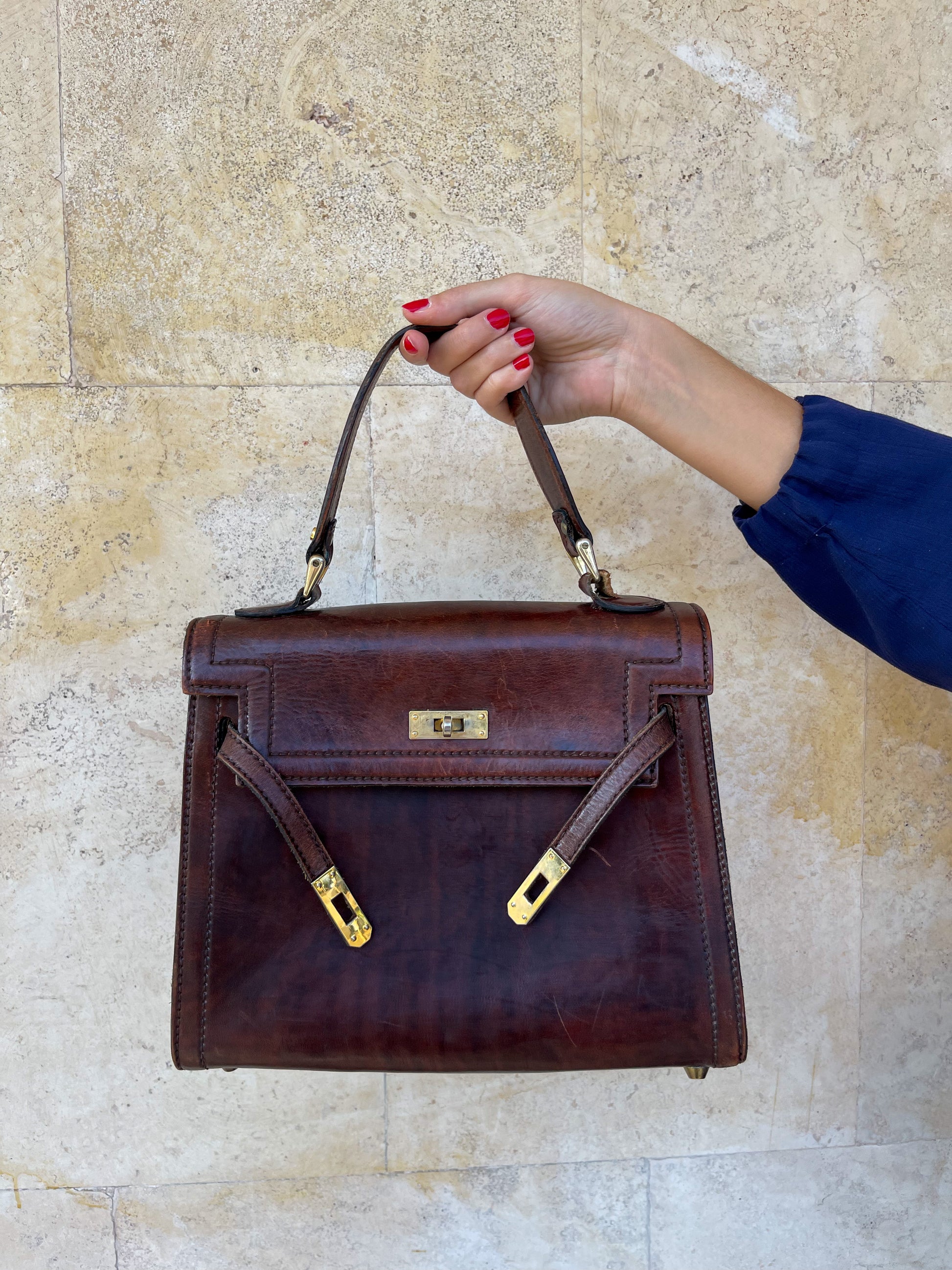 Borsa vintage ispirata all’intramontabile Kelly in vera pelle marrone. A mano, scomparto unico, tasca interna con zip e chiusura girello. Possibilità di aggiungere una tracolla e leggero difetto su parte in pelle vicino al manico