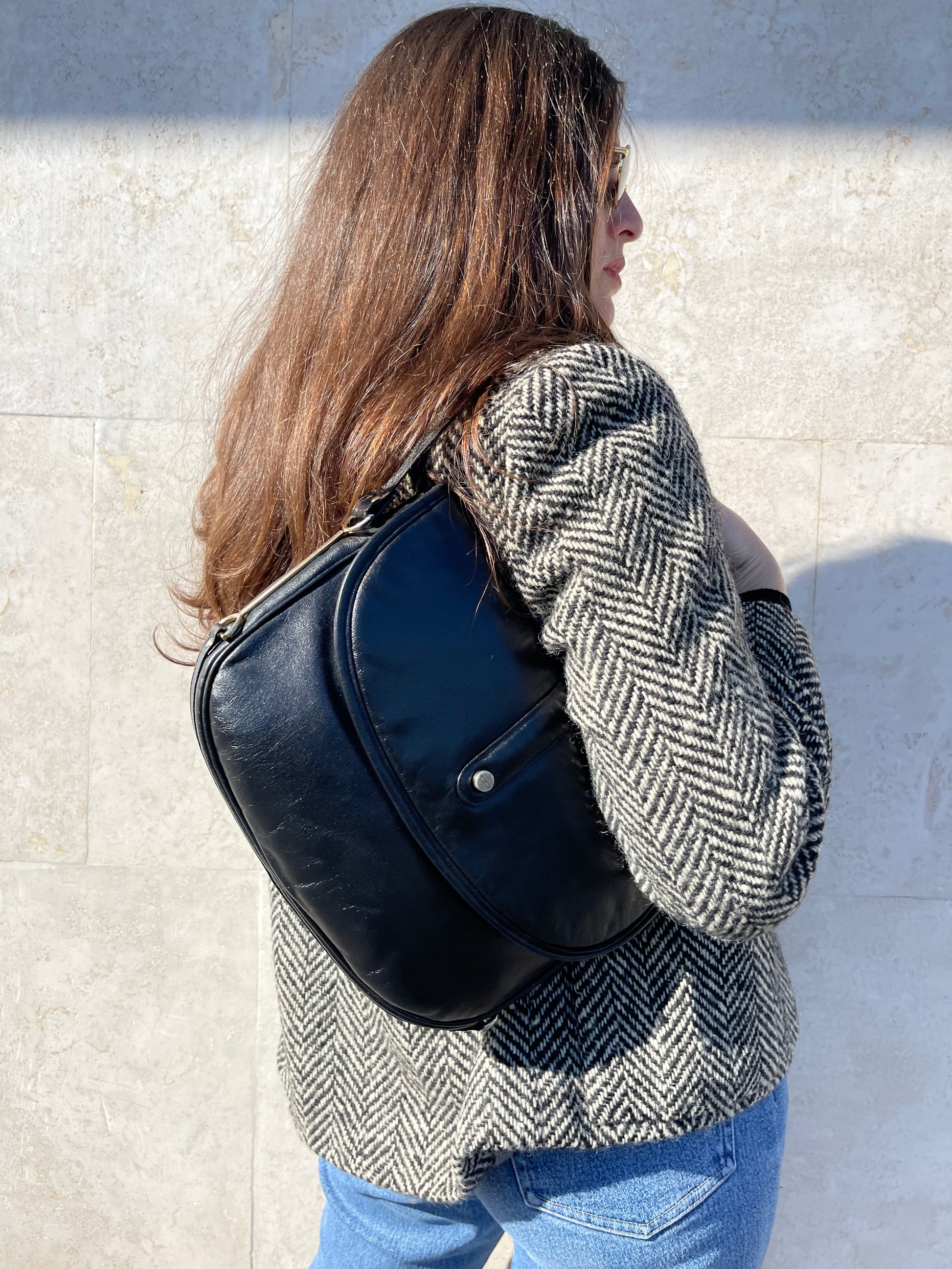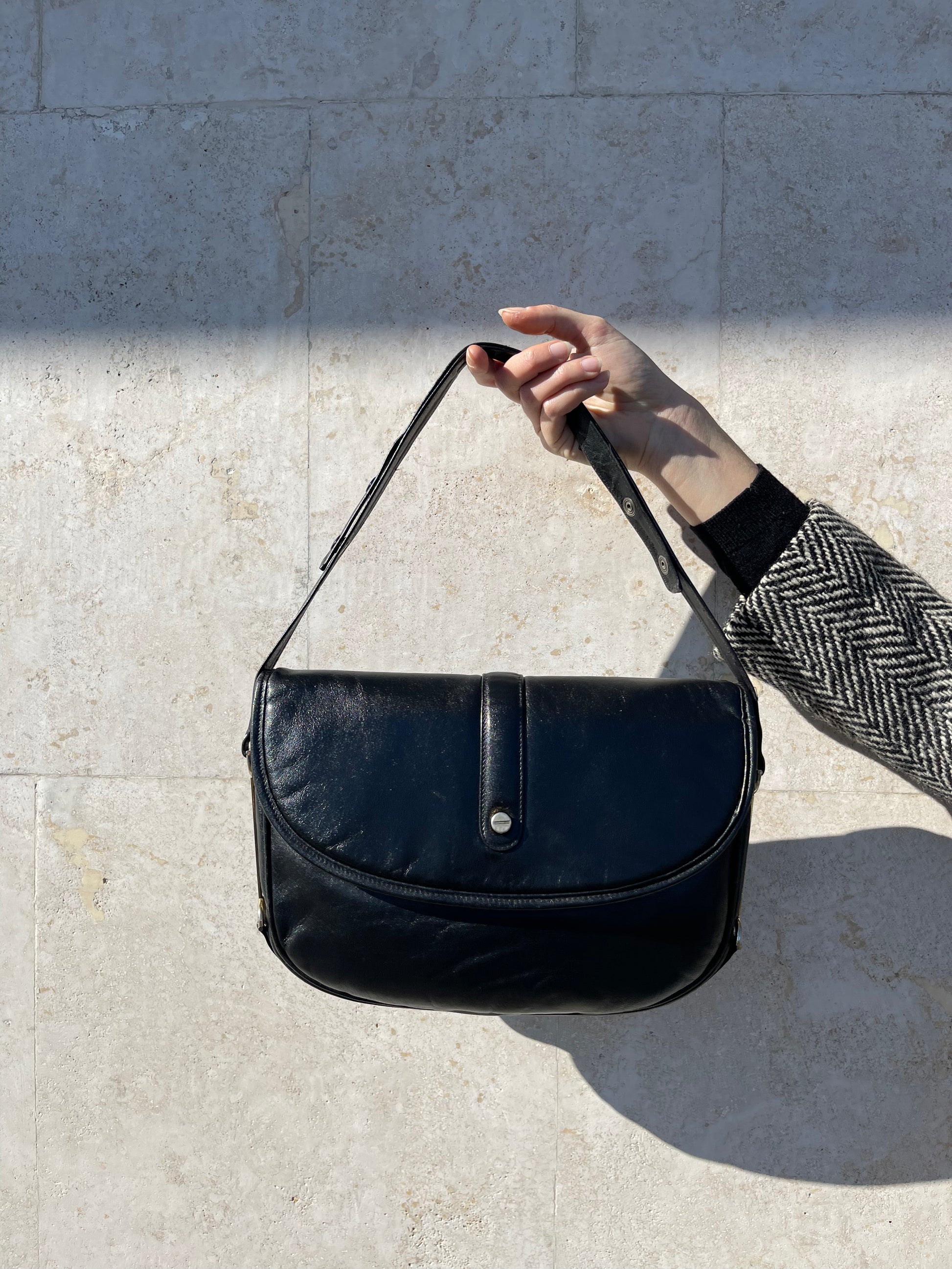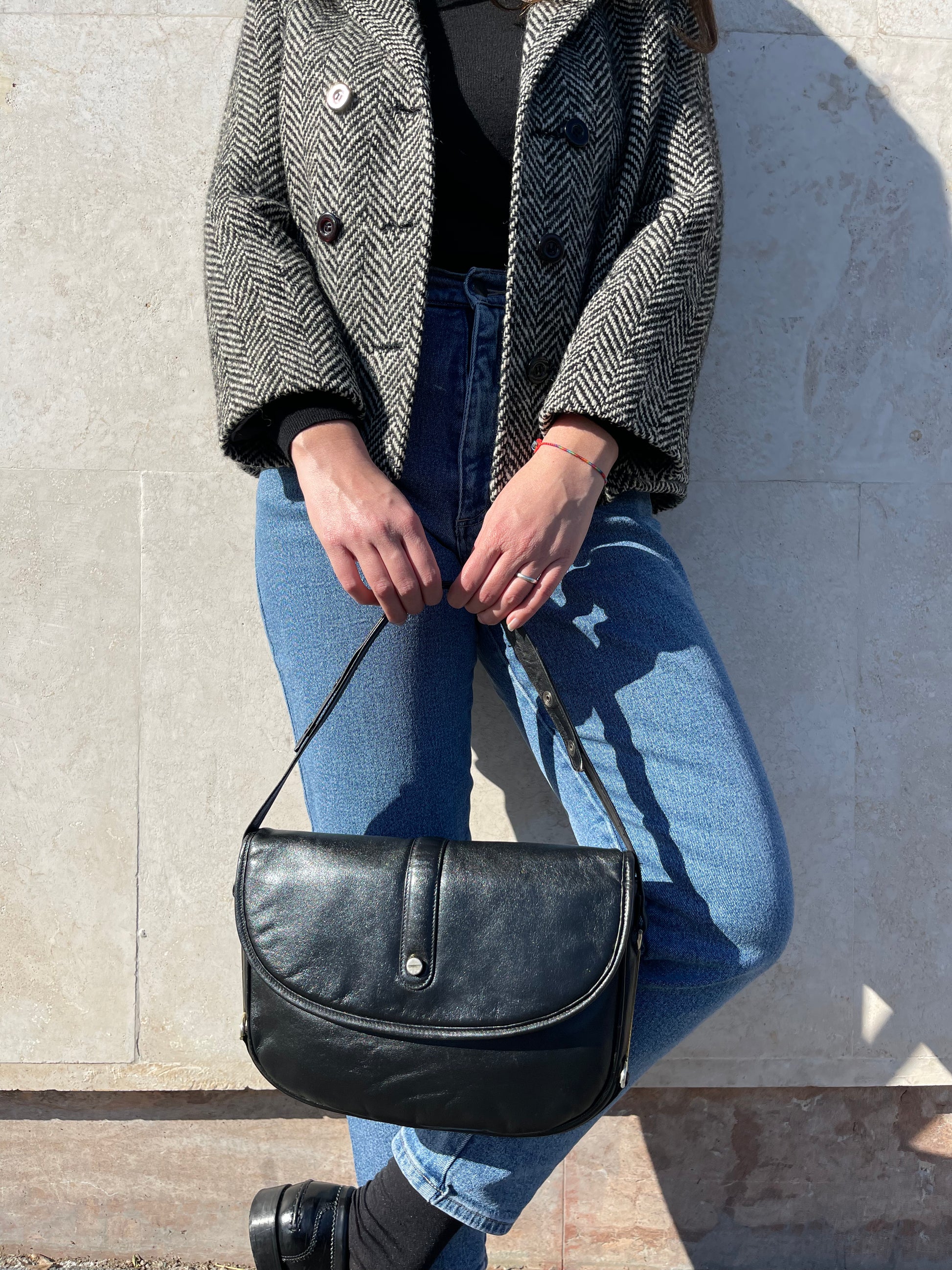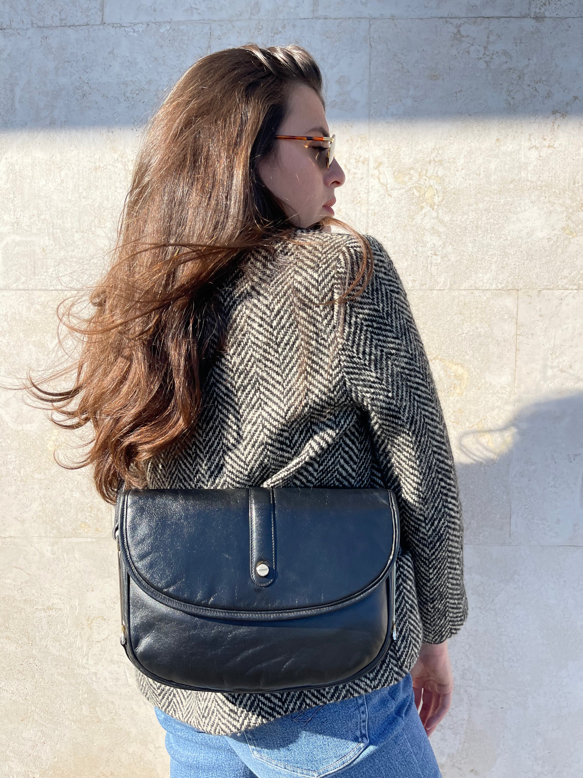 Borsa vintage in vera pelle nera con due scomparti interni, tasca interna con zip e chiusura con patta.
