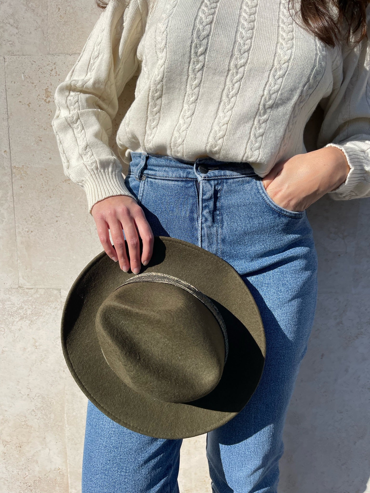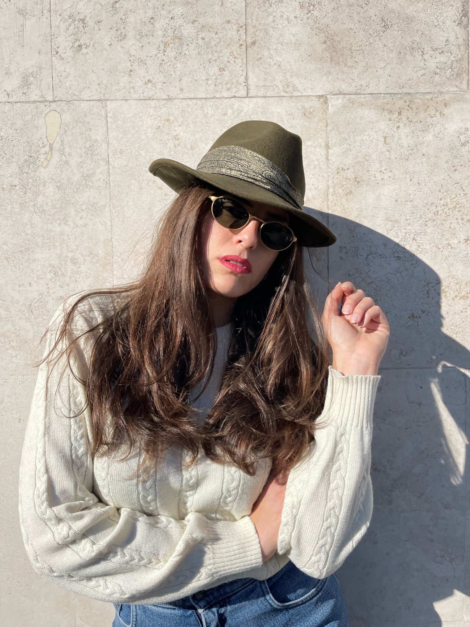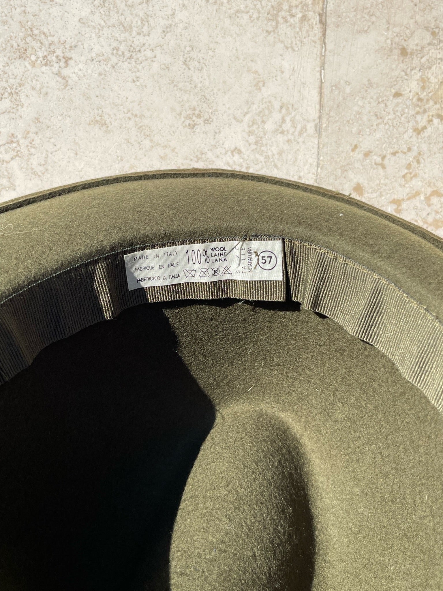 Cappello verde kaki a falda larga con un nastro con effetto damascato tono su tono, cucito alla base. Di tendenza e perfetto per qualsiasi look!