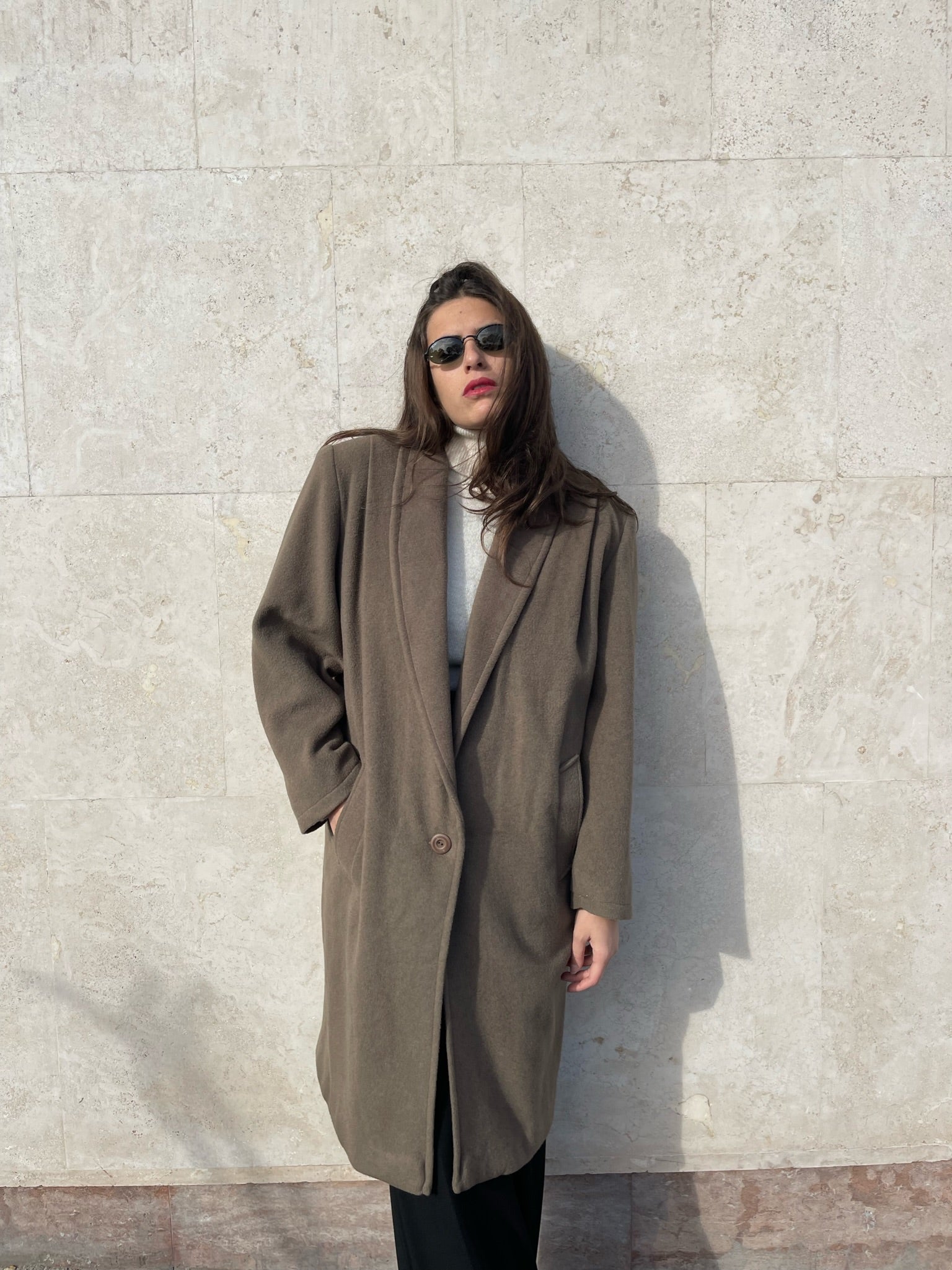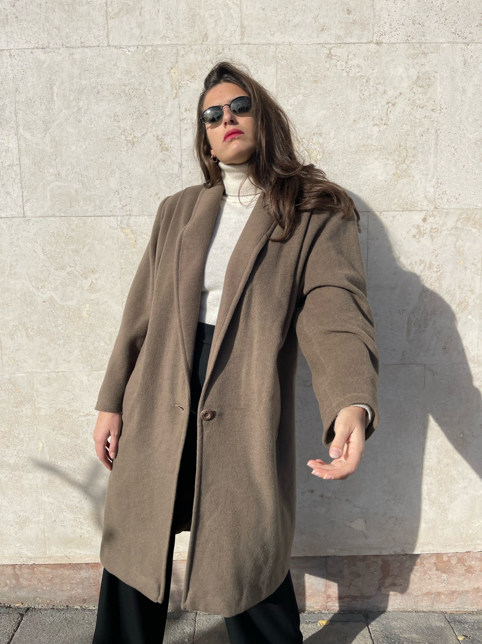 Cappotto beige monopetto con spalline e unico bottone come chiusura, revers sciallato e tasche laterali.