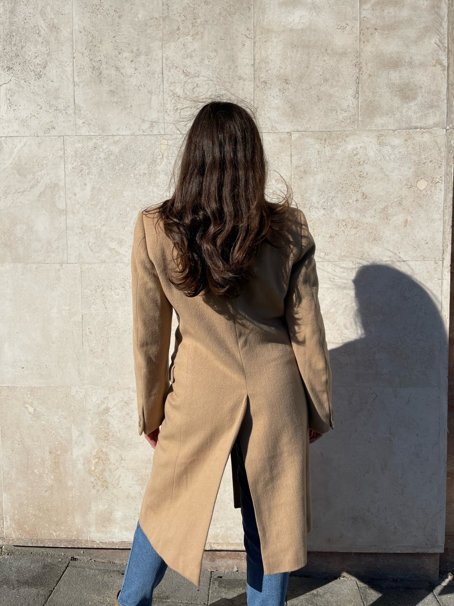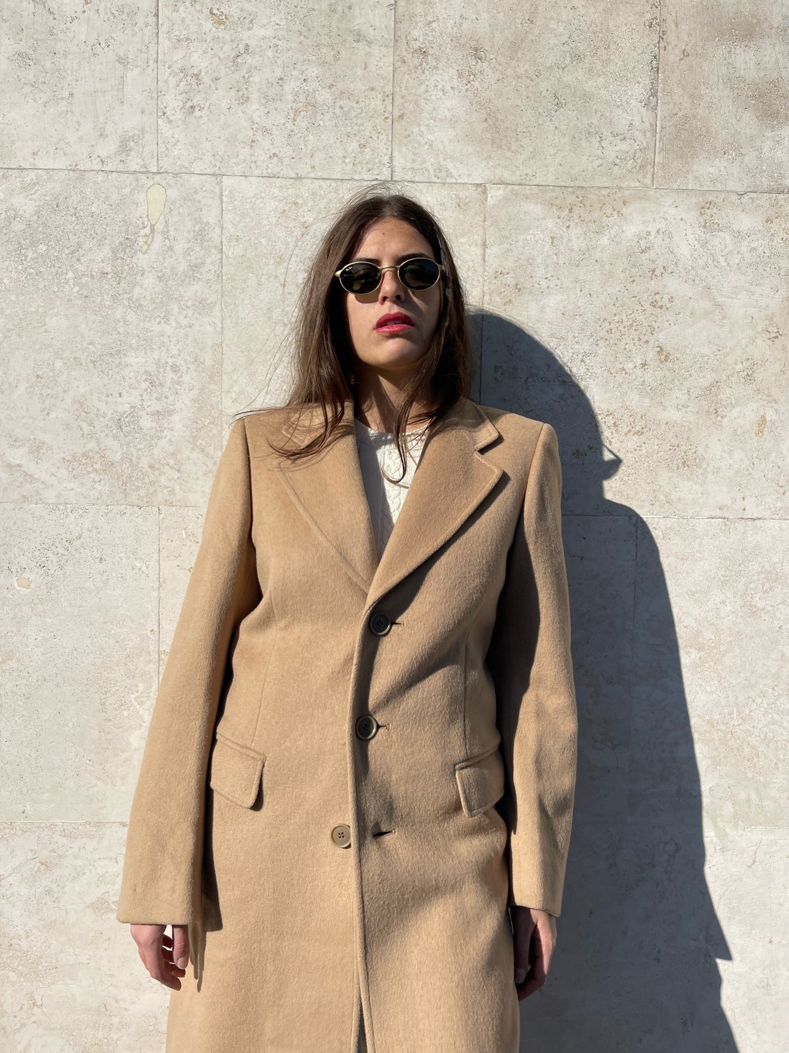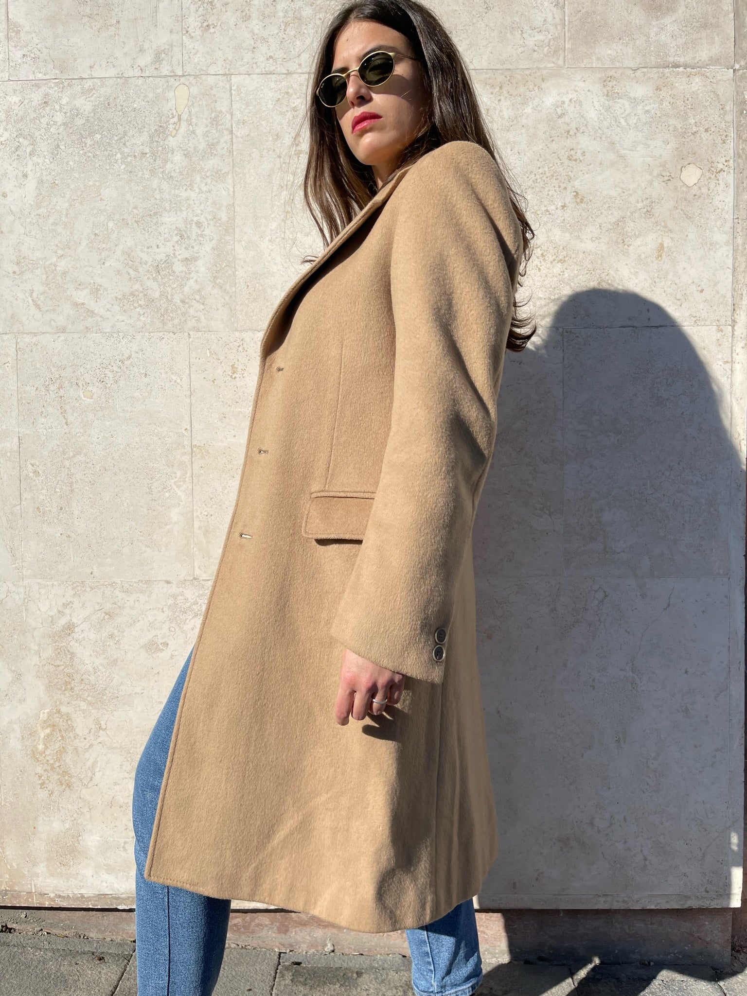 Cappotto cammello monopetto con spalline dal taglio classico e dritto, caldo e femminile con tasche frontali con patta e bavero classico.