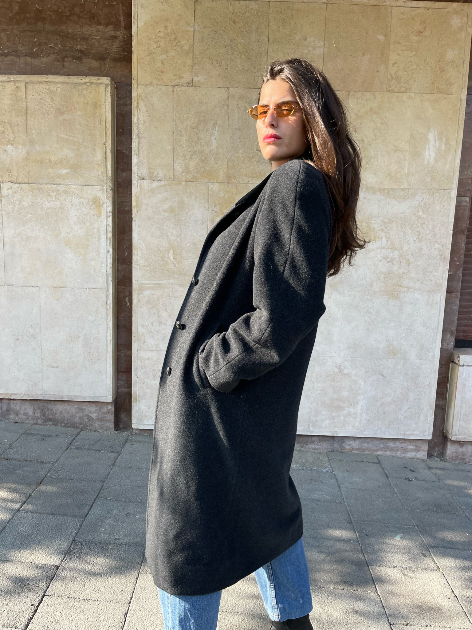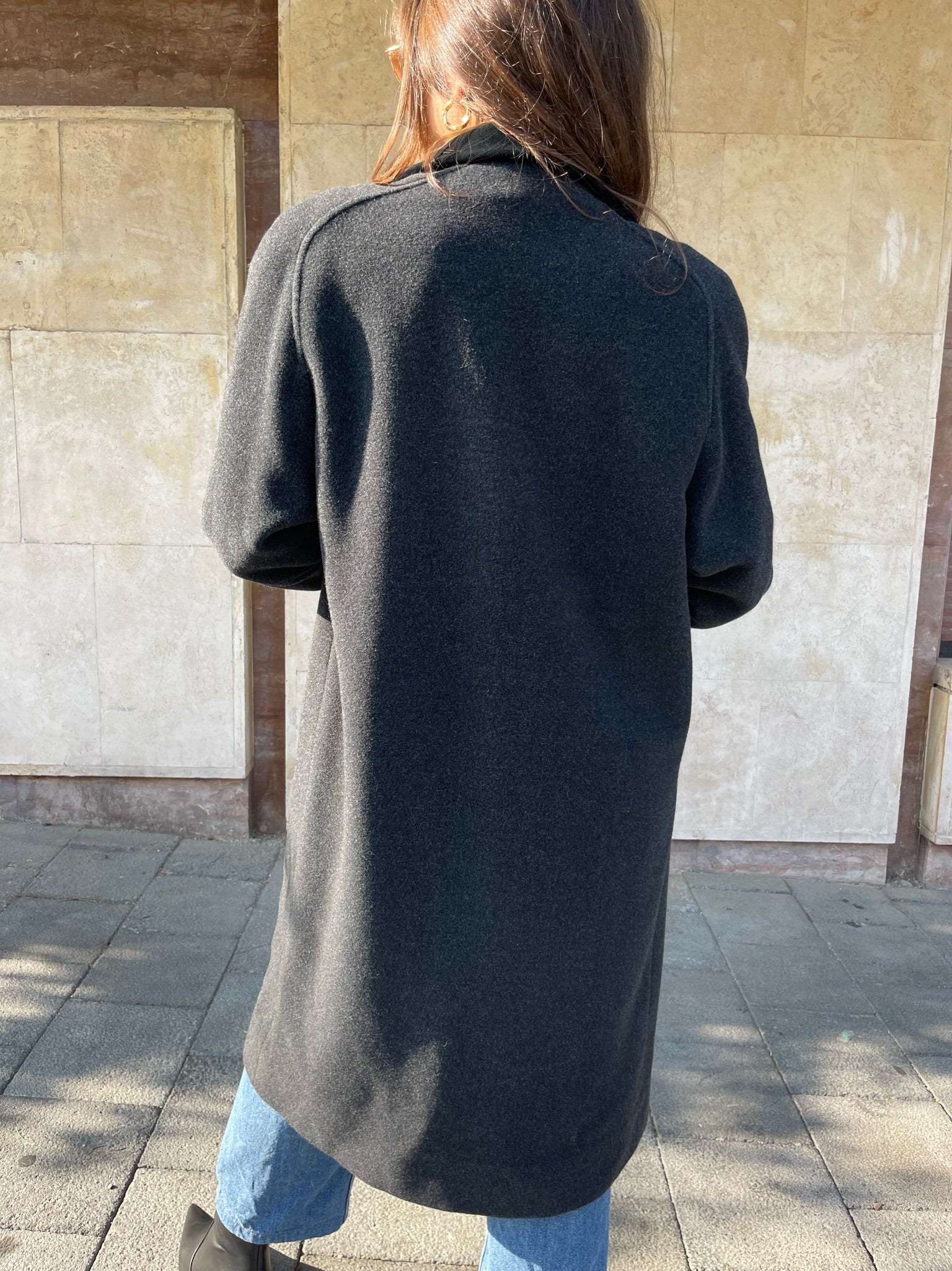 Cappotto lungo morbido grigio con spalline in 100% pura lana vergine; crea contrasto con il colore del capo, il velluto nero del colletto. Tasche laterali e chiusura bottoni.