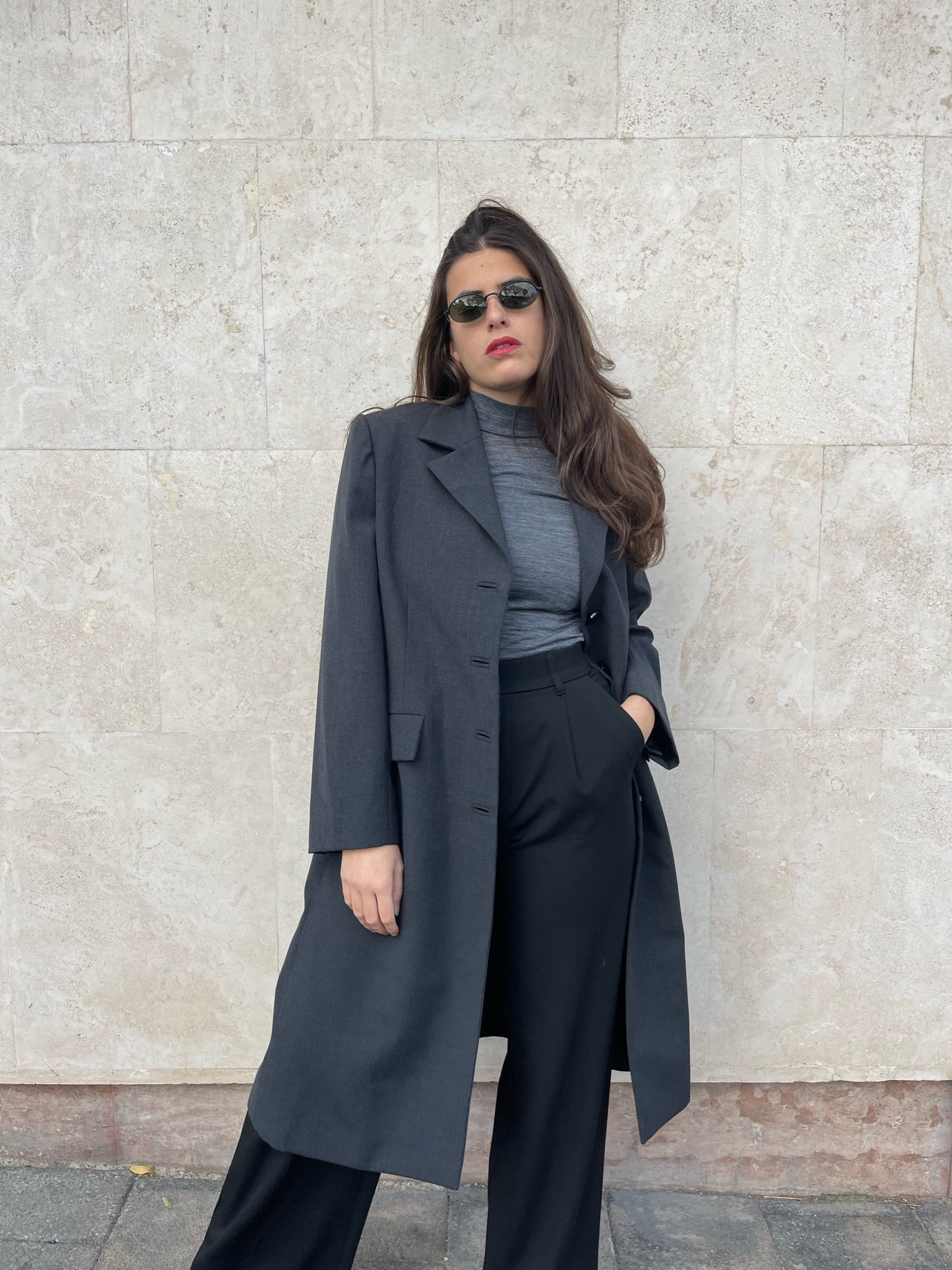 Cappotto grigio melange dall'elegante taglio maschile e, con bottoni scuri e classici. Tasche leterali con patta.
