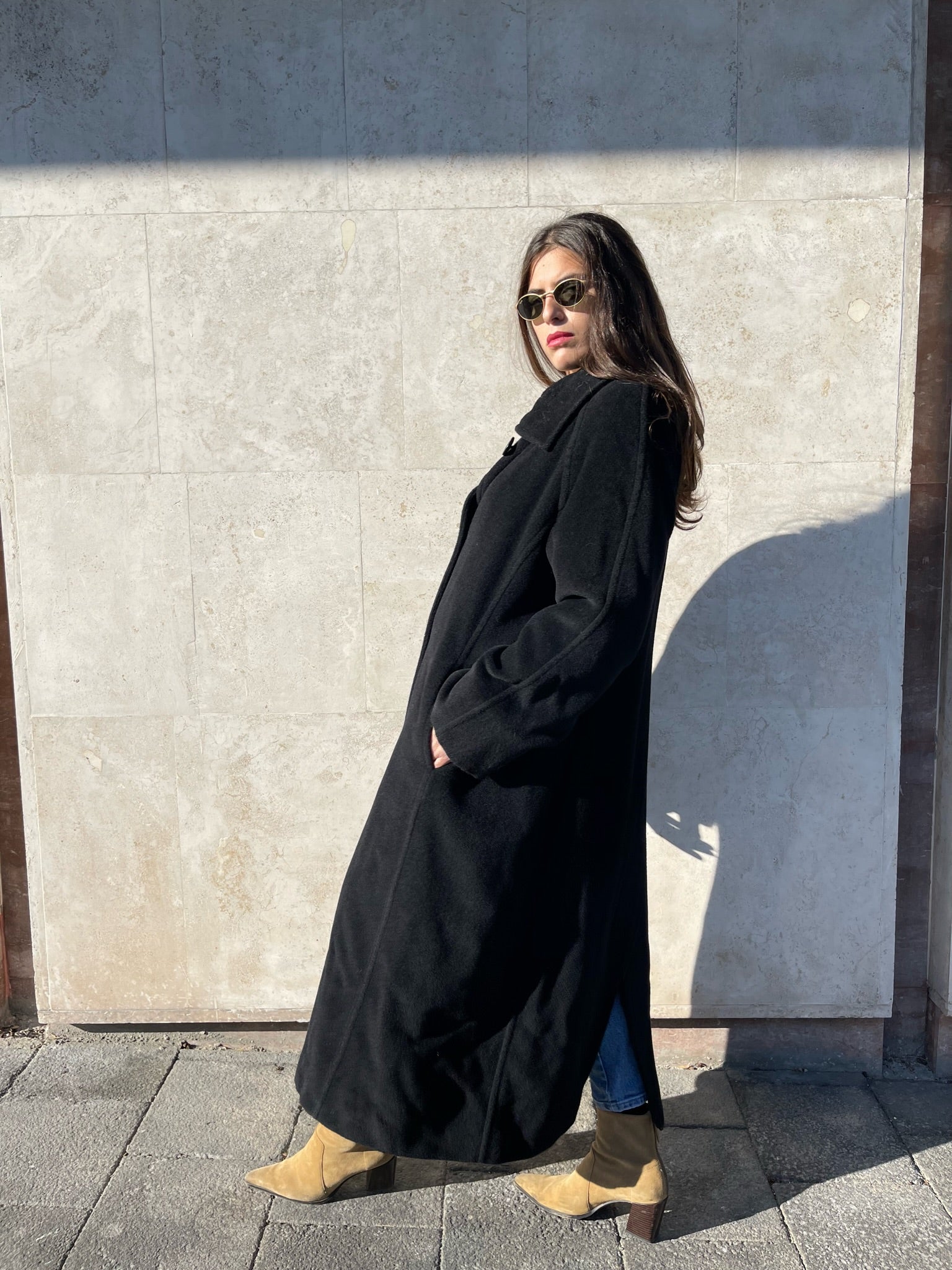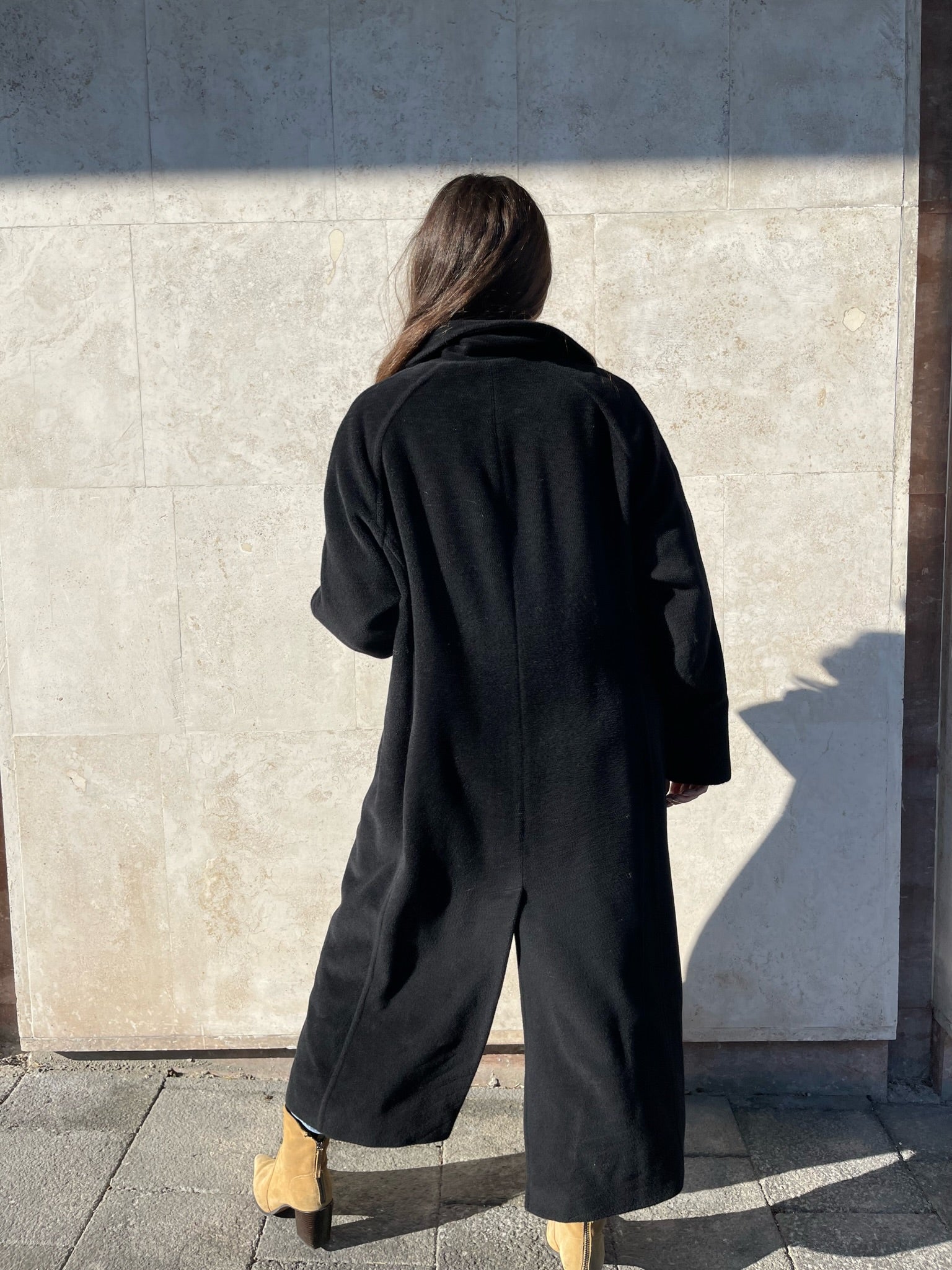 Cappotto nero lungo monopetto in pura lana vergine con manica raglan e tasche laterali senza patta. Vestibilità morbida e super caldo!