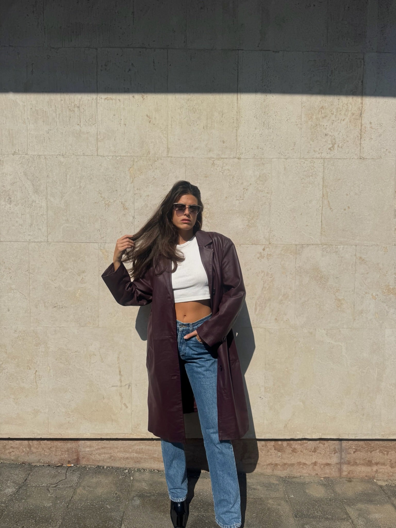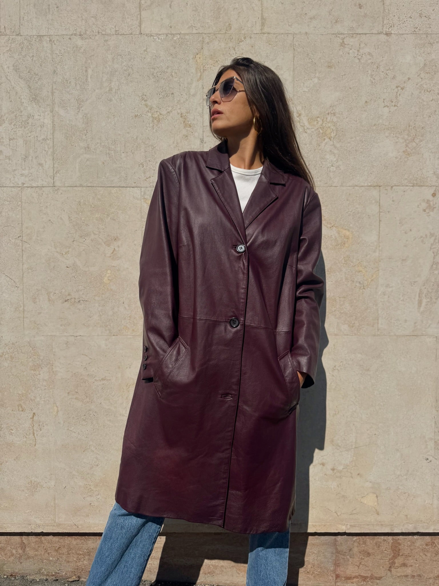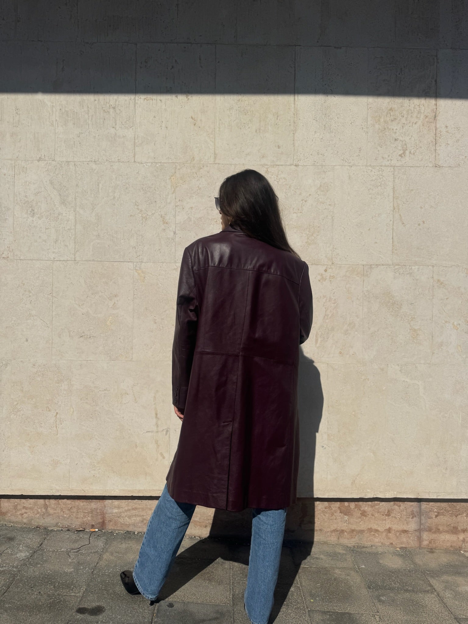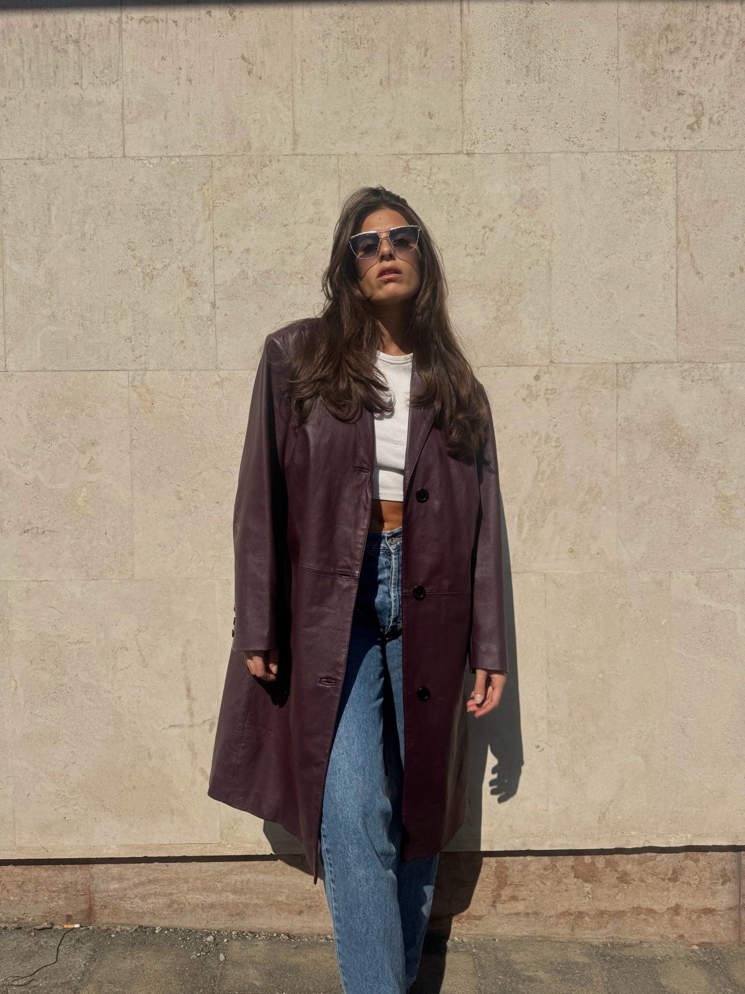 Cappotto in pelle vintage lungo color prugna/viola, dalla finitura liscia con una leggera lucentezza. Ha taglio dritto e leggermente oversize, spalle un po’ strutturate e revers classici a dente. La chiusura è monopetto con bottoni a vista; le tasche sono verticali a filetto e sui polsini si notano tre piccoli bottoni. Nell’insieme ha uno stile minimal anni ’90.