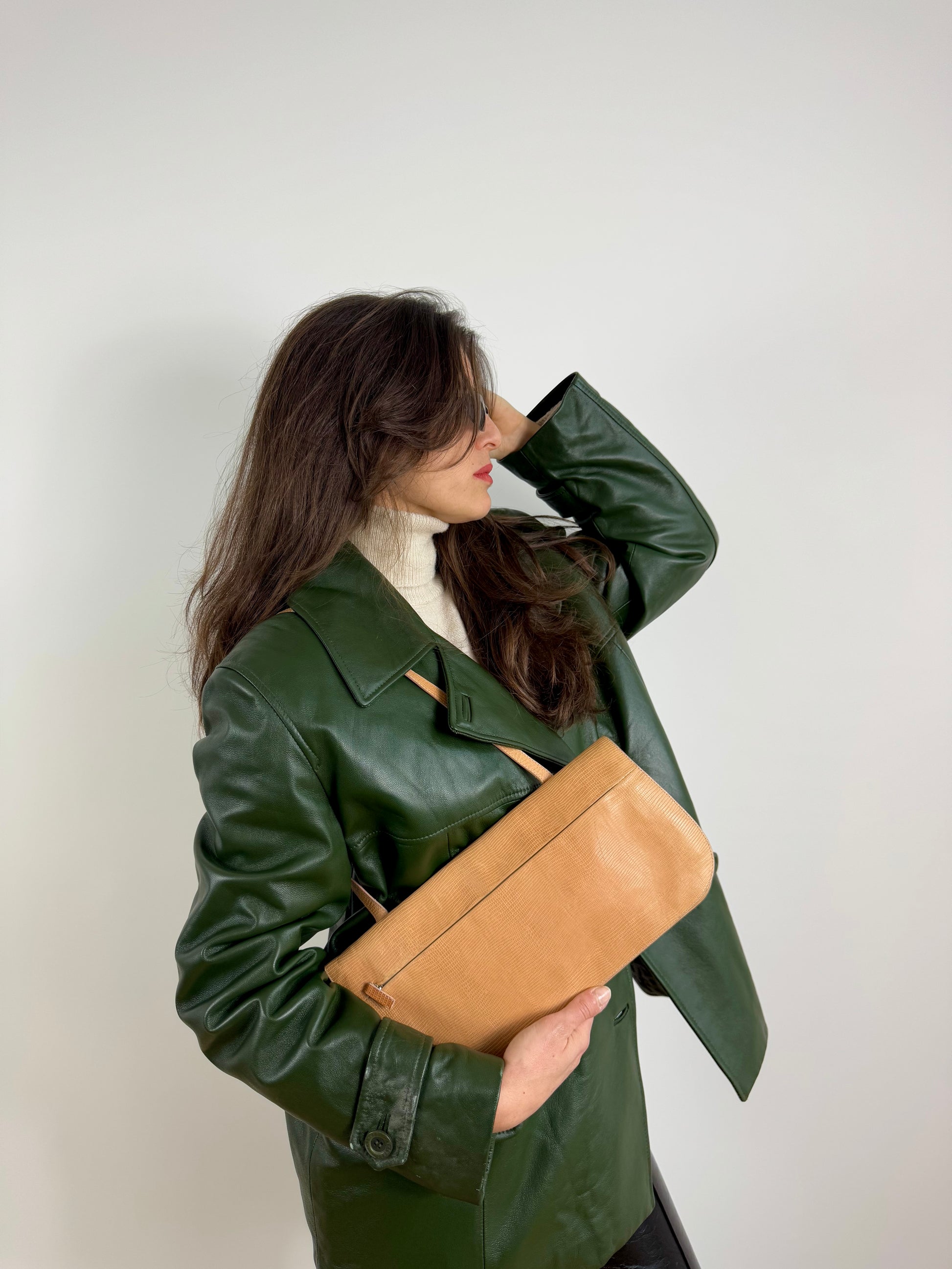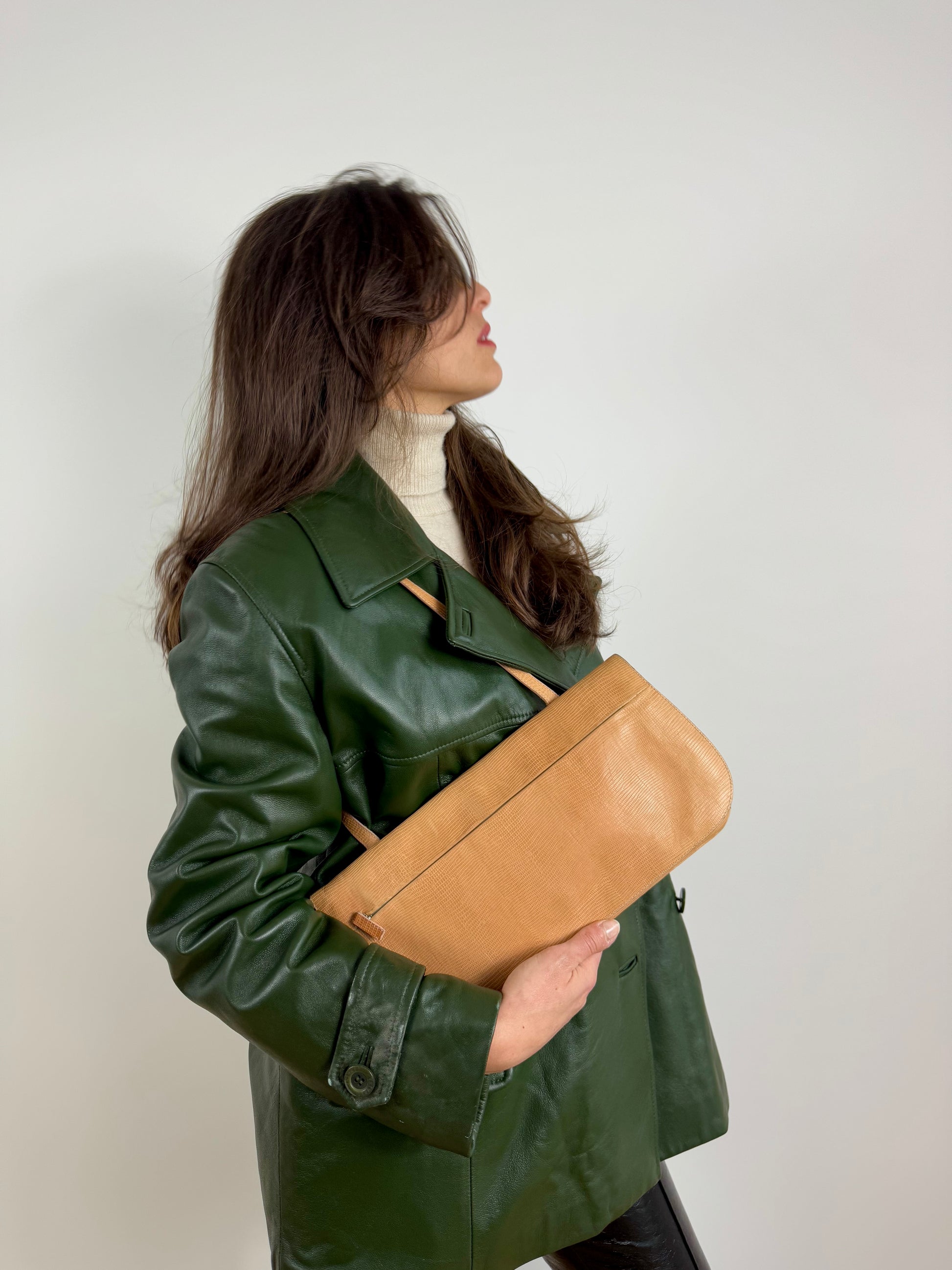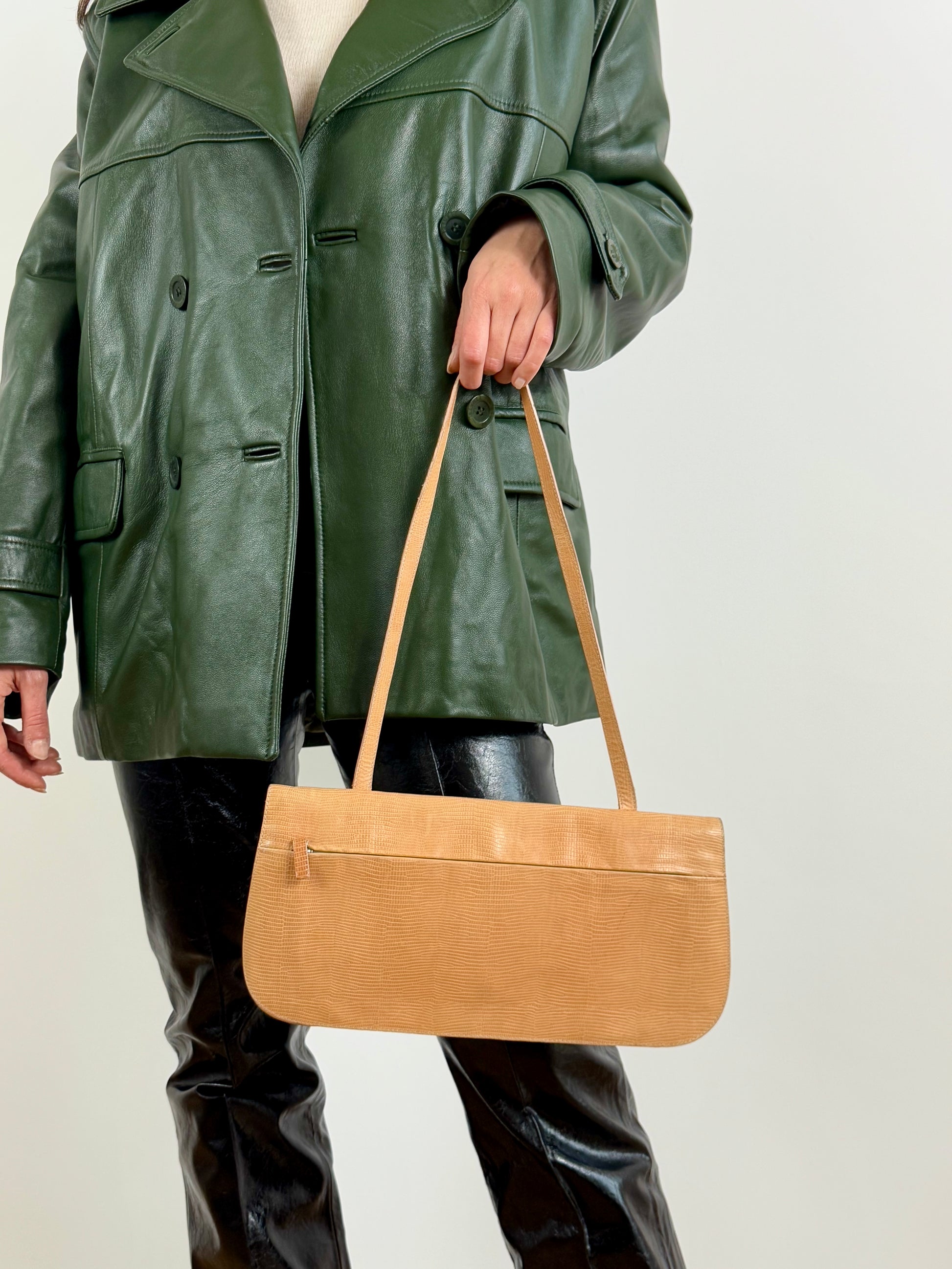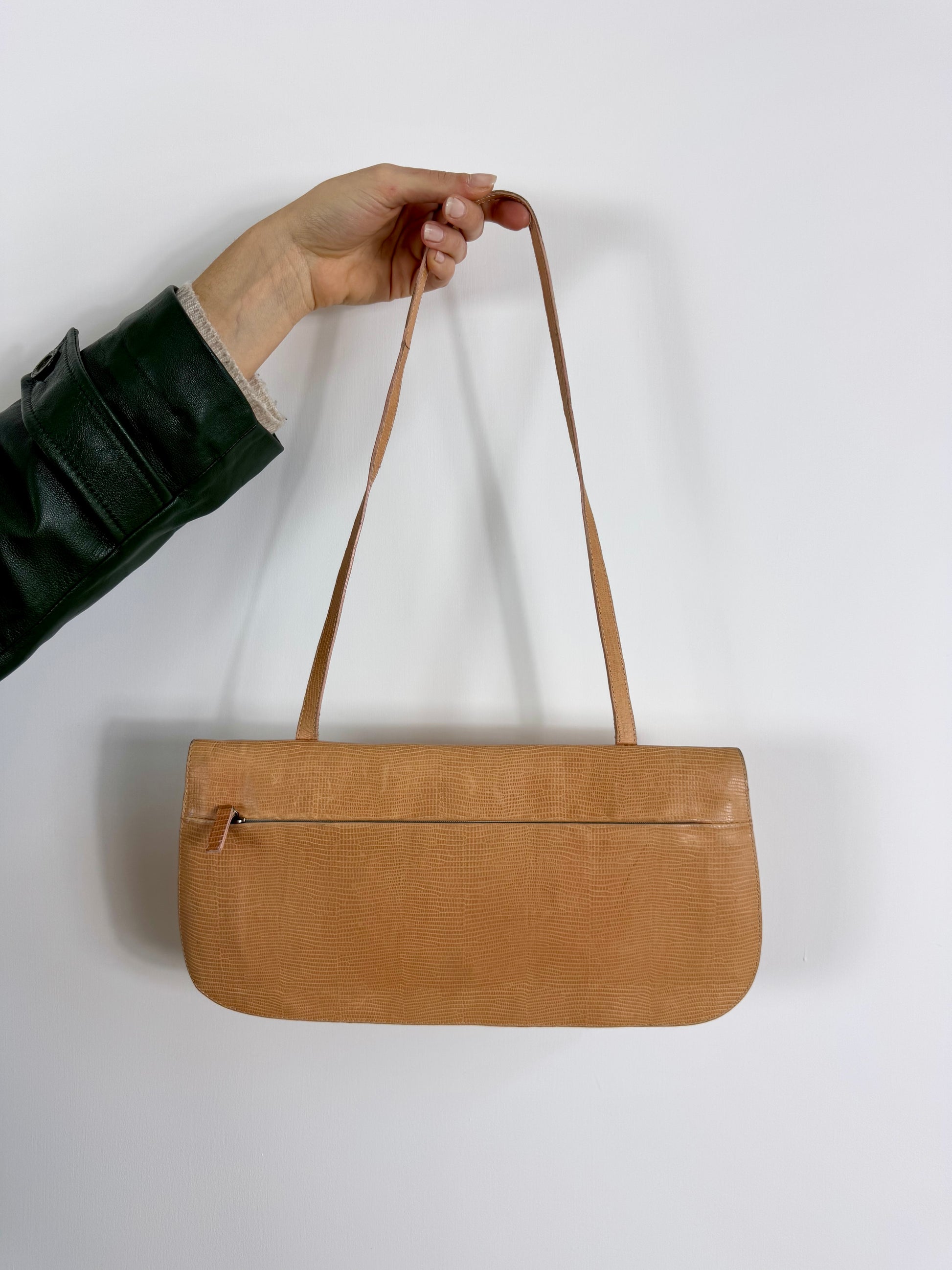 Borsa a spalla beige cammello chiaro con texture effetto lucertola, dal design rettangolare che richiama gli anni 90. Chiusura a scatto con patta frontale.