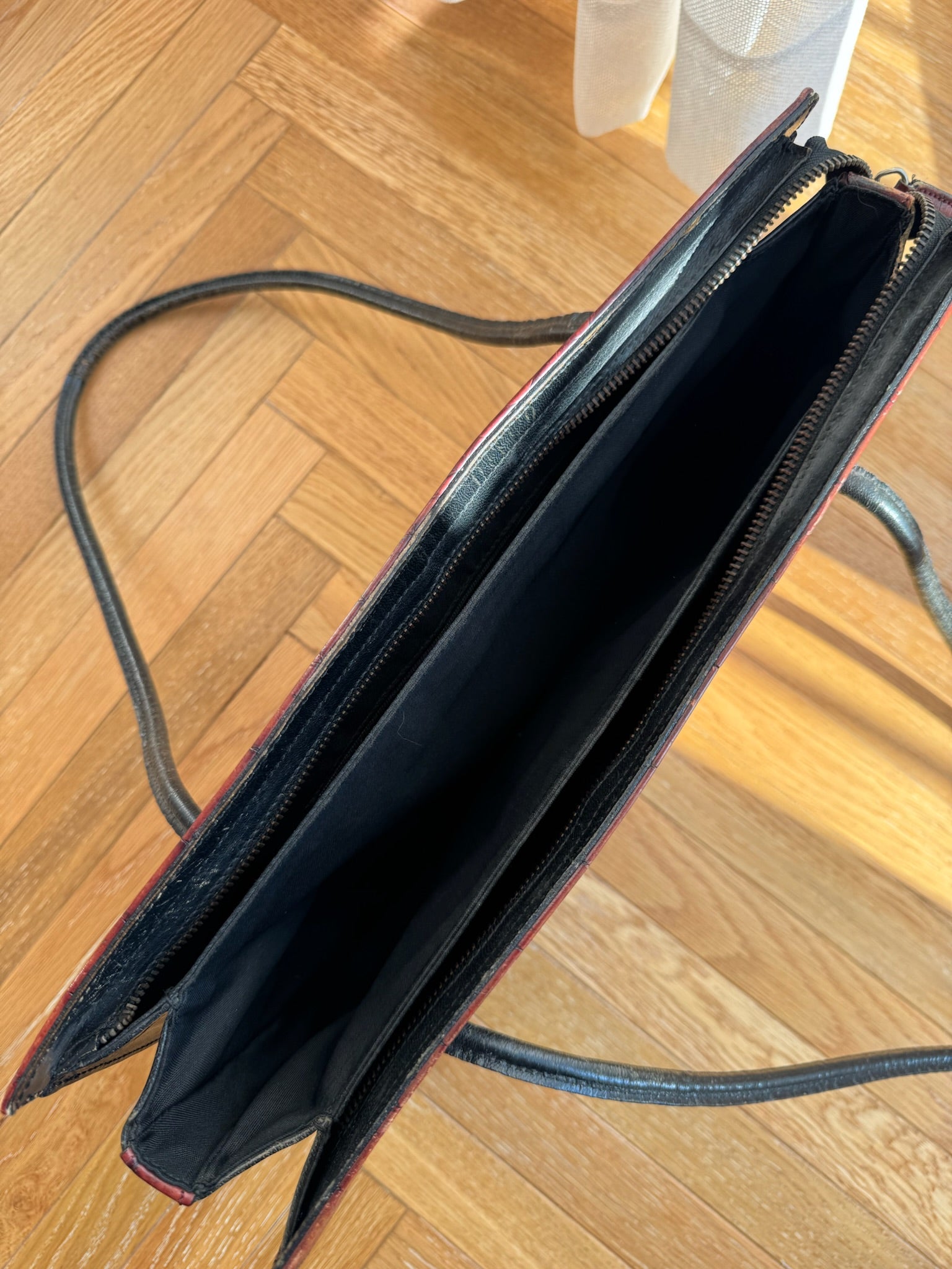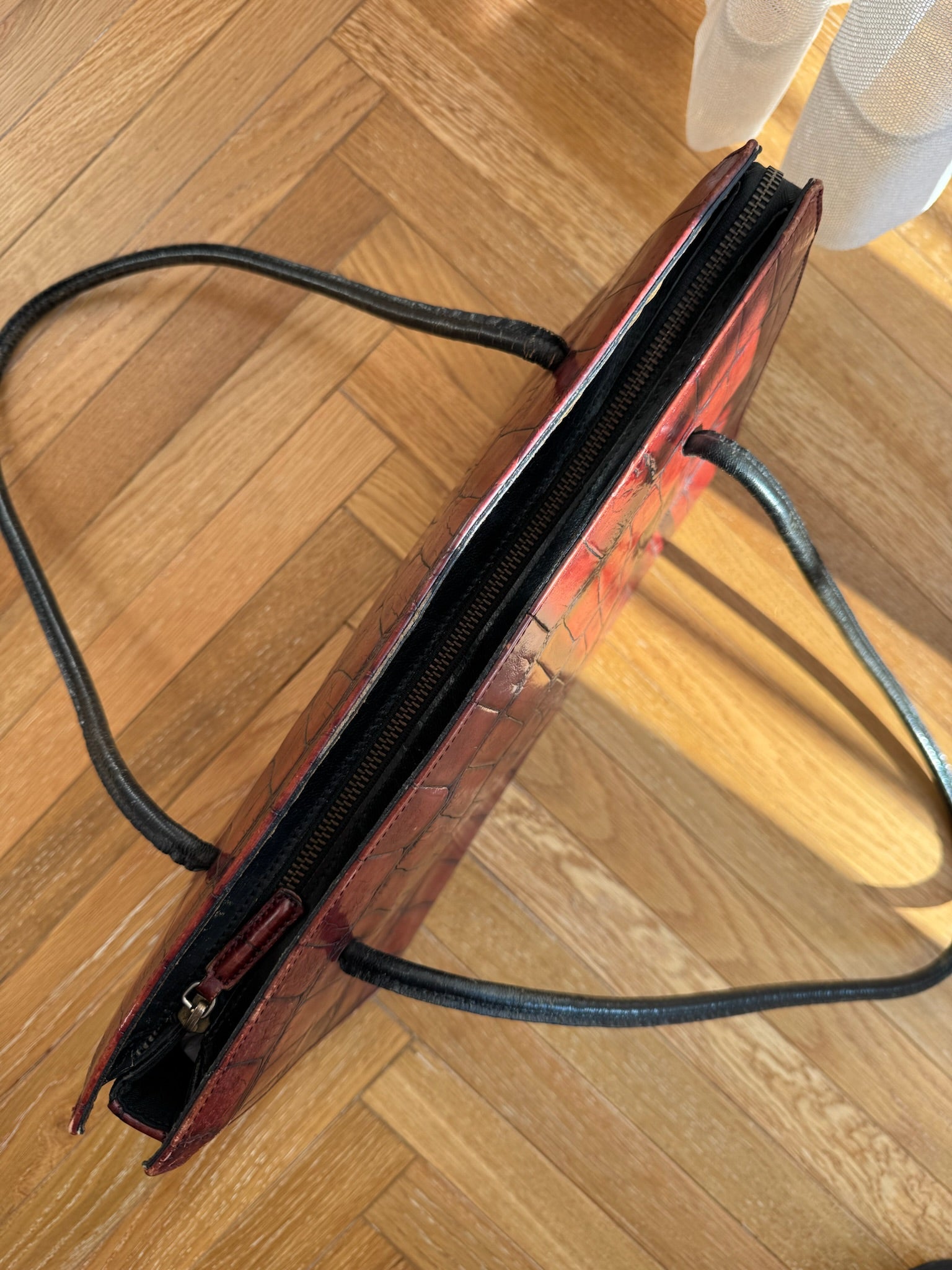 Borsa vintage in vera pelle croc effect con doppi manici neri per portarla a spalla
