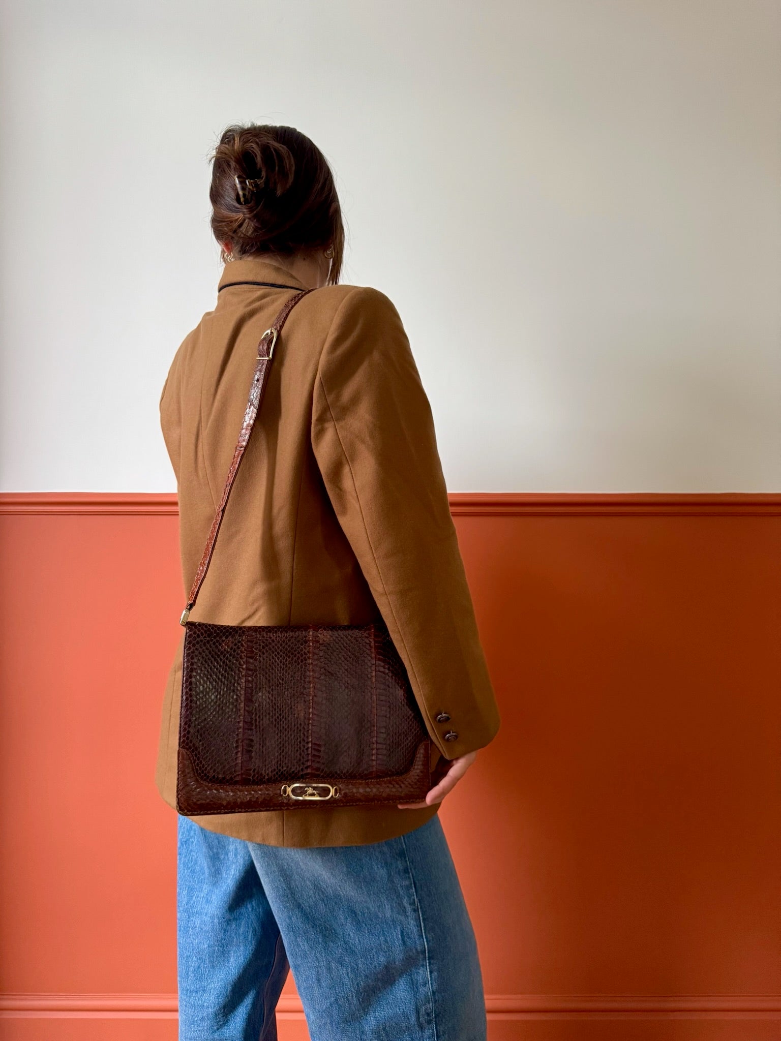 Borsa in vera pelle di pitone marrone con tracolla regolabile. Tre scomparti interni e tasca interna con zip.