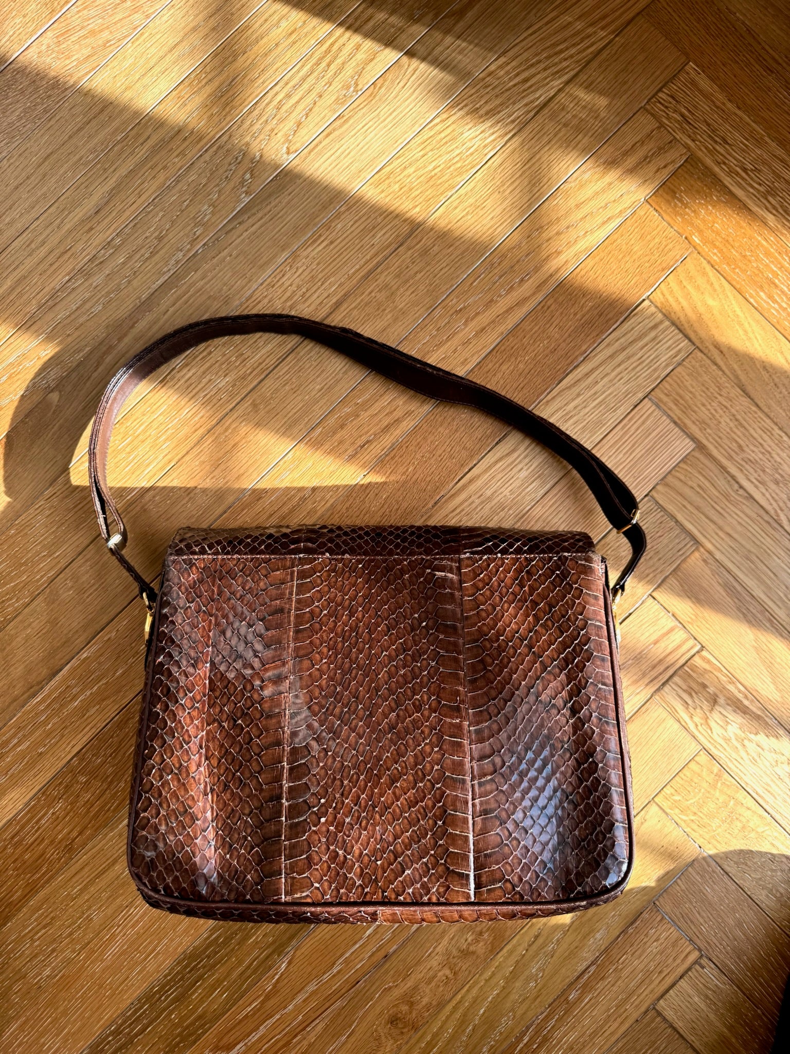 Borsa in vera pelle pitone marrone con tracolla regolabile per indossarla sia a spalla che a tracolla. Tre scomparti interni e tasca frontale. Chiusura frontale e dettagli in oro
