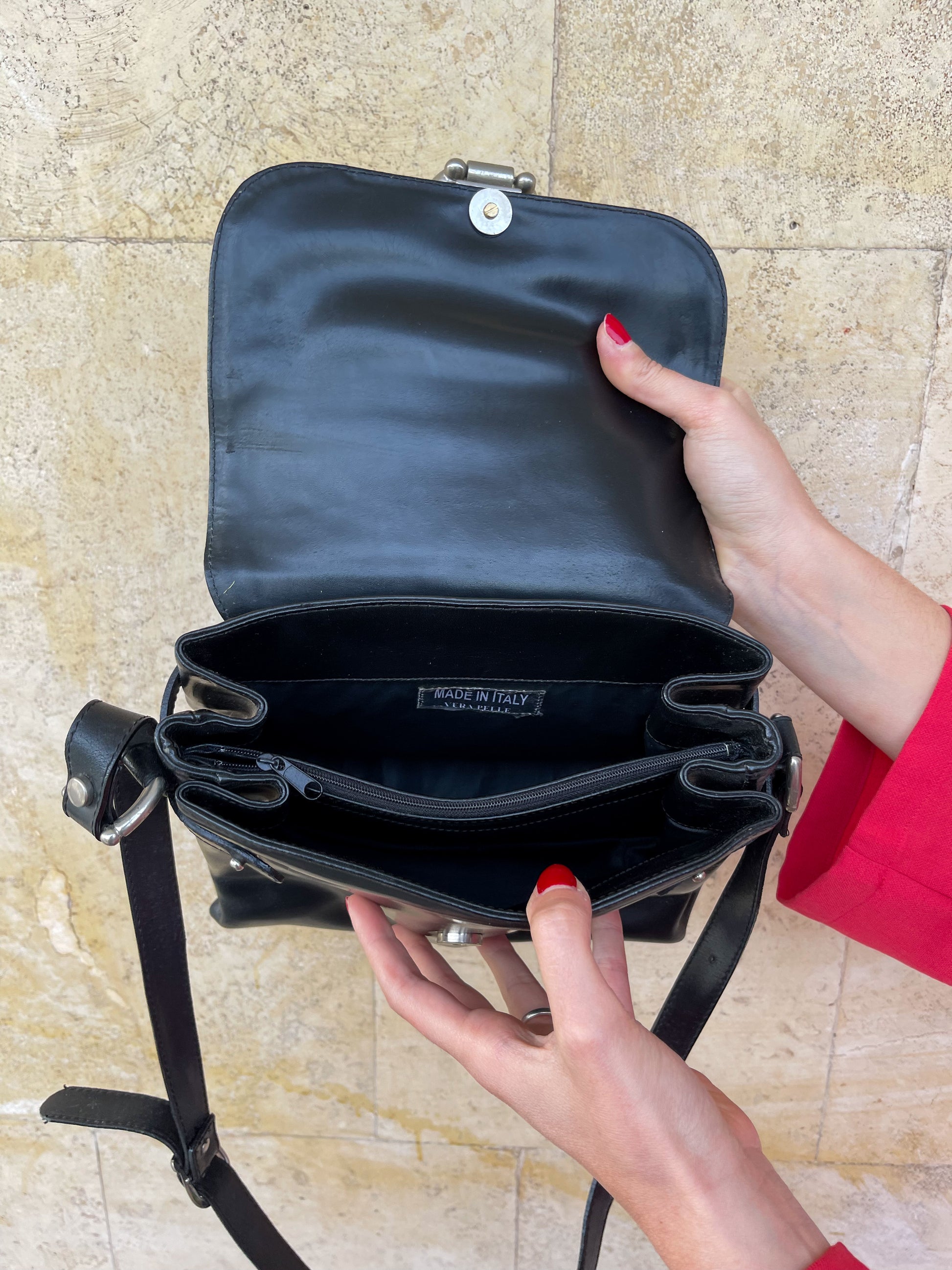 Borsa vintage a tracolla in vera pelle nera con patta e chiusura con bottone a pressione. Due scomparti interni e uno centrale con zip. Anello frontale in acciaio.