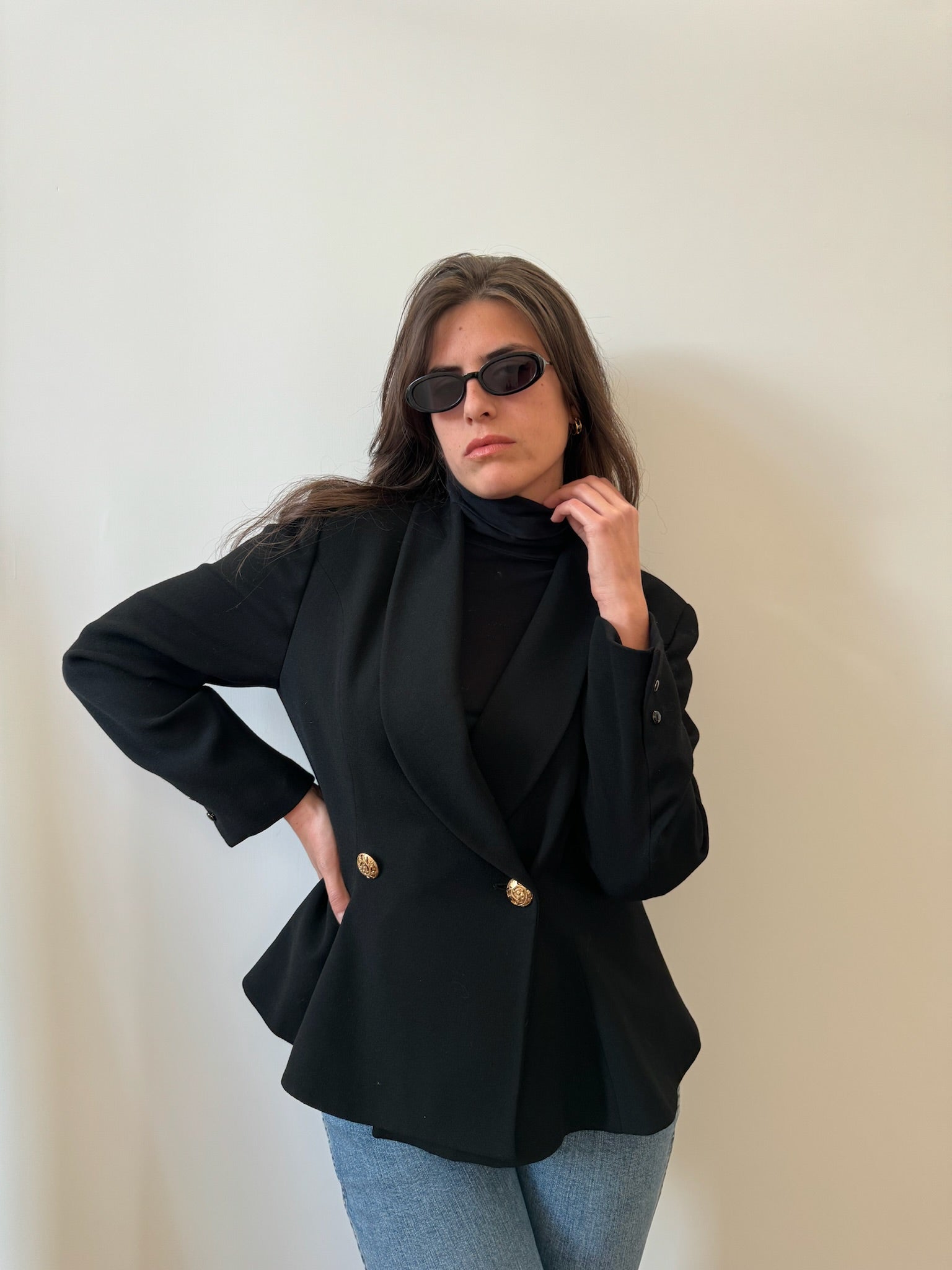 Giacca vintage nera in lana doppiopetto con spalline, ha una vestibilità avvitata valorizzando il punto vita. Bottoni gioiello dorati e collo sciallato.