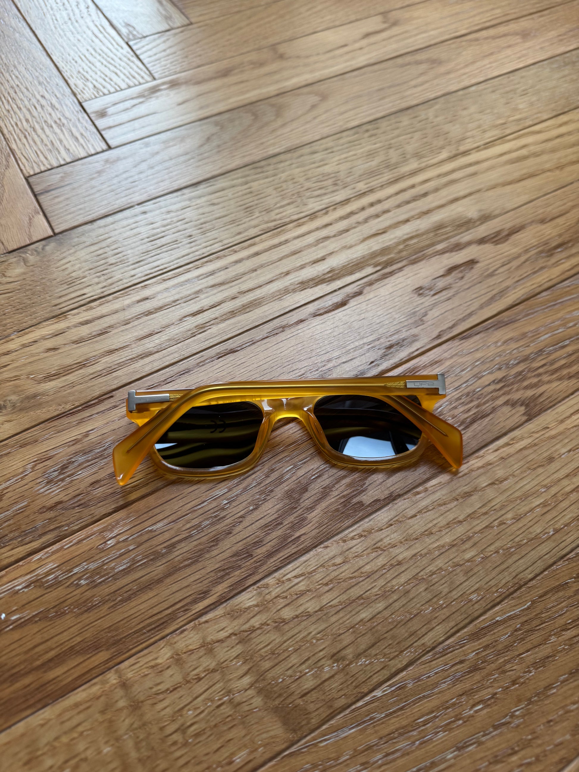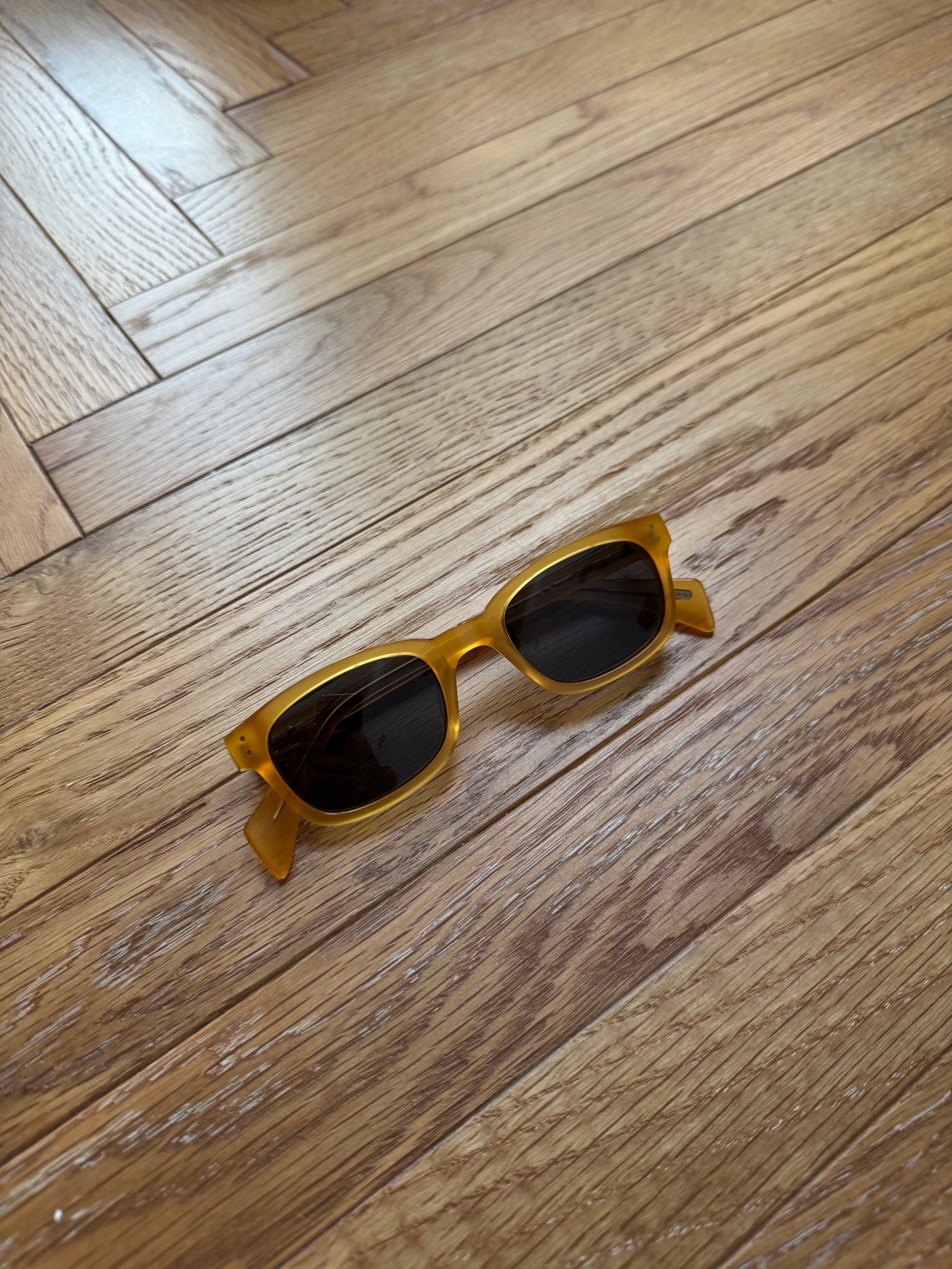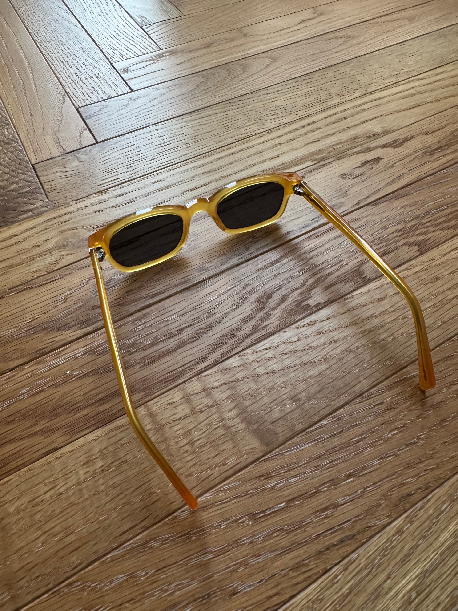 Occhiali da sole dalla forma rettangolare leggermente arrotondata in celluloide color senape e lenti scure a contrasto.