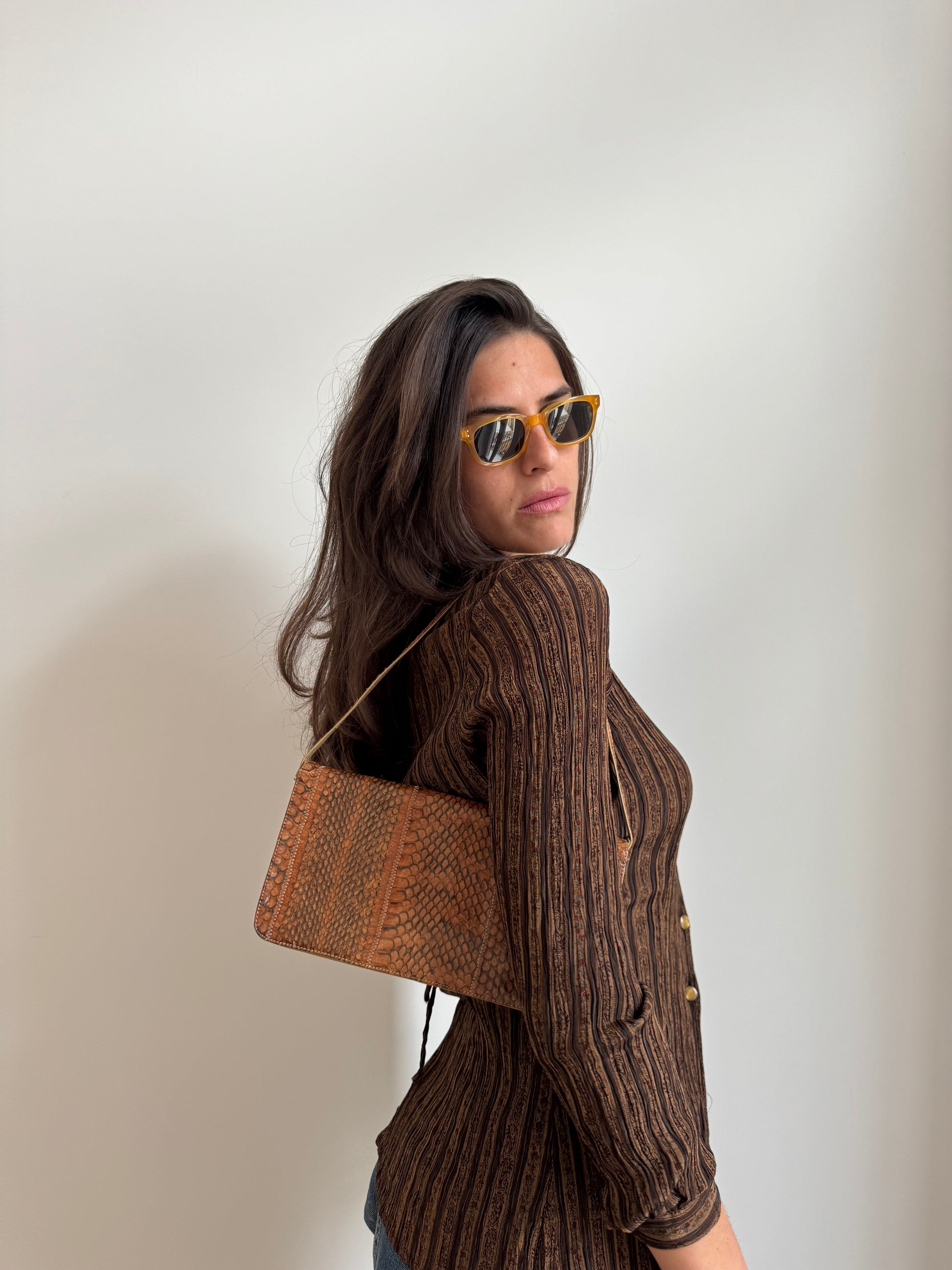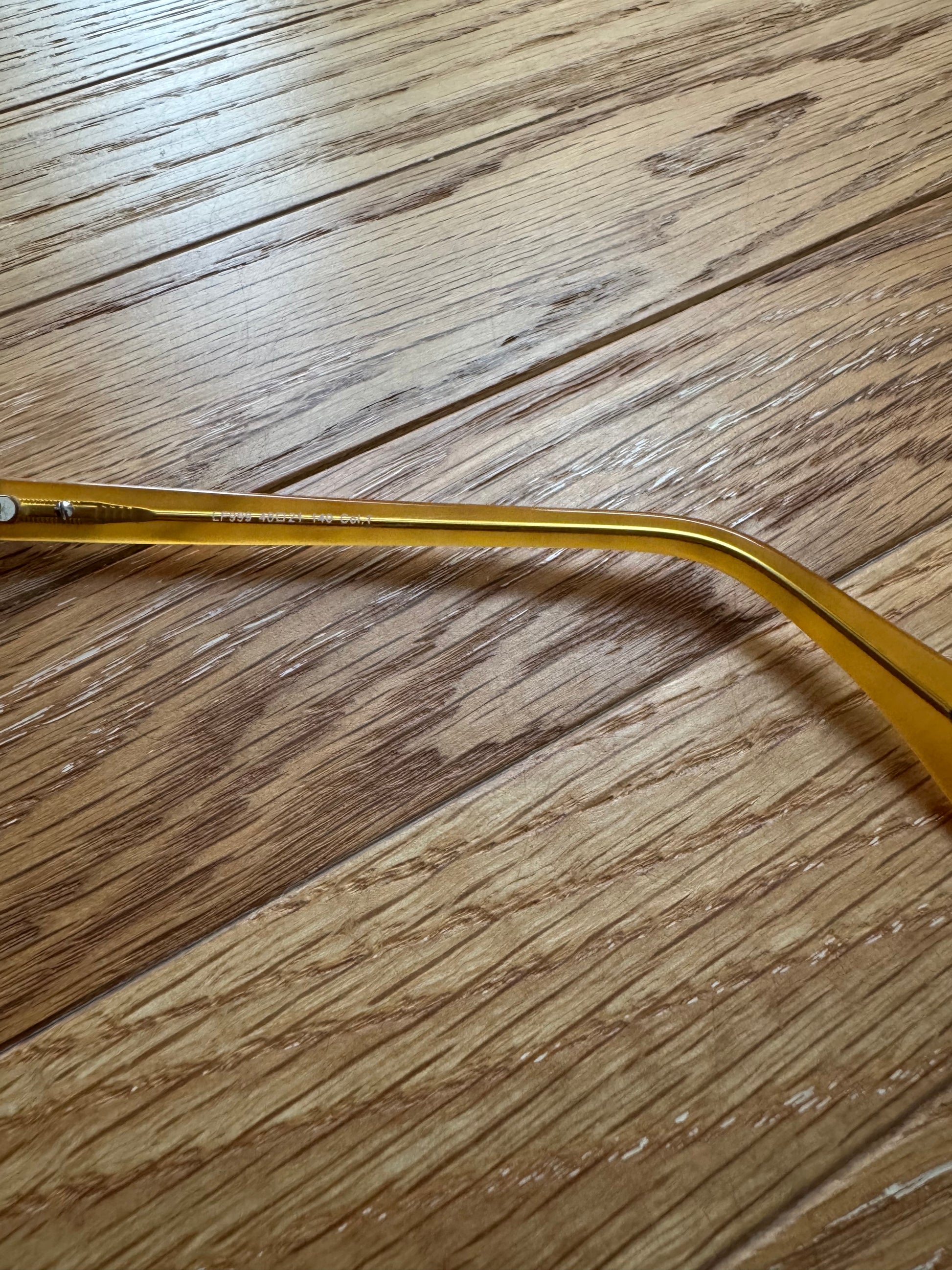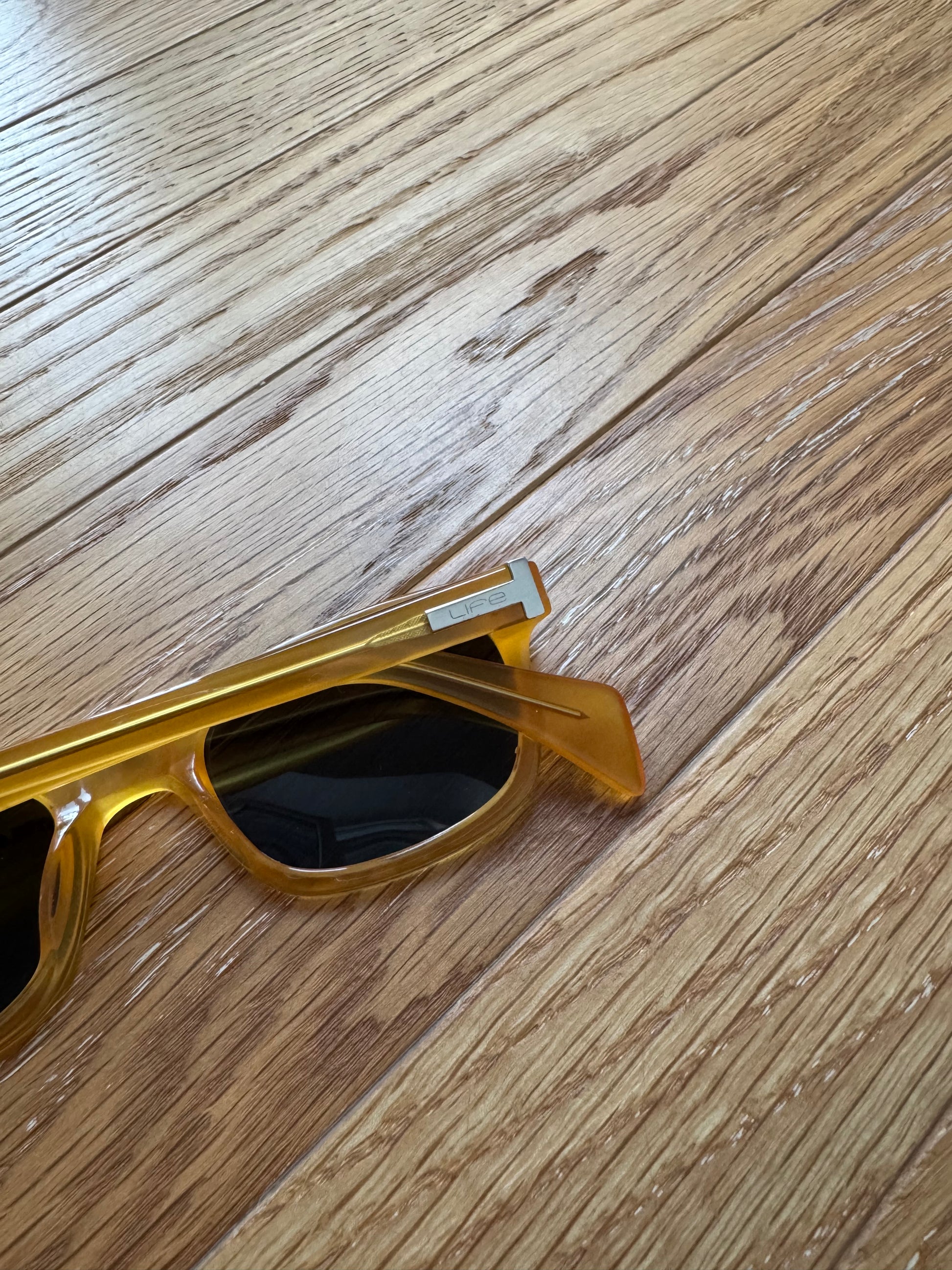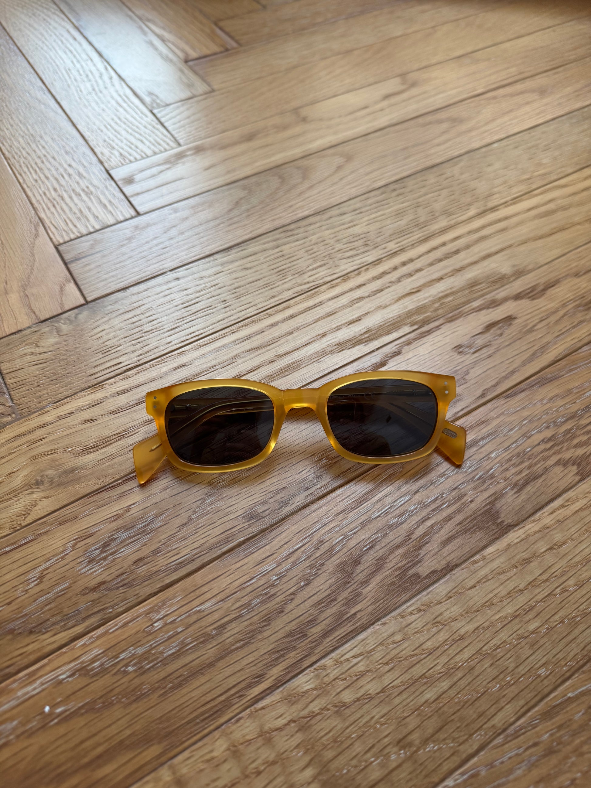 Occhiali da sole dalla forma rettangolare leggermente arrotondata in celluloide color senape e lenti scure a contrasto.