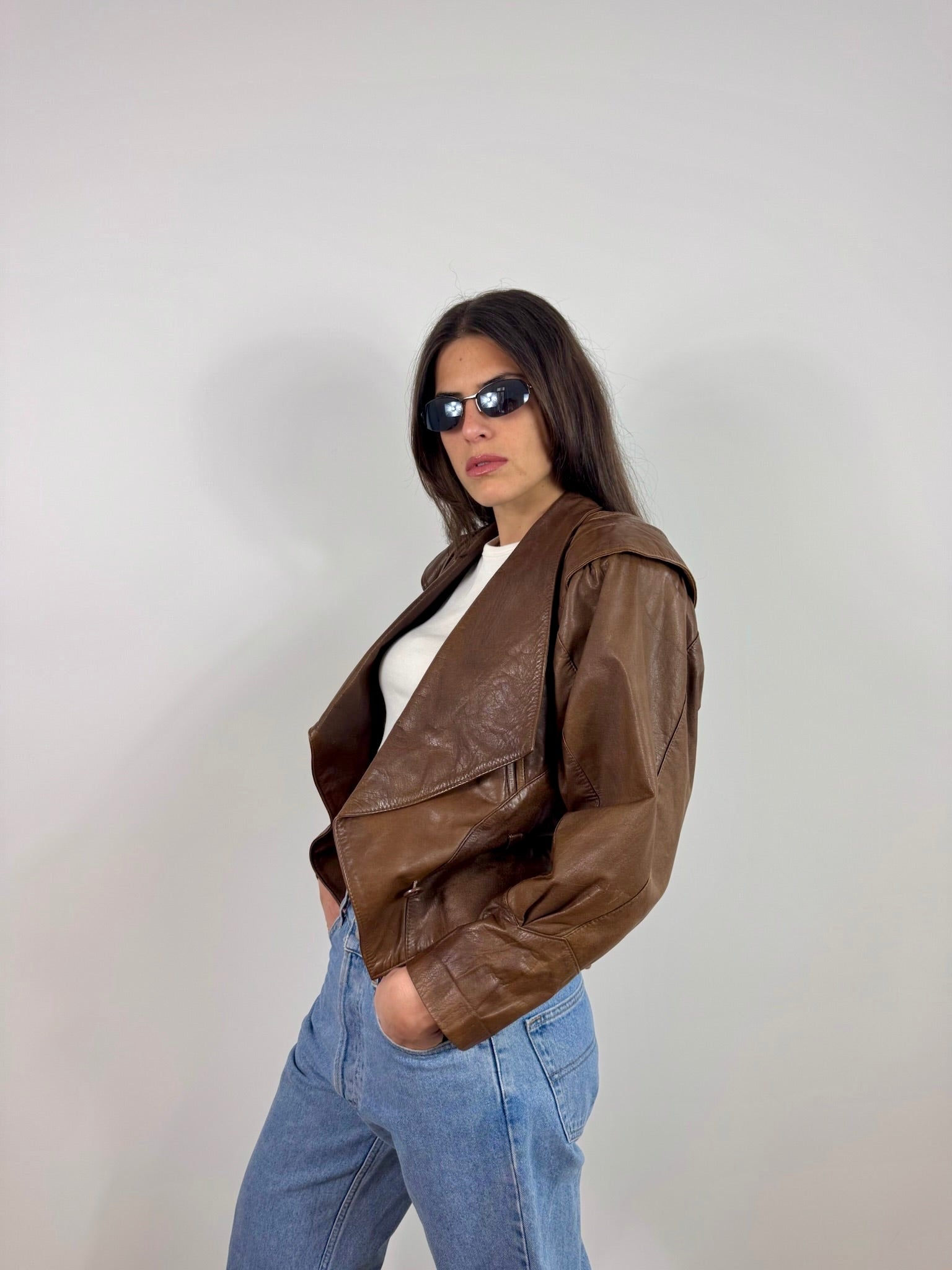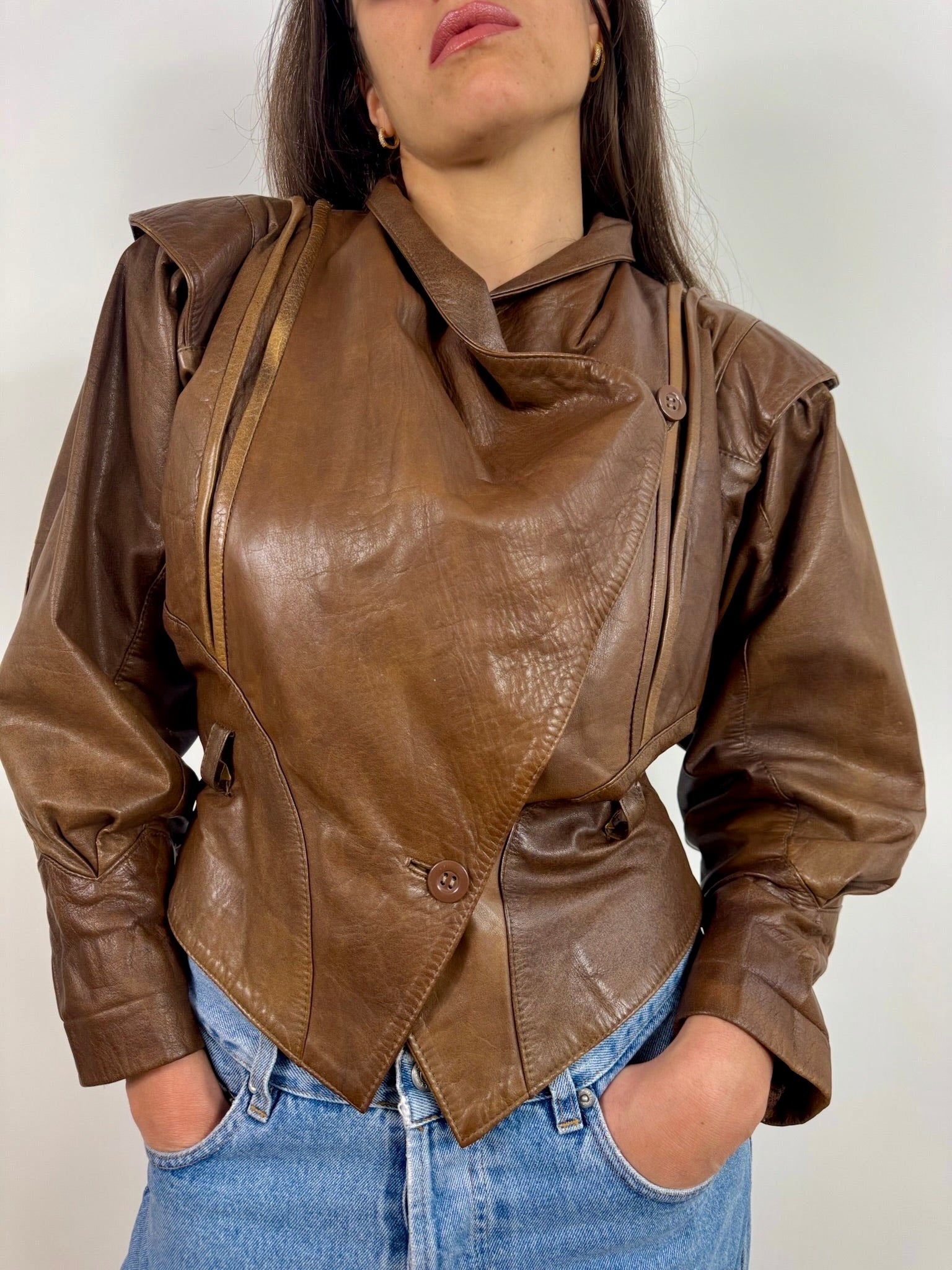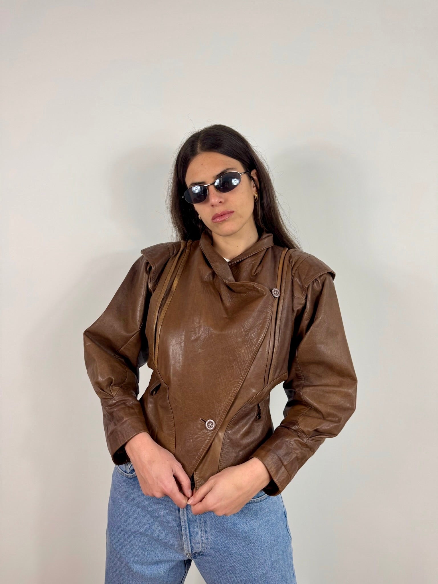 Giacca marrone in vera pelle, dal design fortemente ispirato agli anni '80, con una silhouette corta e strutturata che enfatizza la vita e le spalle. Taglio corto e avvitato, spalle strutturate e voluminose, con cuciture e dettagli che esaltano il look iconico degli anni '80. Ampio collo con rever drappeggiato e asimmetrico. Chiusura con bottoni frontali leggermente asimmetrica.