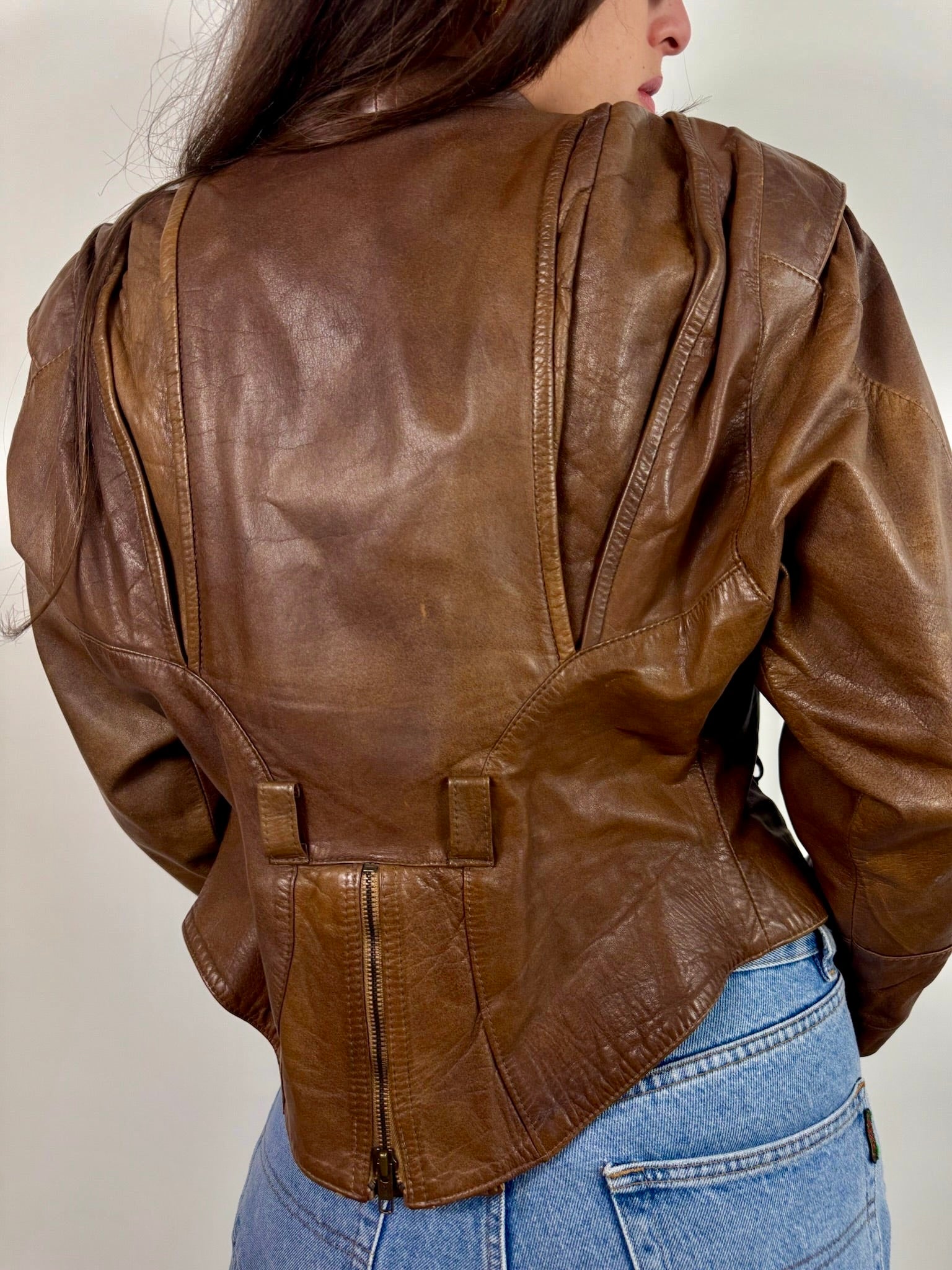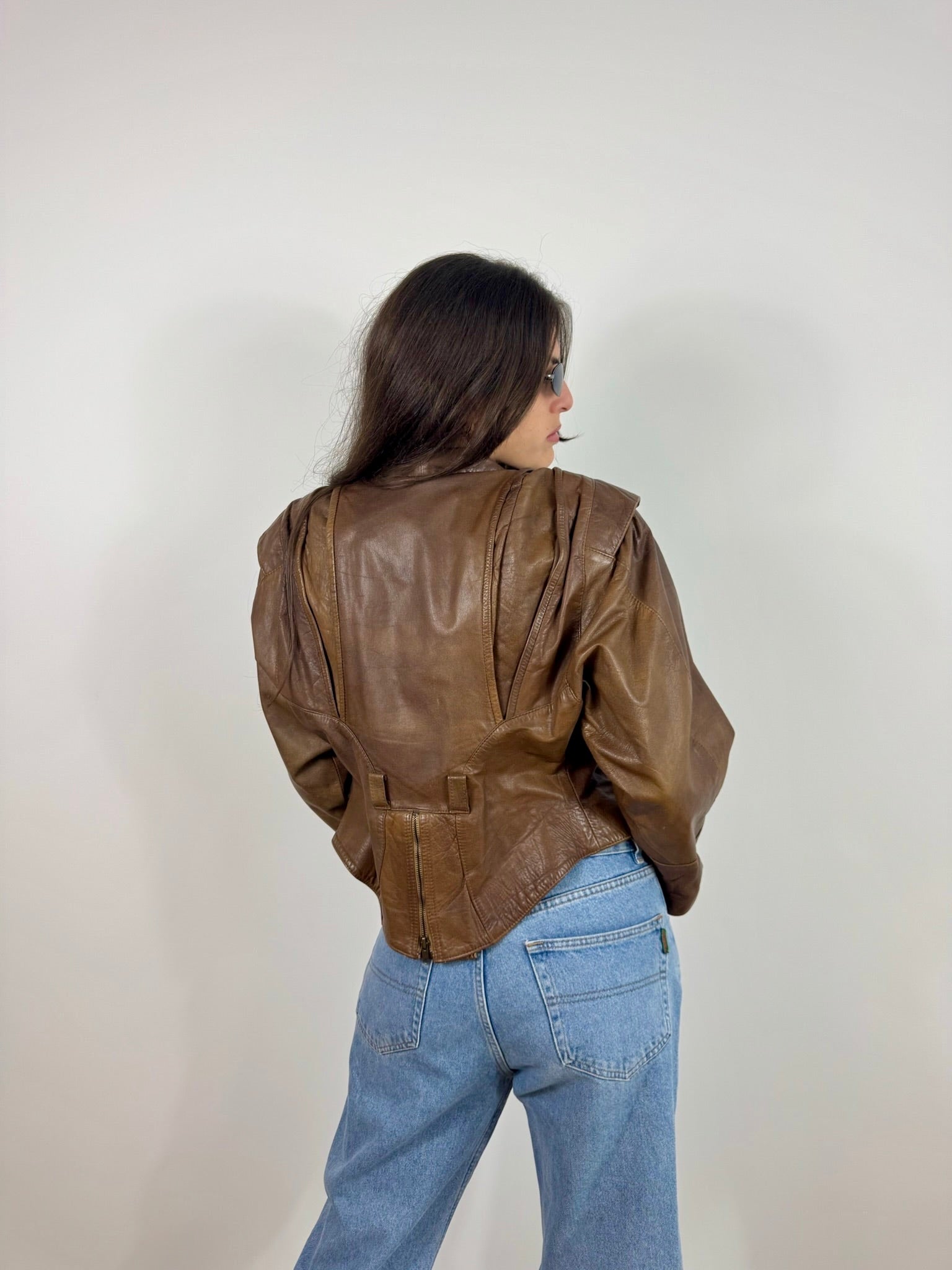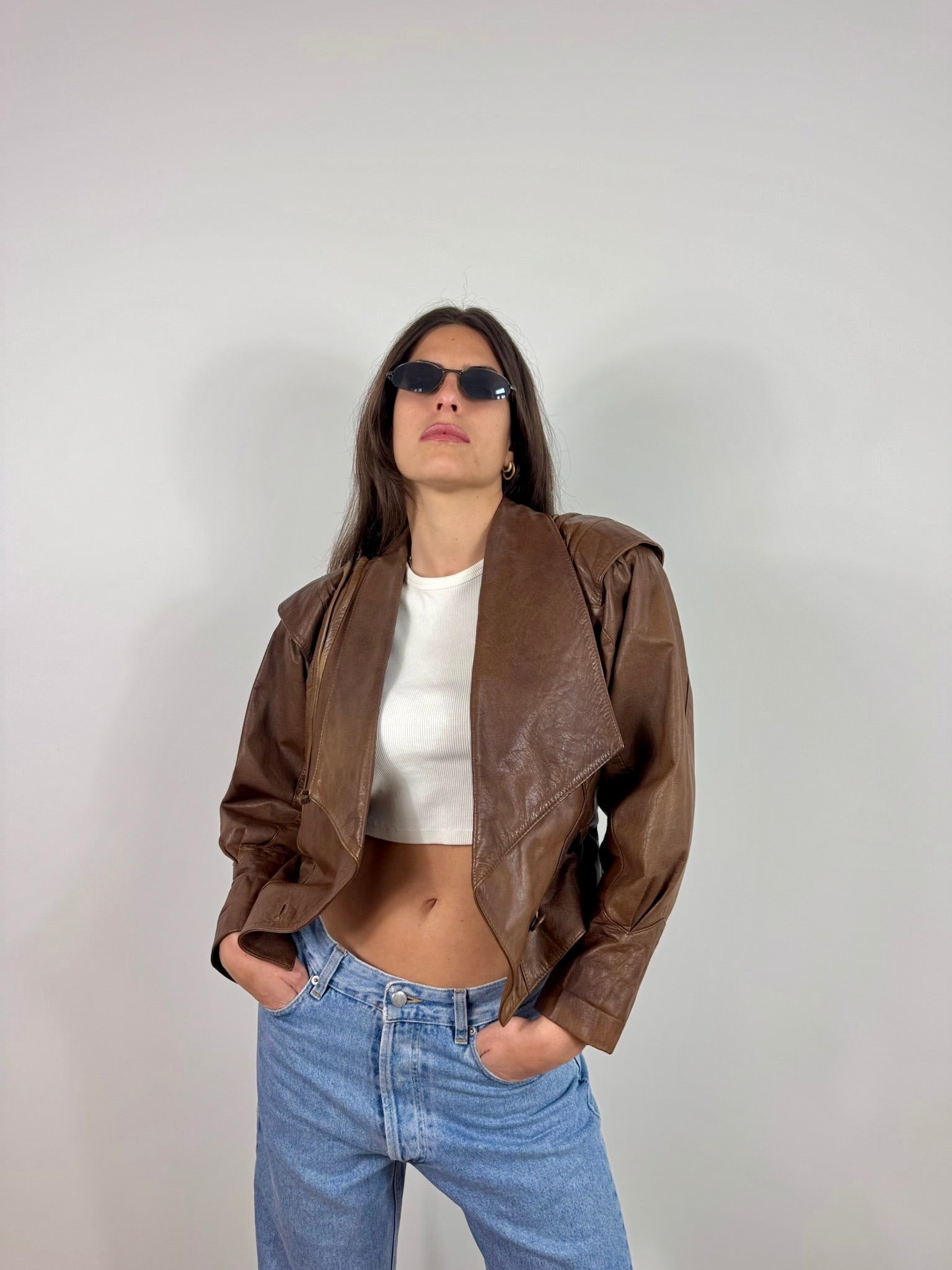 Giacca marrone in vera pelle, dal design fortemente ispirato agli anni '80, con una silhouette corta e strutturata che enfatizza la vita e le spalle. Taglio corto e avvitato, spalle strutturate e voluminose, con cuciture e dettagli che esaltano il look iconico degli anni '80. Ampio collo con rever drappeggiato e asimmetrico. Chiusura con bottoni frontali leggermente asimmetrica.