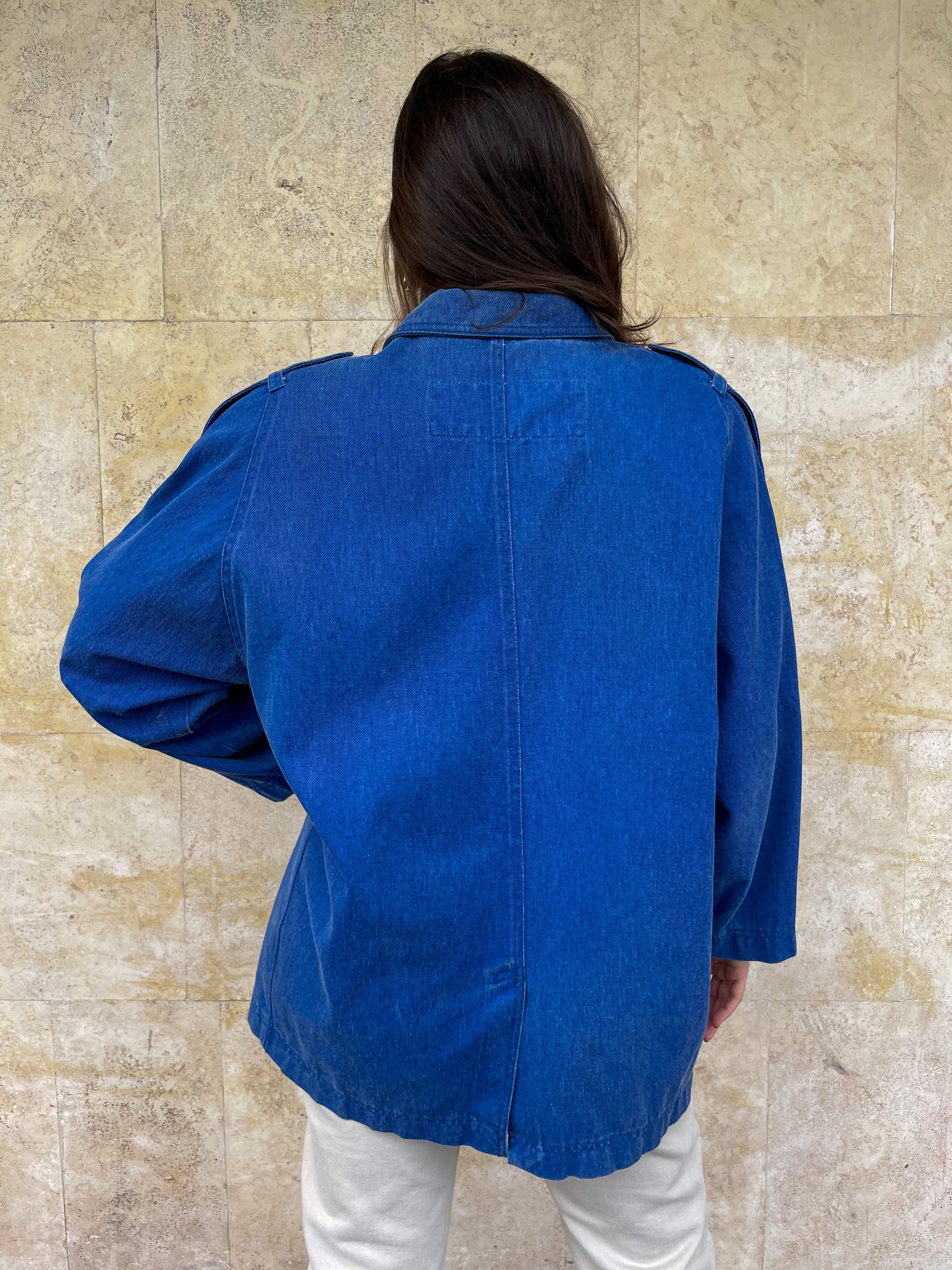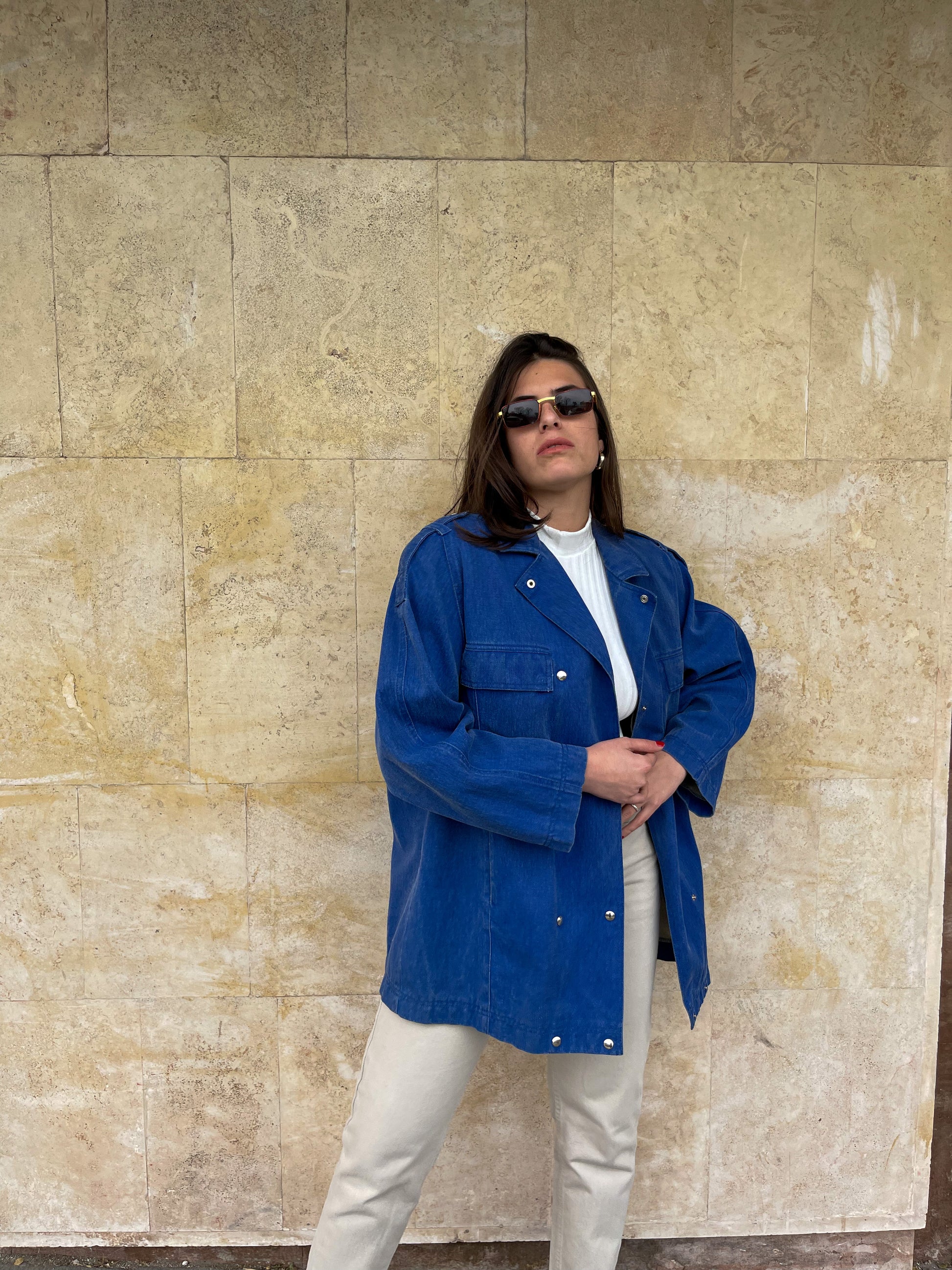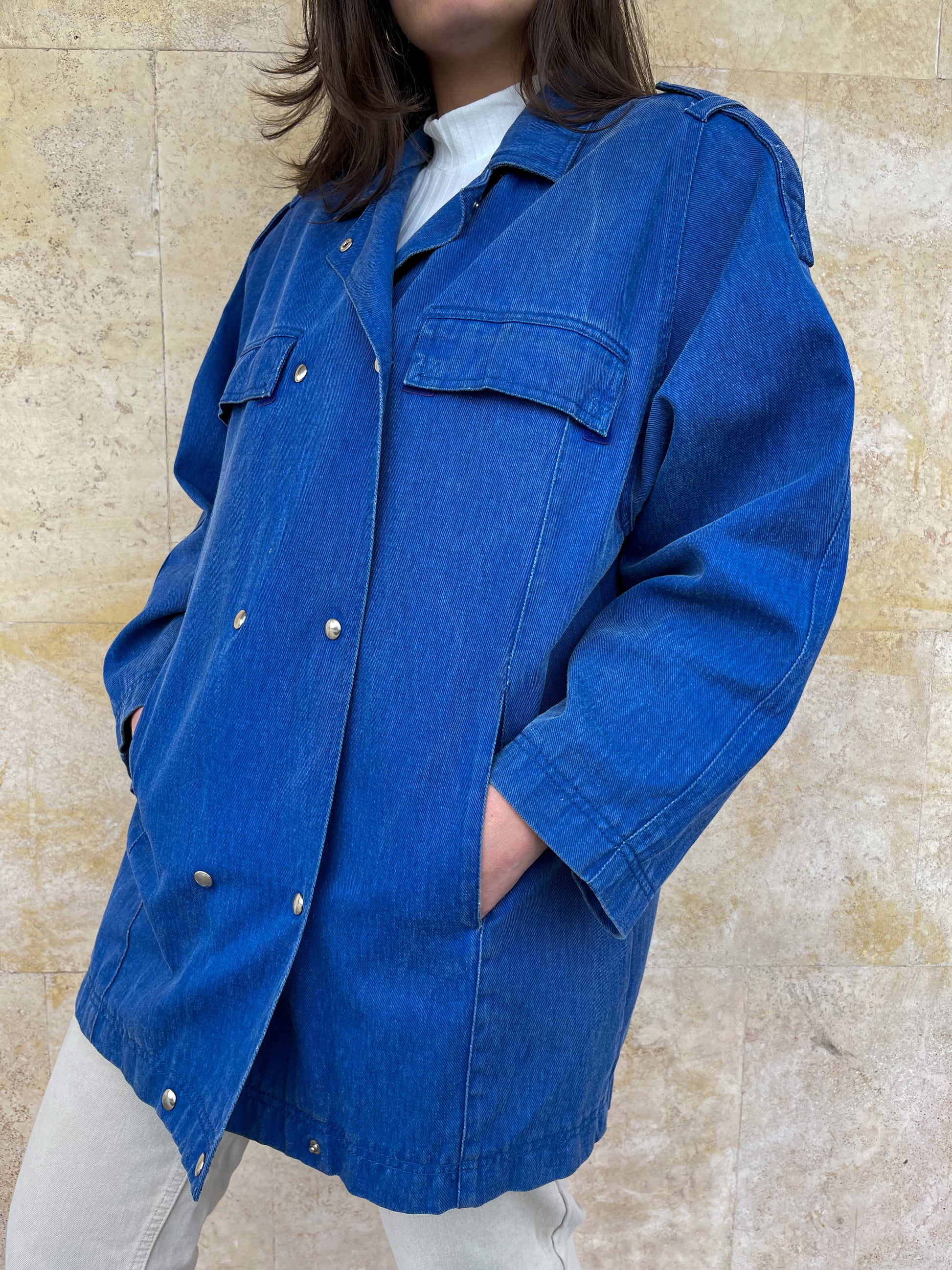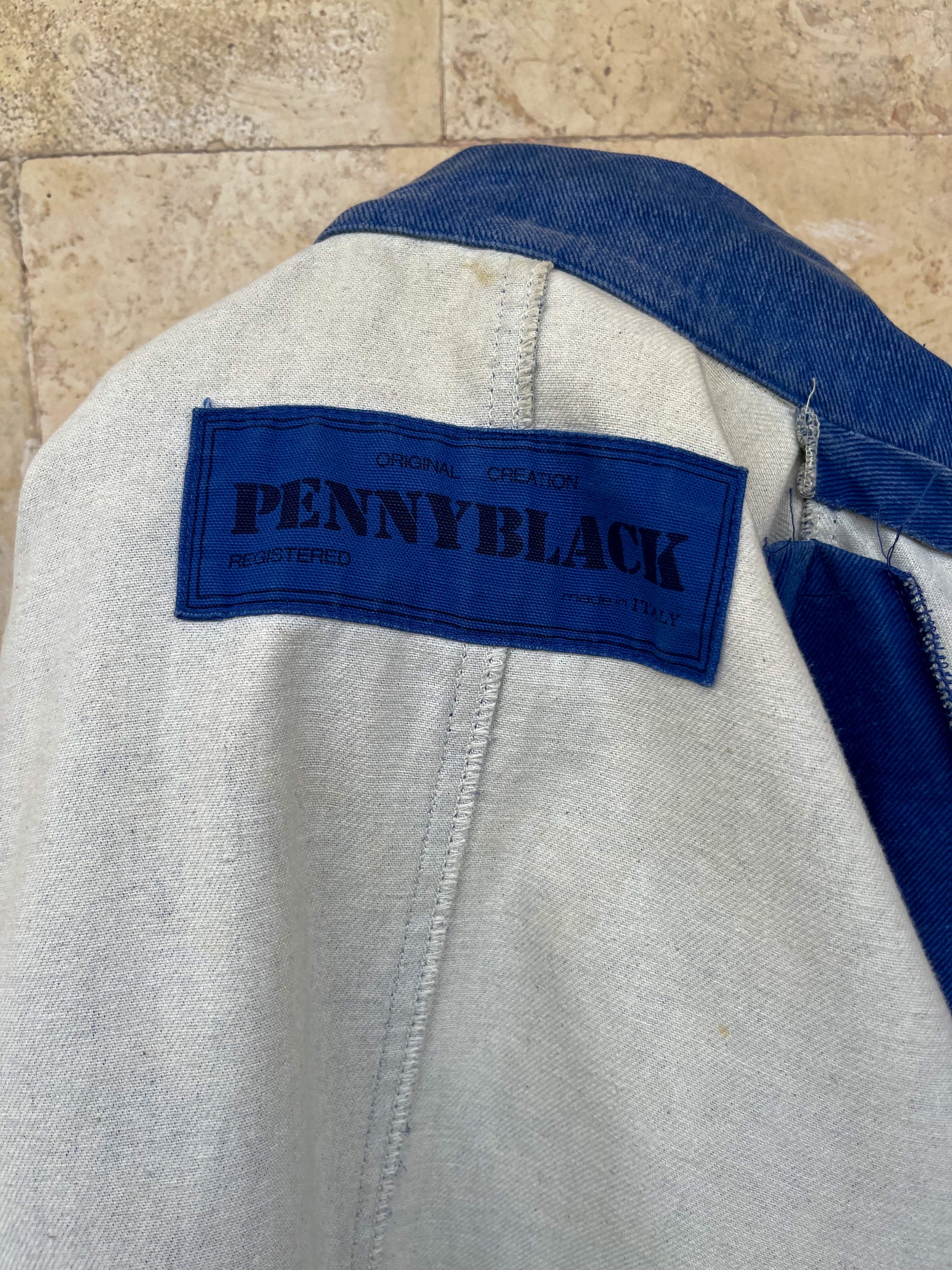 Giacca in denim in 100% cotone firmata Penny Black doppiopetto con bottoni a clip e mostrine sulle spalline imbottite. Tasche a filetto laterali e tasche con patta sul petto. Vestibilità dritta.