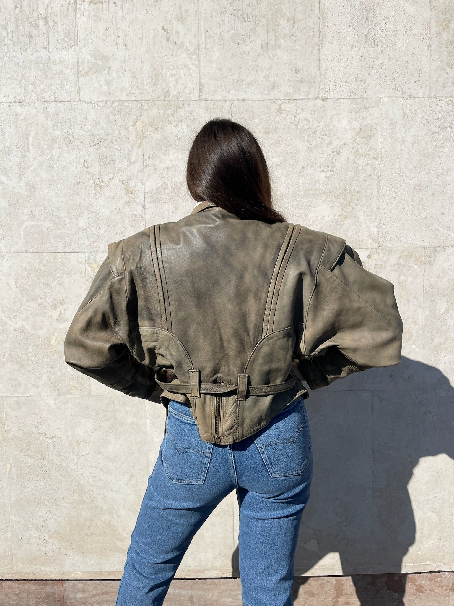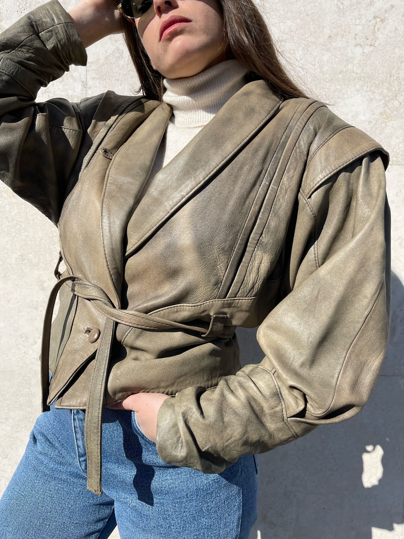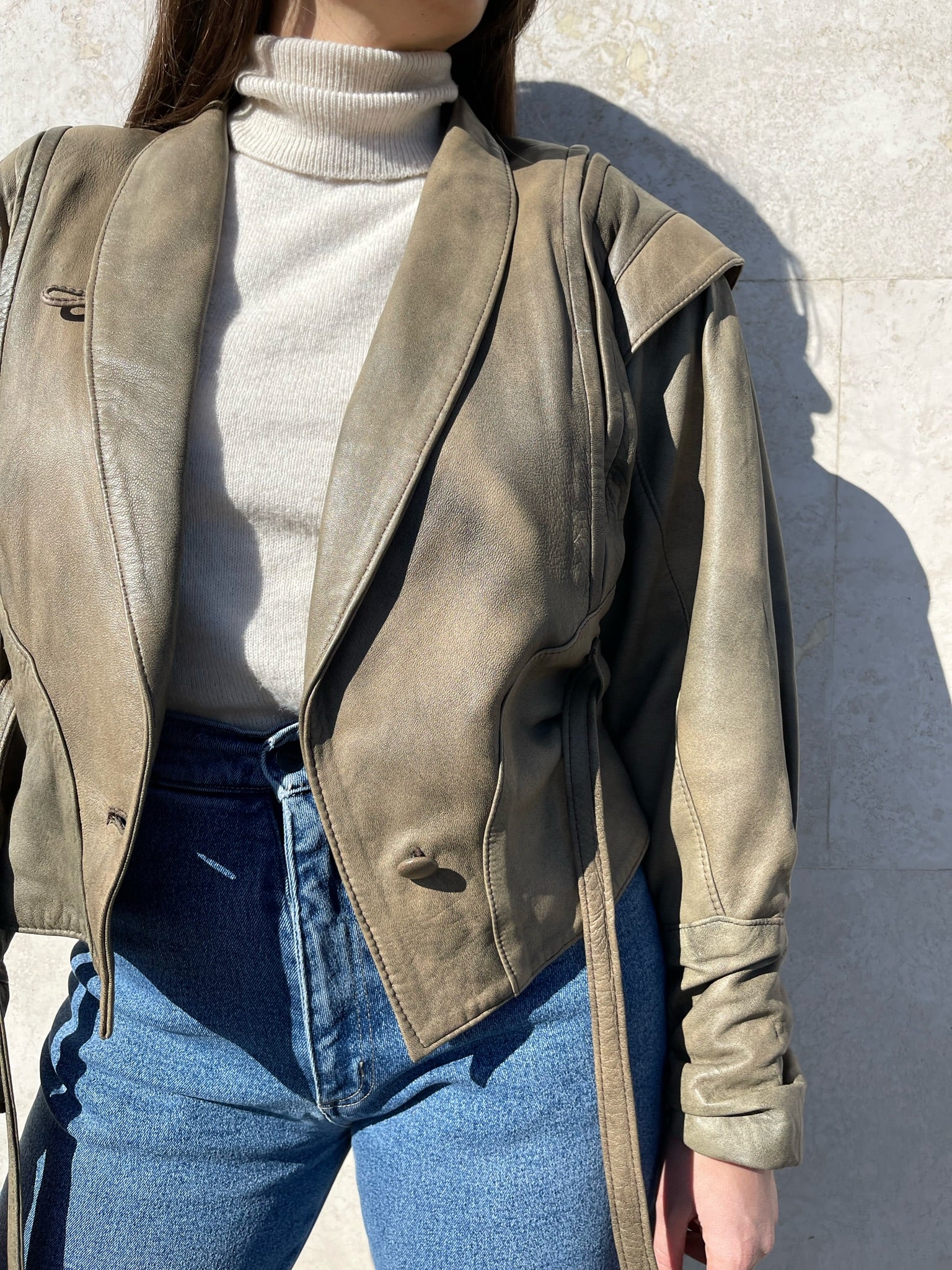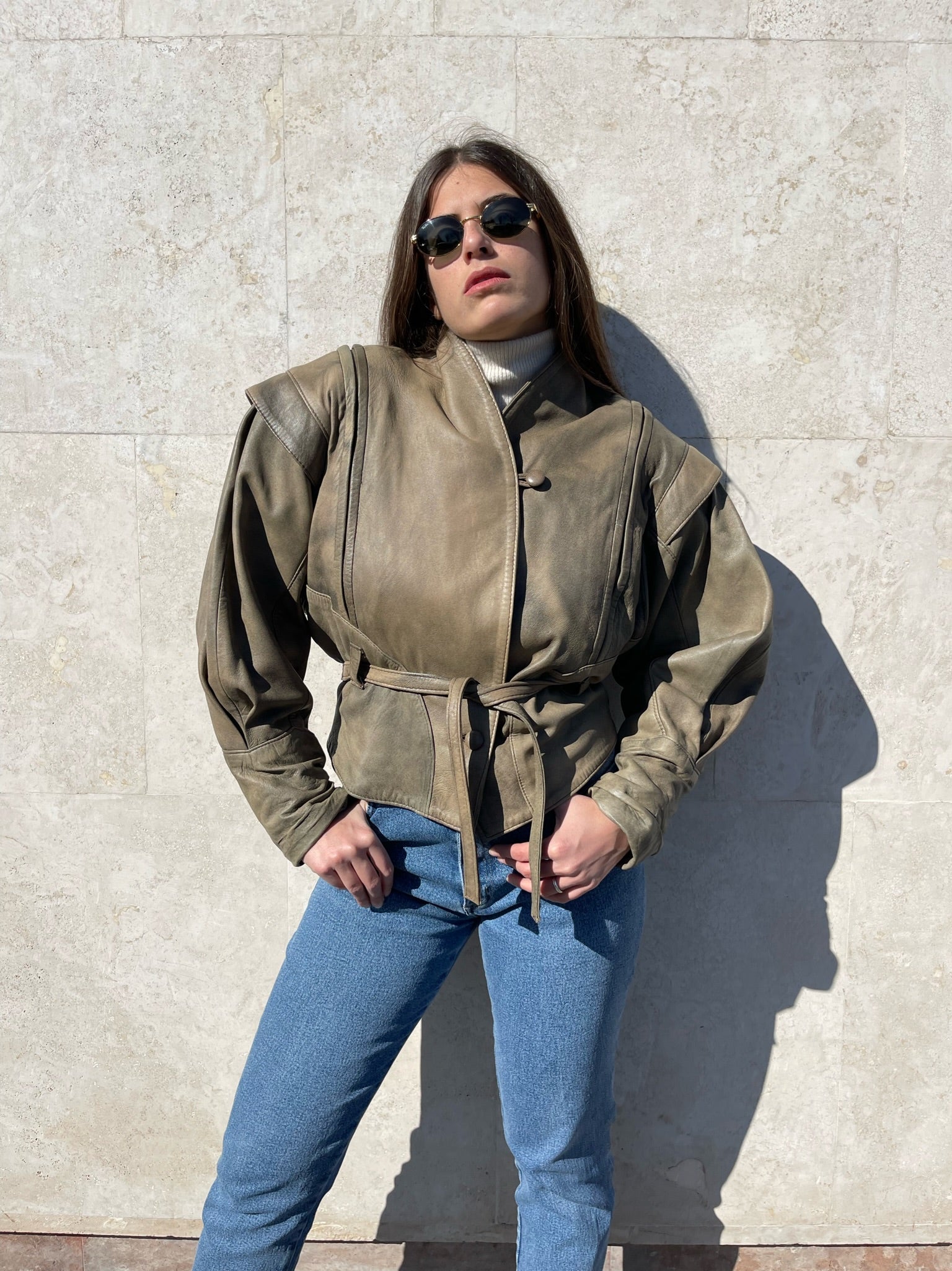 Giacca in pelle color fango con effetto sfumato dal taglio particolarmente vintage grazie alla vestibilità avvitata all’altezza del punto vita e le fantastiche spalline. Bavero sciallato, chiusura con unico bottone e cintura con passanti. Tasche laterali e mini zip sul retro.