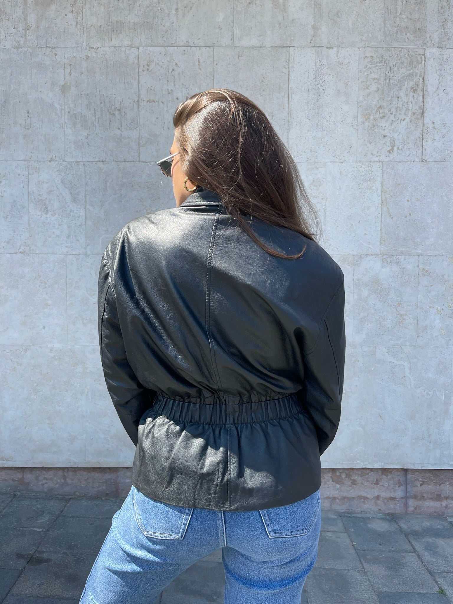 Giacca nera in vera pelle stile chiodo, chiusura con zip in diagonale e cintura in vita. Tasche laterali al livello del petto. Sul retro riporta un elastico per rendere il capo più avvitato