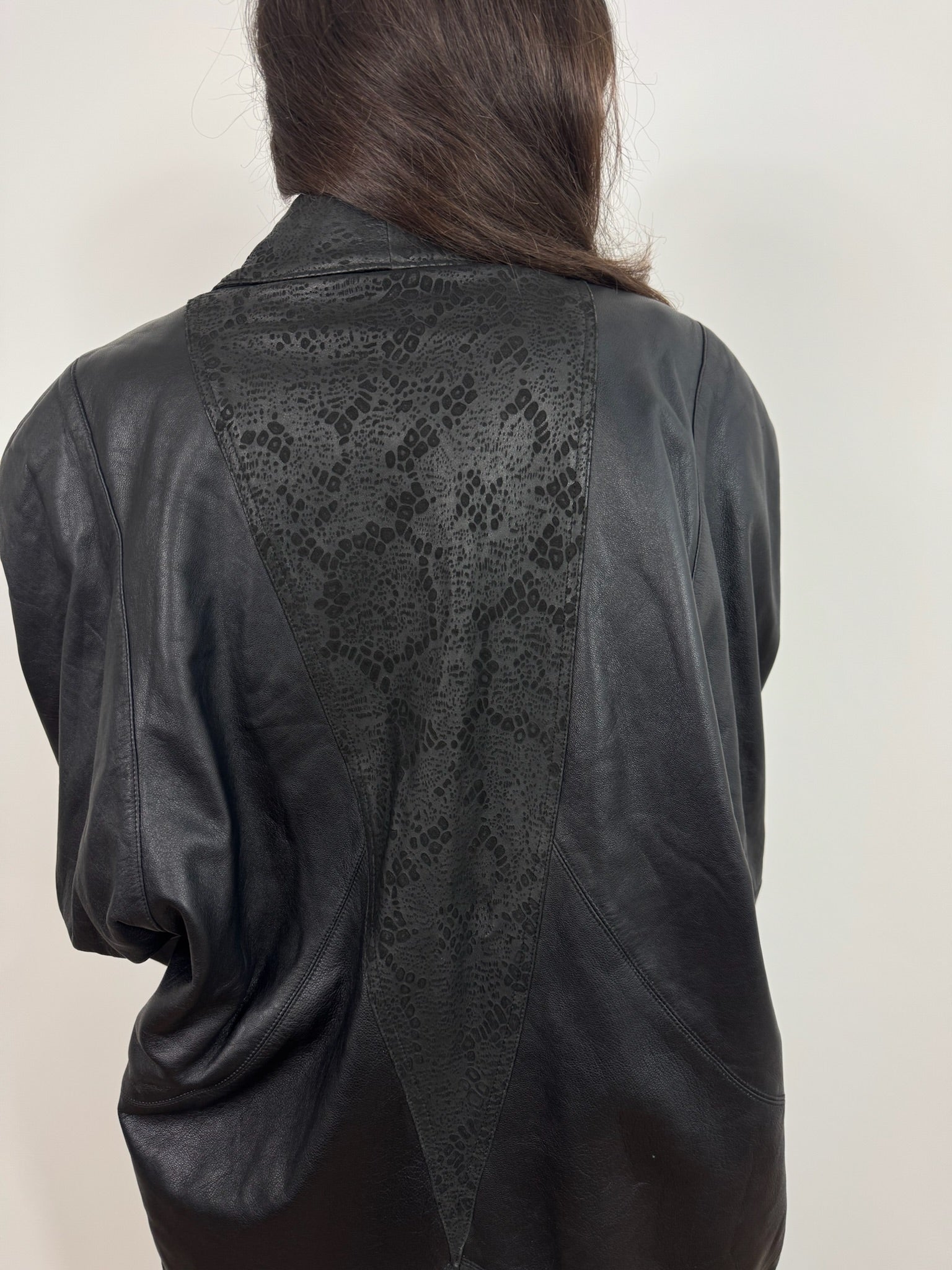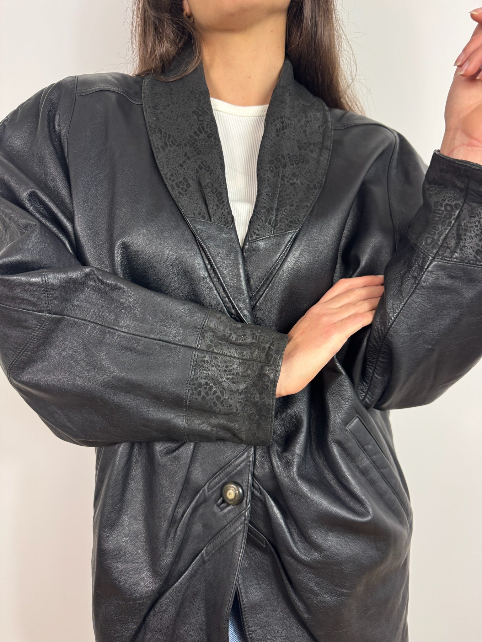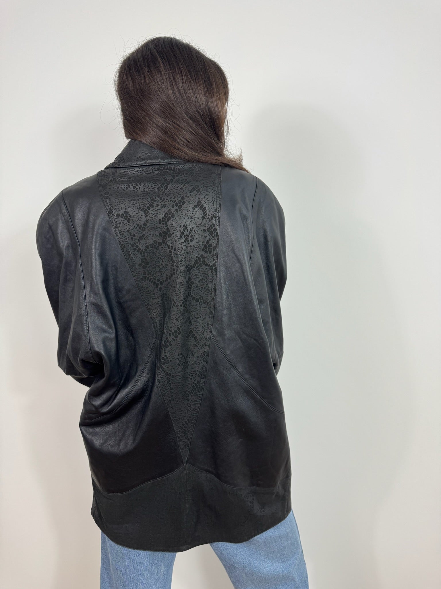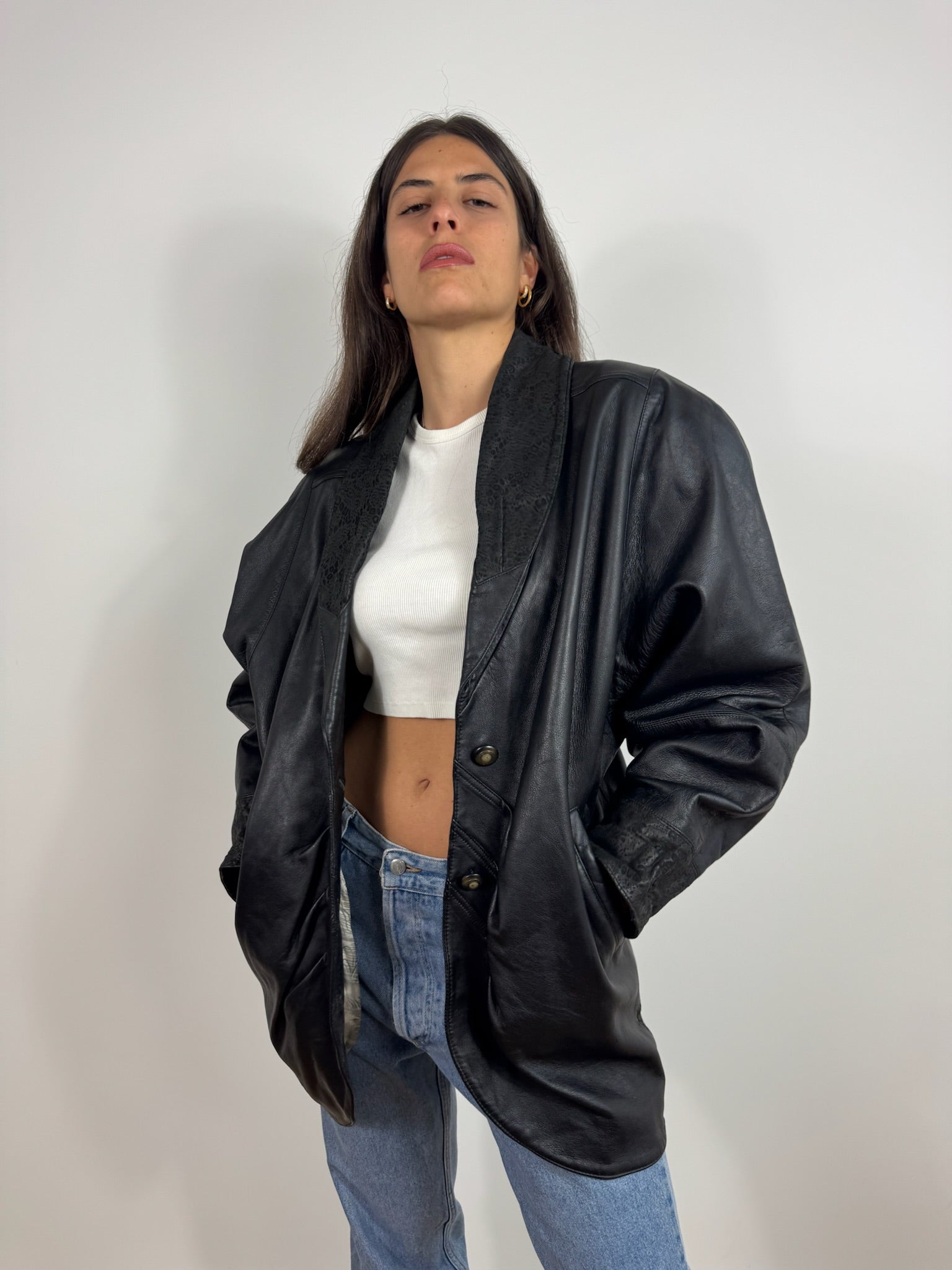 Giacca vintage nera in vera pelle con spalline dal design vintage e particolare. Presenta una vestibilità ampia e un look distintivo, con alcuni dettagli che la rendono unica: Colletto ampio con inserti in tessuto lavorato, caratterizzato da un motivo in maculato, a contrasto rispetto al resto della giacca. Stessi dettagli sui polsini e sul retro.