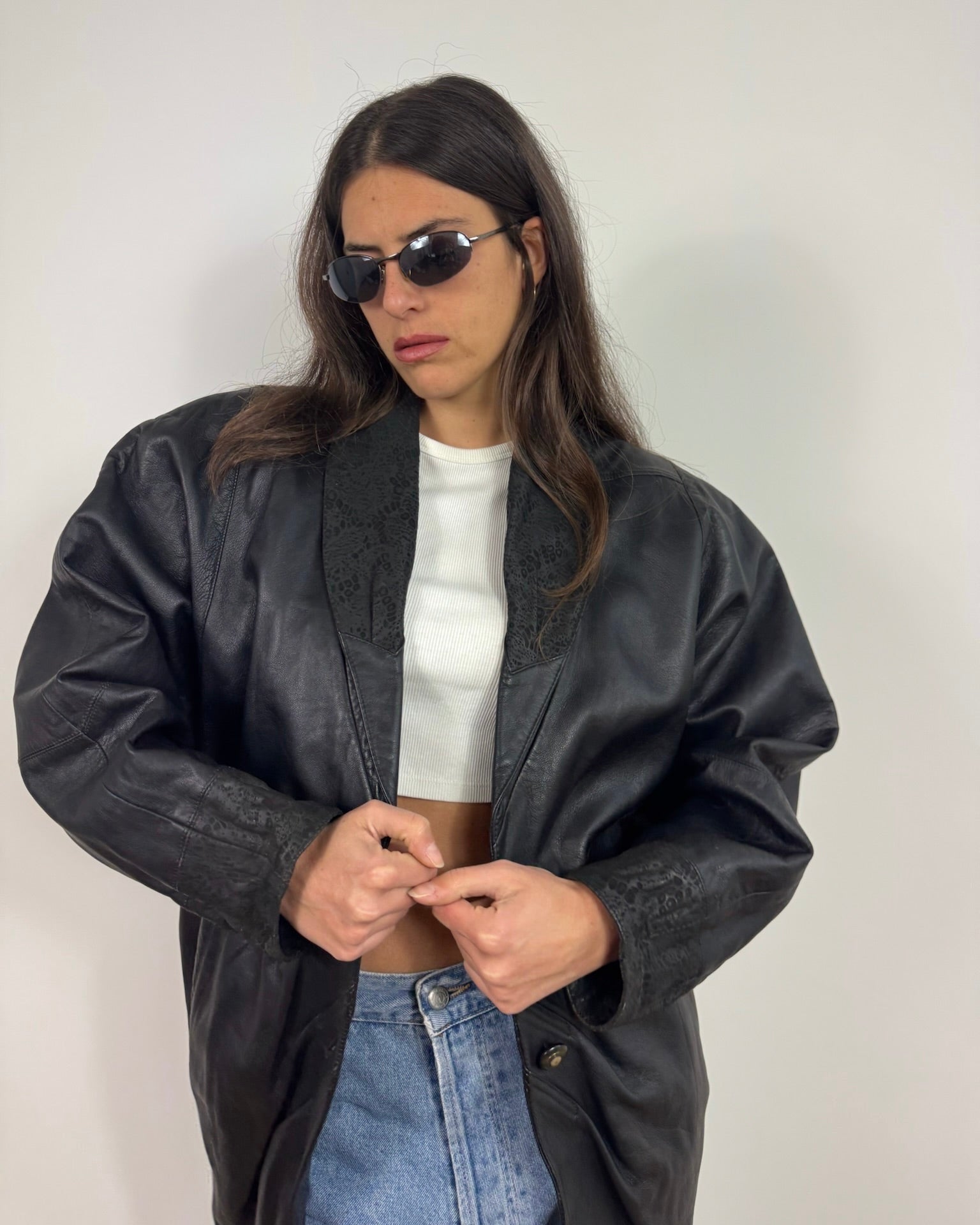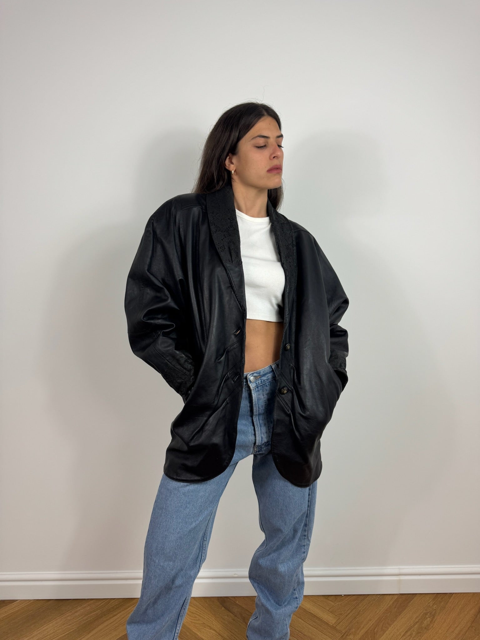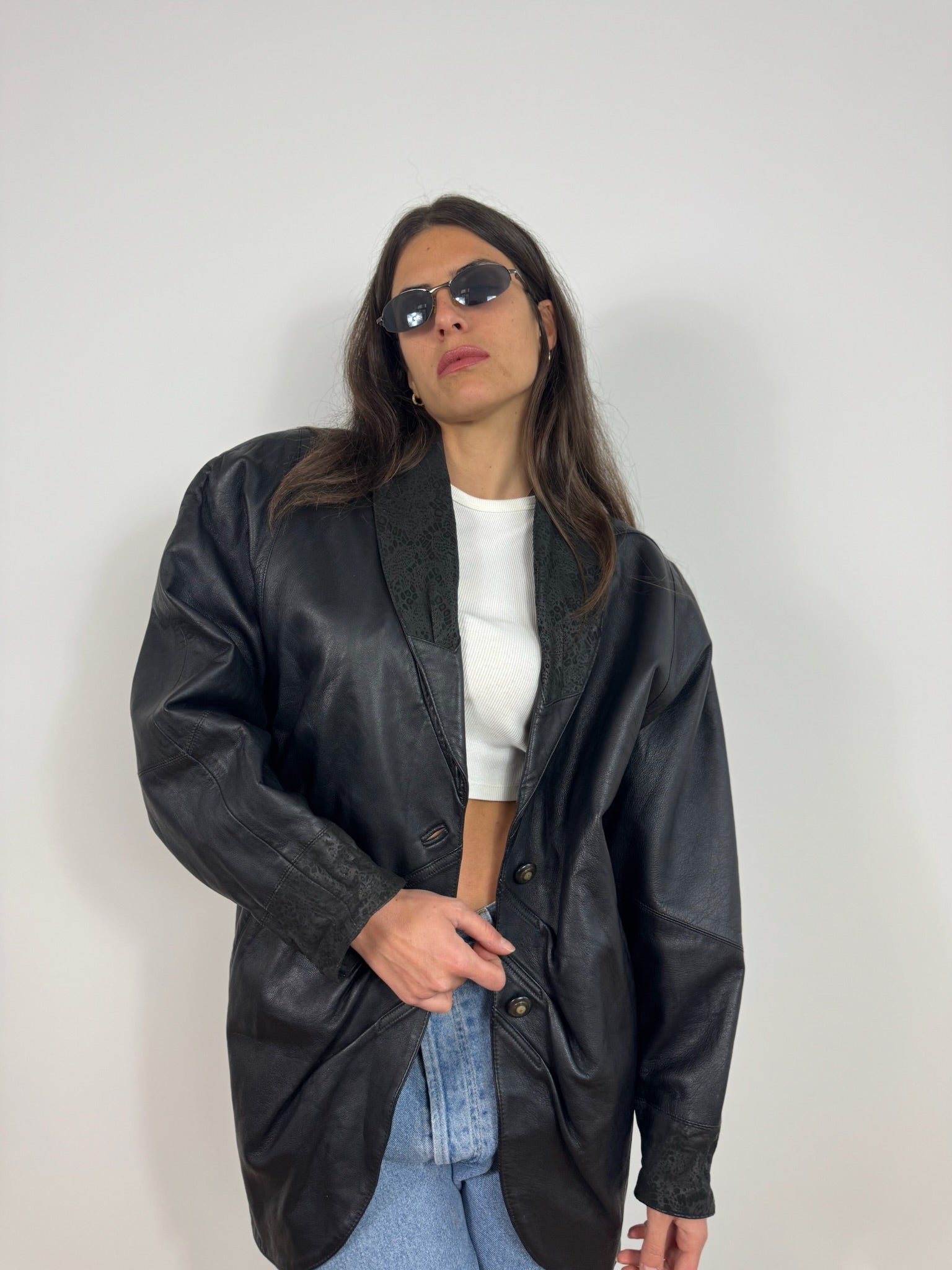 Giacca vintage nera in vera pelle con spalline dal design vintage e particolare. Presenta una vestibilità ampia e un look distintivo, con alcuni dettagli che la rendono unica: Colletto ampio con inserti in tessuto lavorato, caratterizzato da un motivo in maculato, a contrasto rispetto al resto della giacca. Stessi dettagli sui polsini e sul retro.