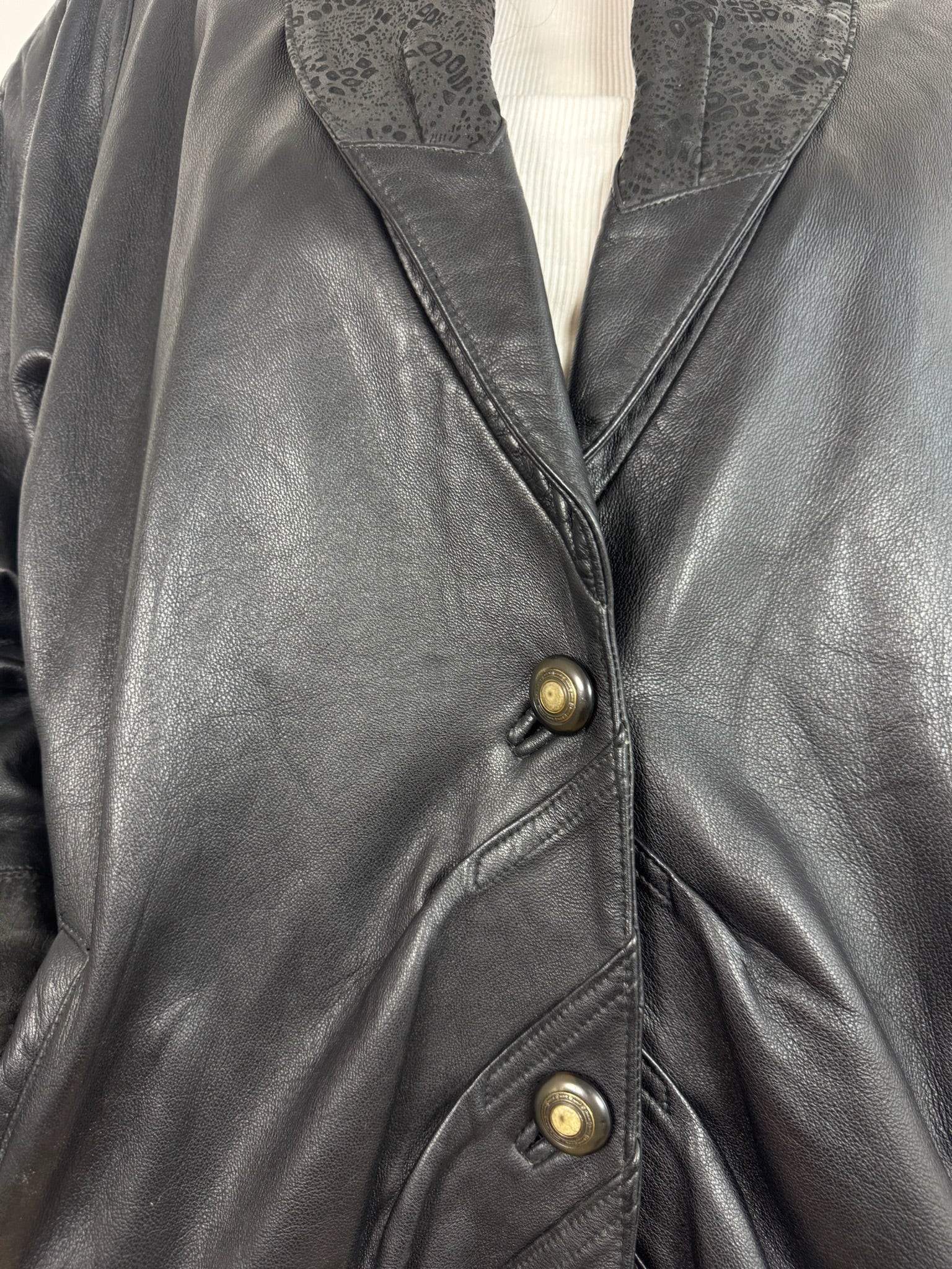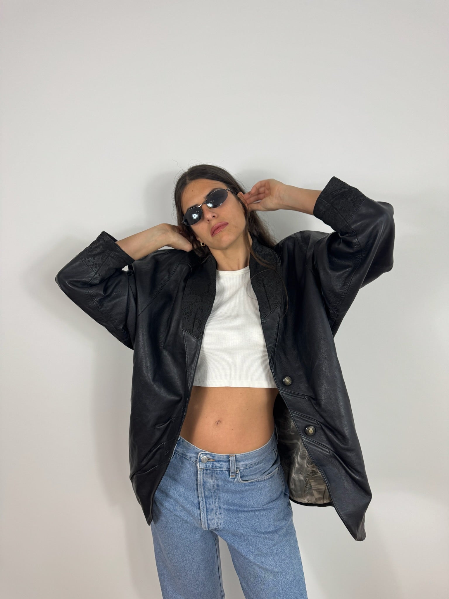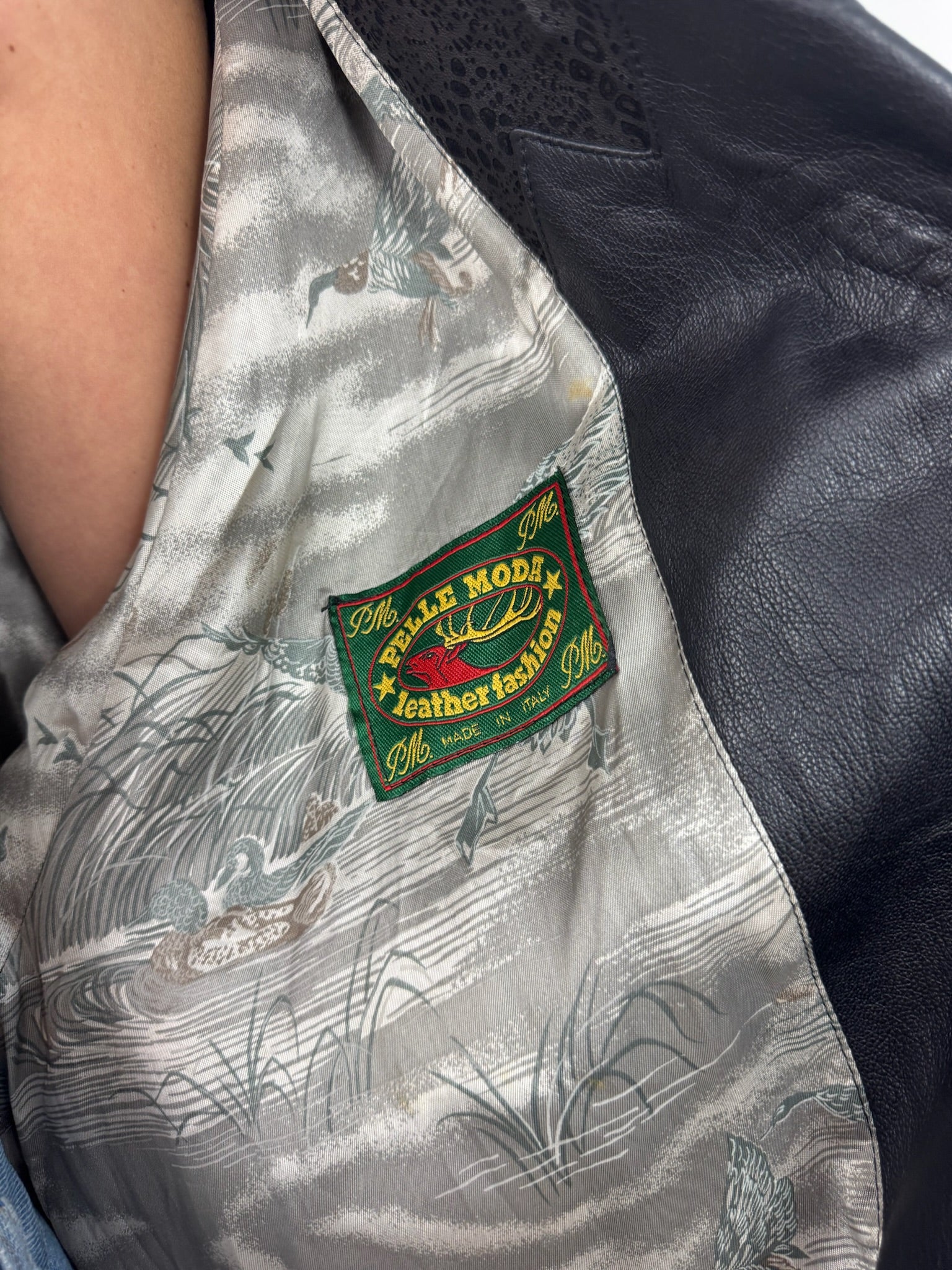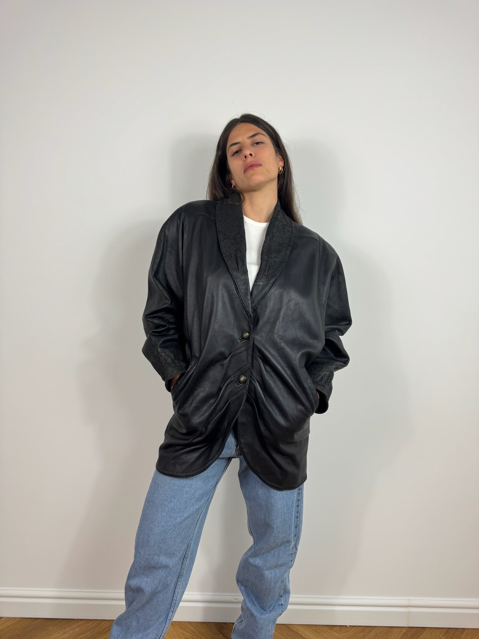 Giacca vintage nera in vera pelle con spalline dal design vintage e particolare. Presenta una vestibilità ampia e un look distintivo, con alcuni dettagli che la rendono unica: Colletto ampio con inserti in tessuto lavorato, caratterizzato da un motivo in maculato, a contrasto rispetto al resto della giacca. Stessi dettagli sui polsini e sul retro.