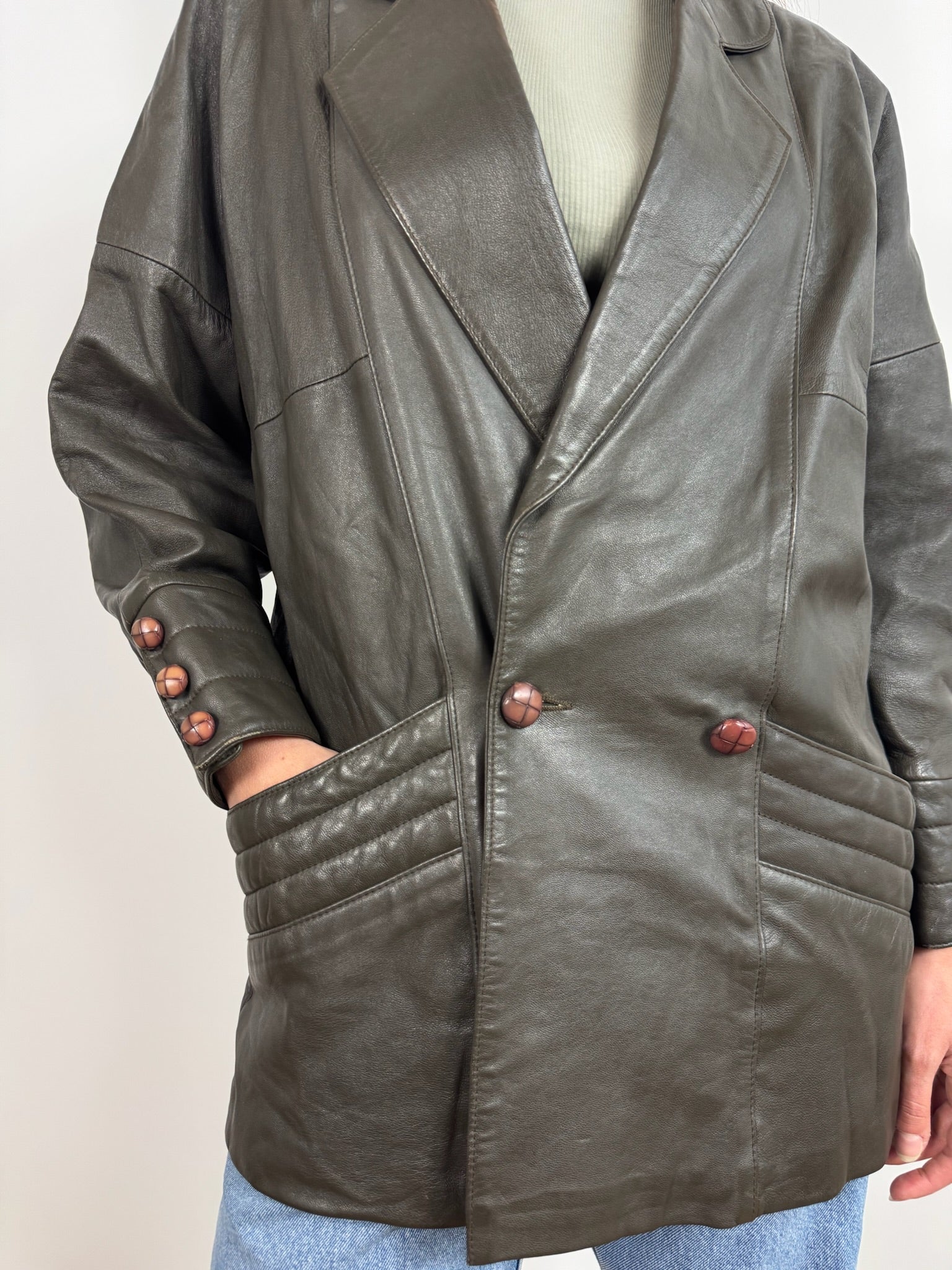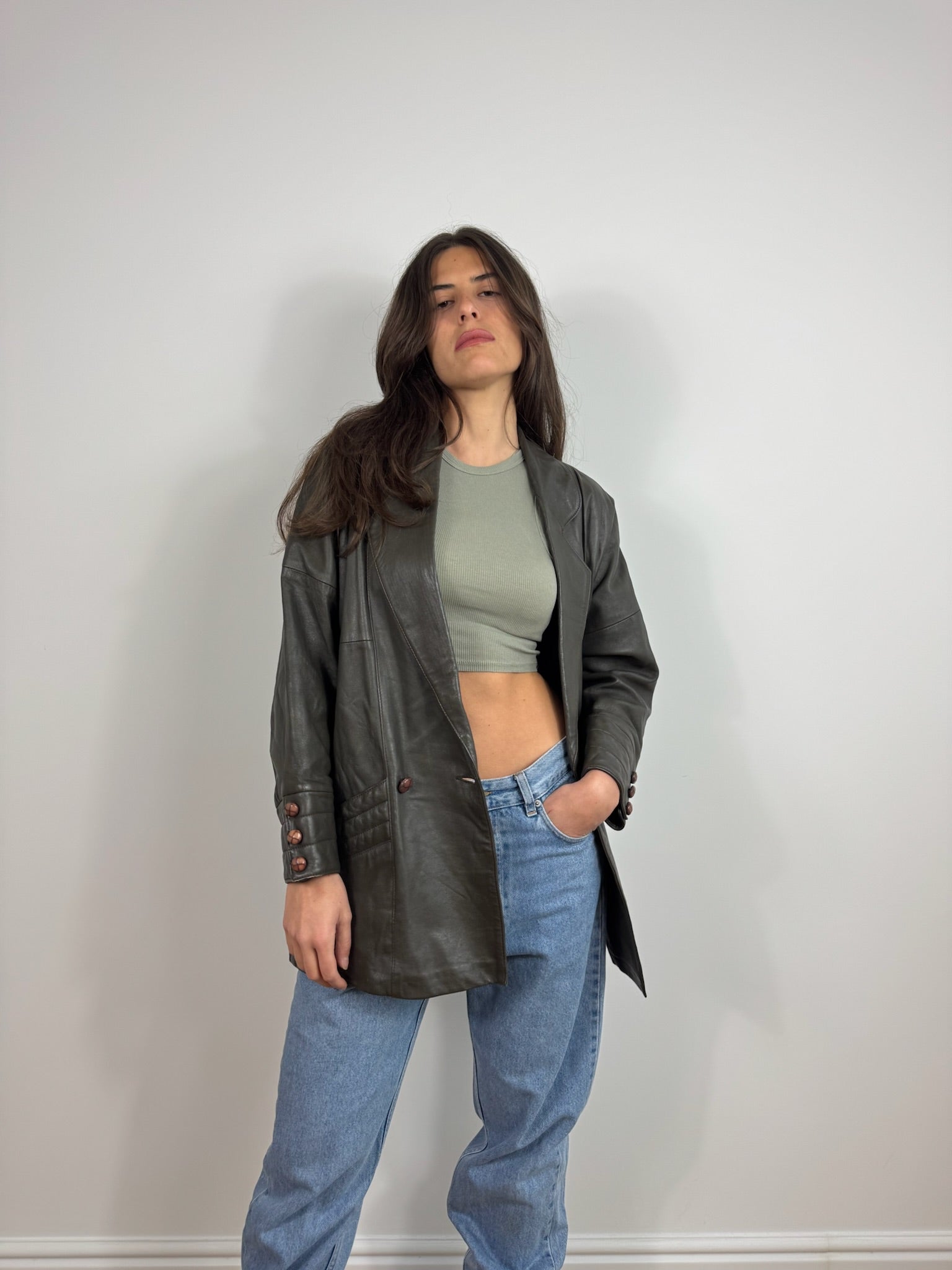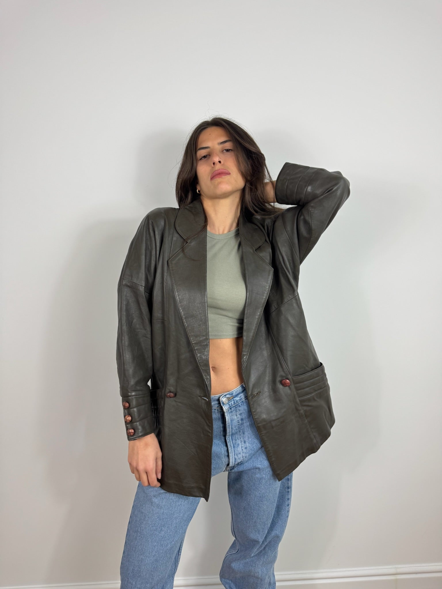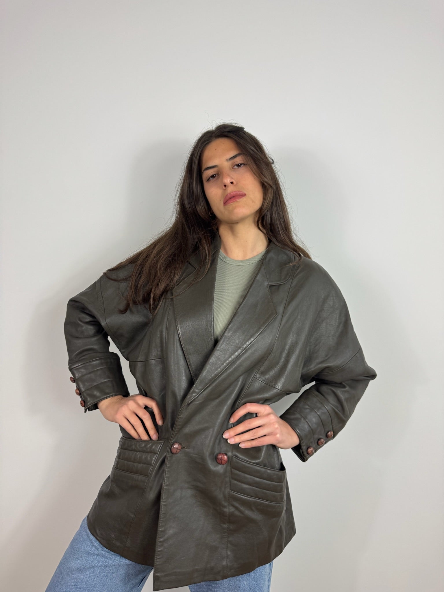 Giacca doppio petto vintage in pelle, dal colore verde oliva scuro, la vestibilità è oversize, con spalle strutturate e una linea dritta che cade fluida sul corpo. Chiusura doppiopetto, con grandi bottoni tono su tono in stile tartarugato, aggiunge un tocco anni ’80.