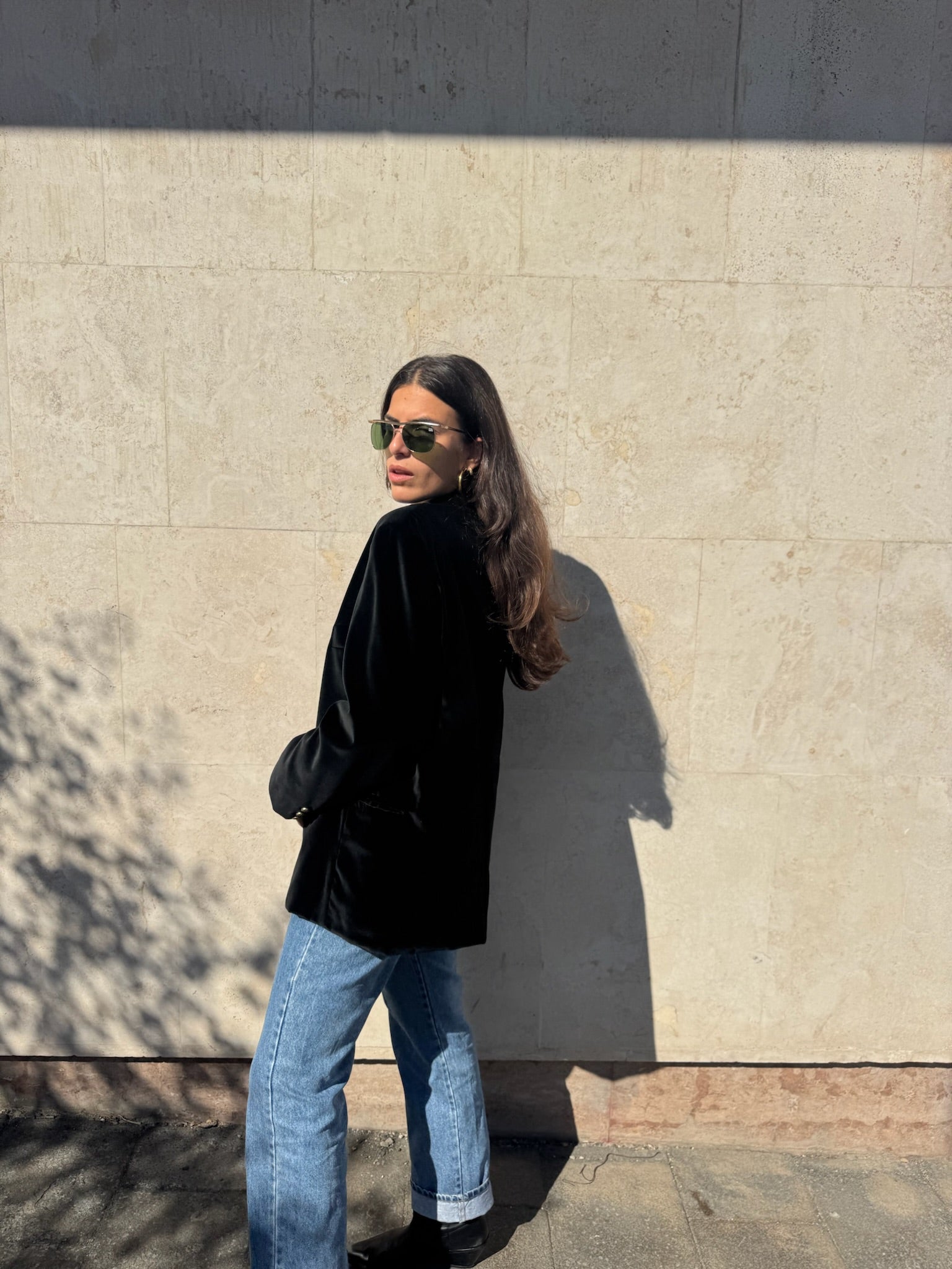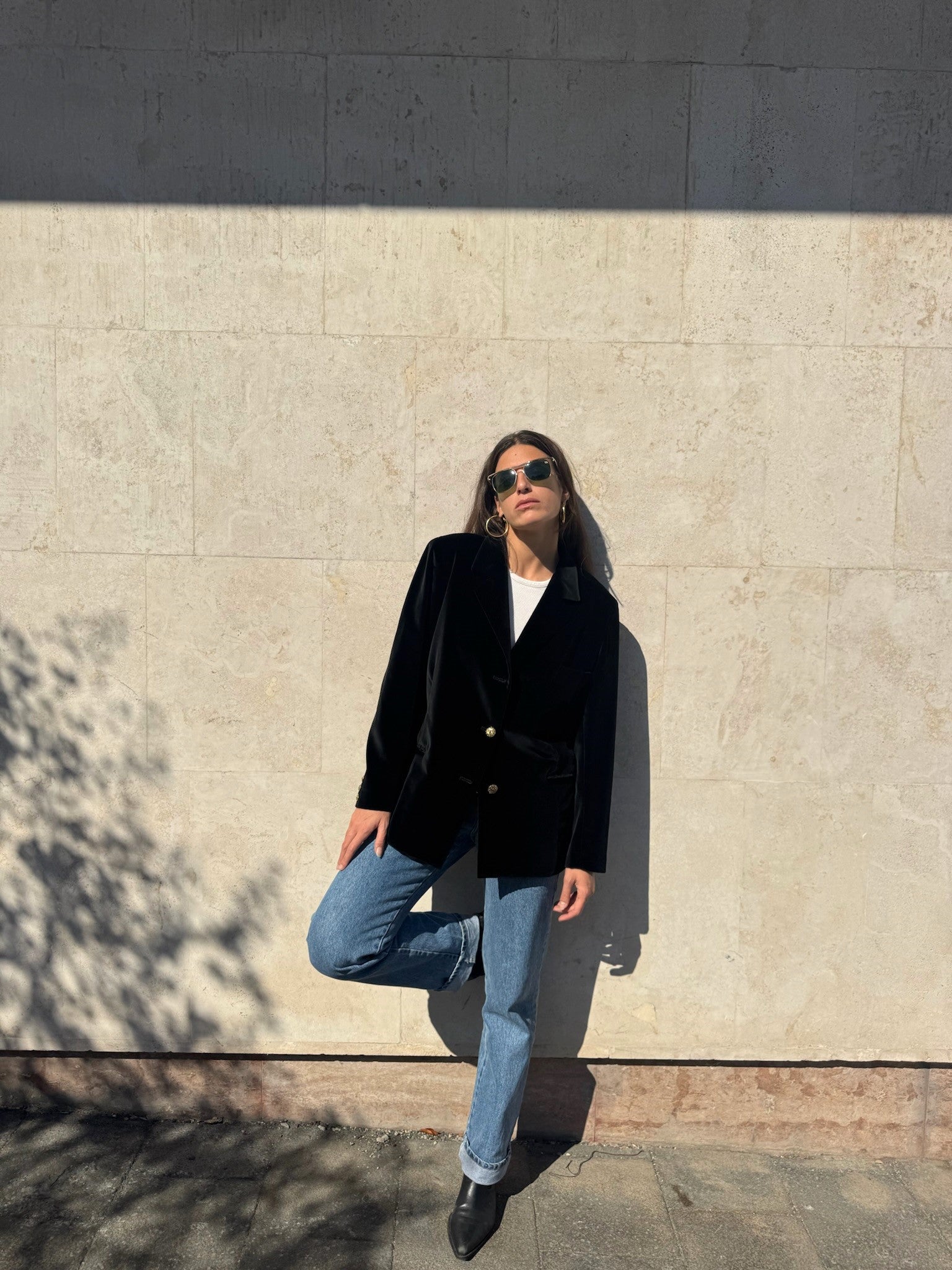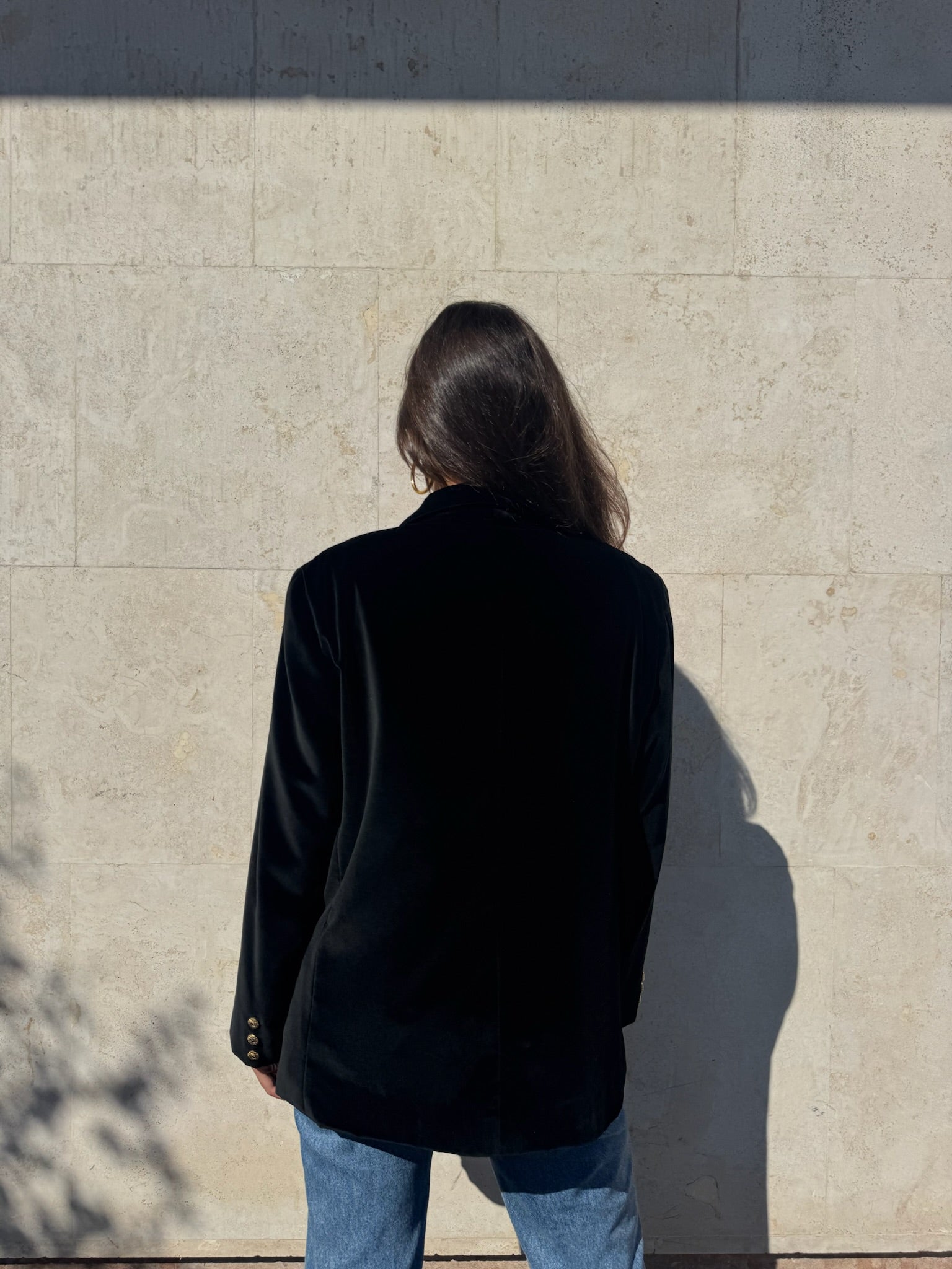 Blaser nera in velluto dal taglio morbido, riporta una chiusura con tre bottoni dorati sul davanti dallo stile retrò e sono ripetuti su entrambi i polsini. Colletto classico con revers medio. Due tasche frontali a filetto.
