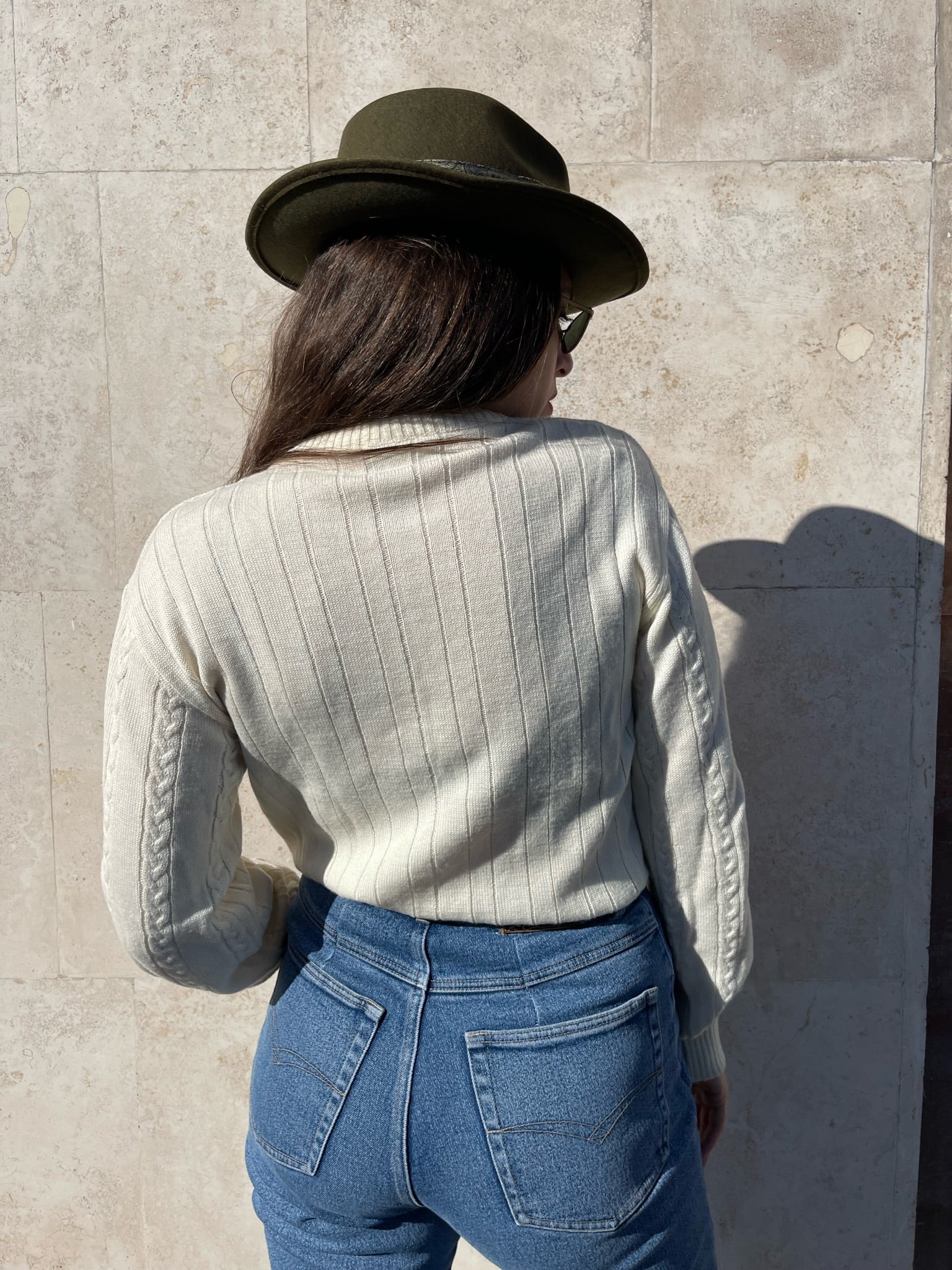Pull bianco a girocollo a costine con lavorazione a trecce frontale, morbido e caldo.