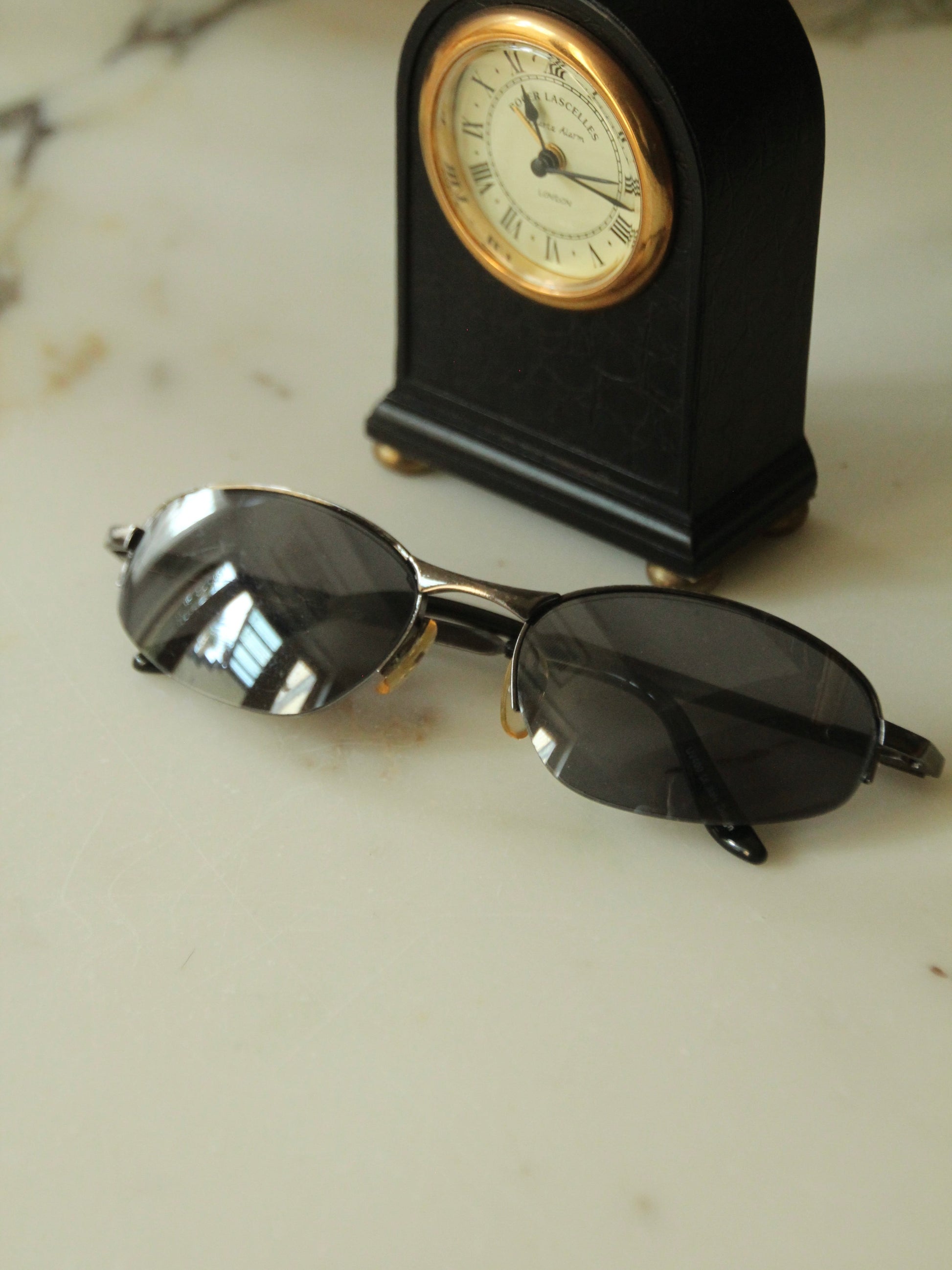 Occhiali da sole vintage avvolgenti, caratterizzati dalla classica montatura che segue la curva del viso offrendo protezione dal sole sia frontale che laterale. Montatura e aste in metallo. Lente scura in plastica.