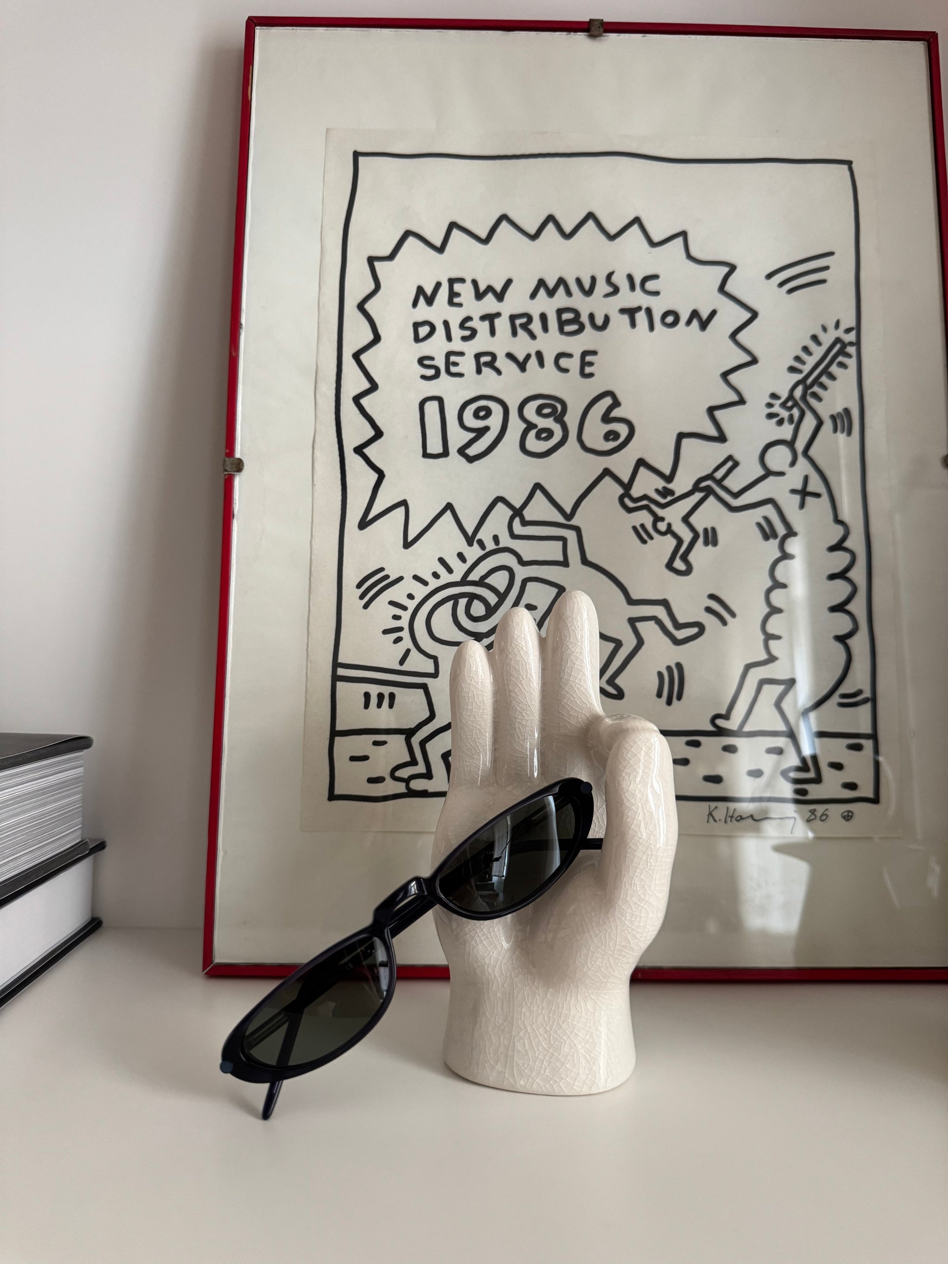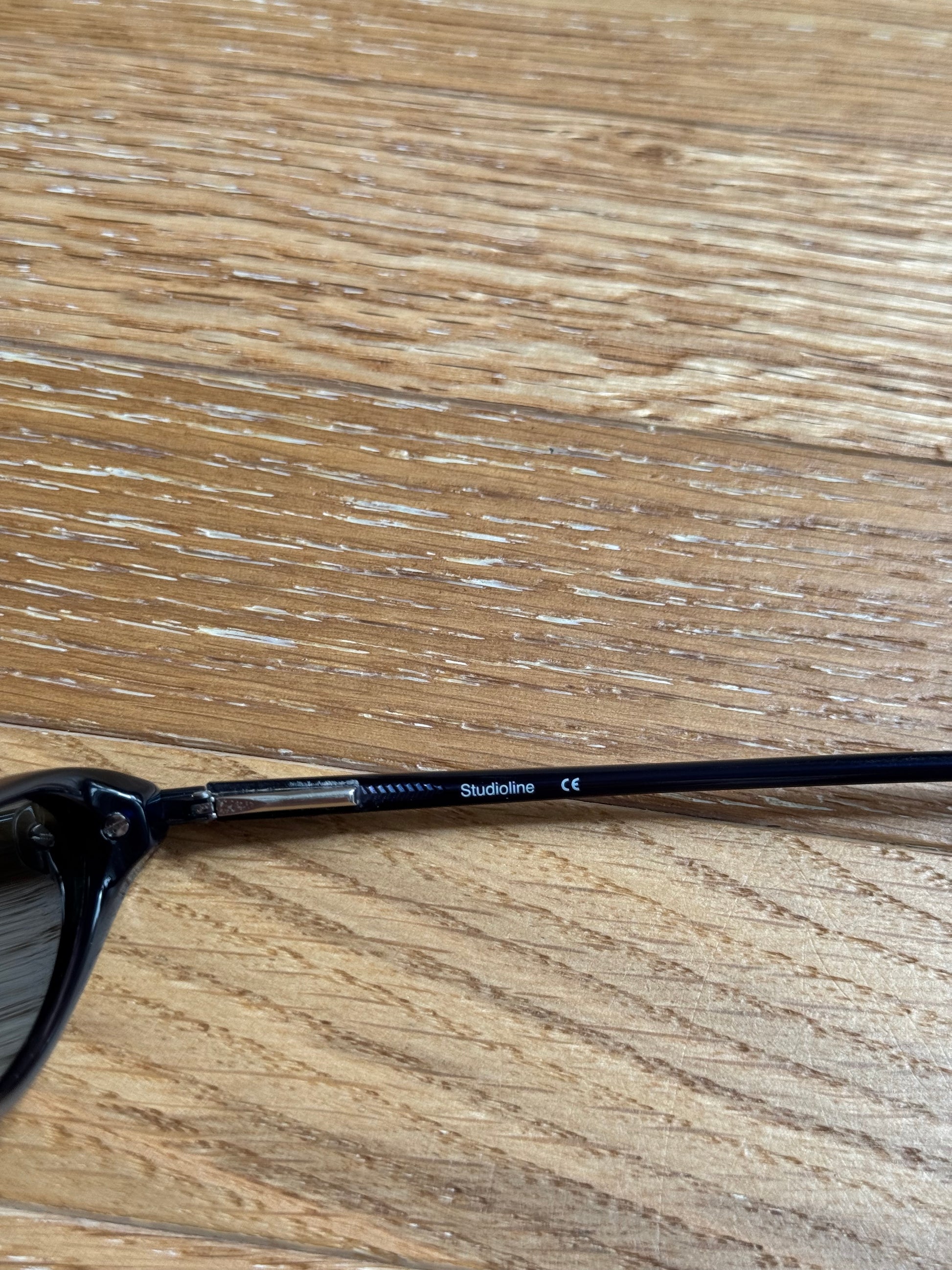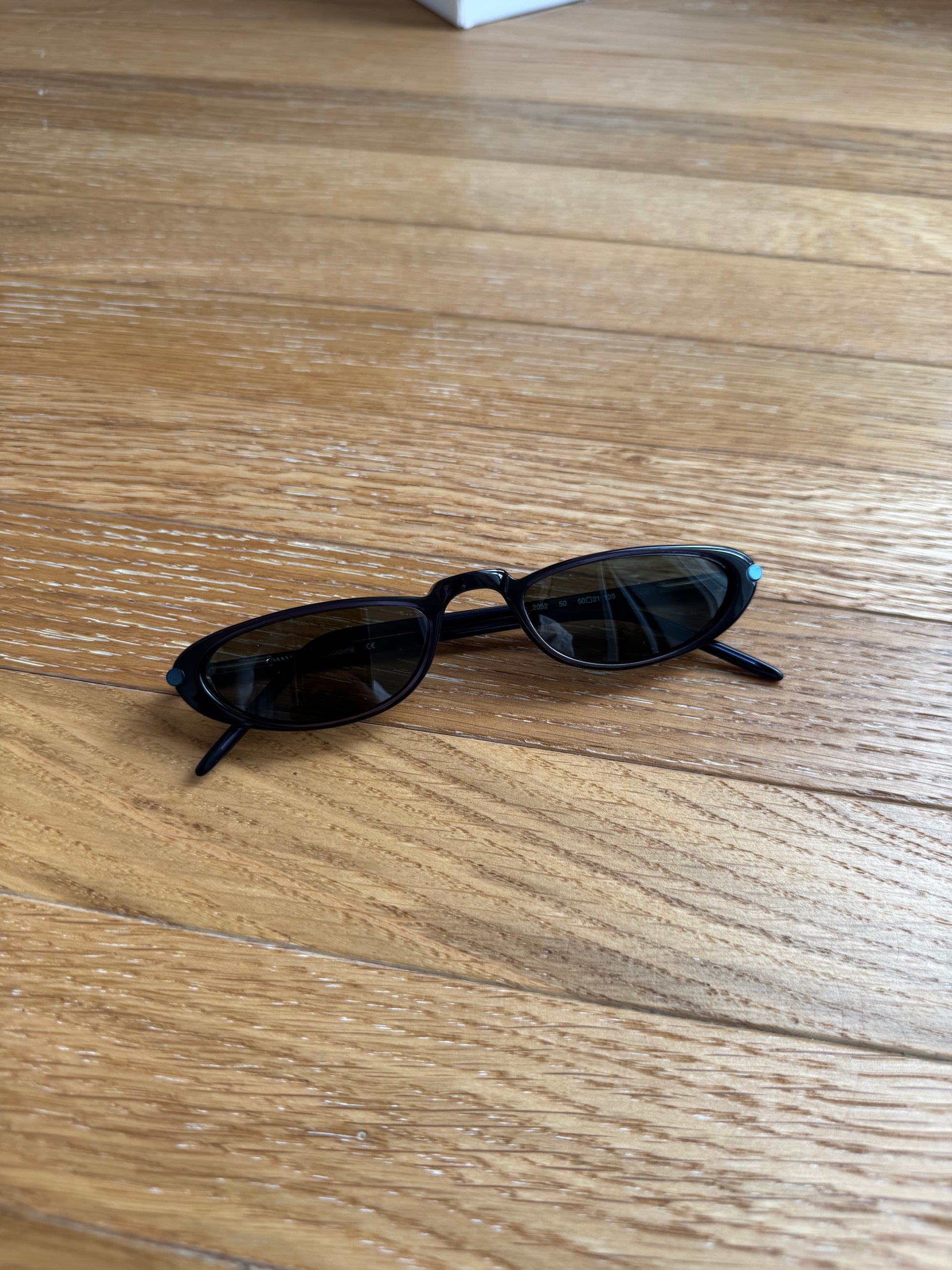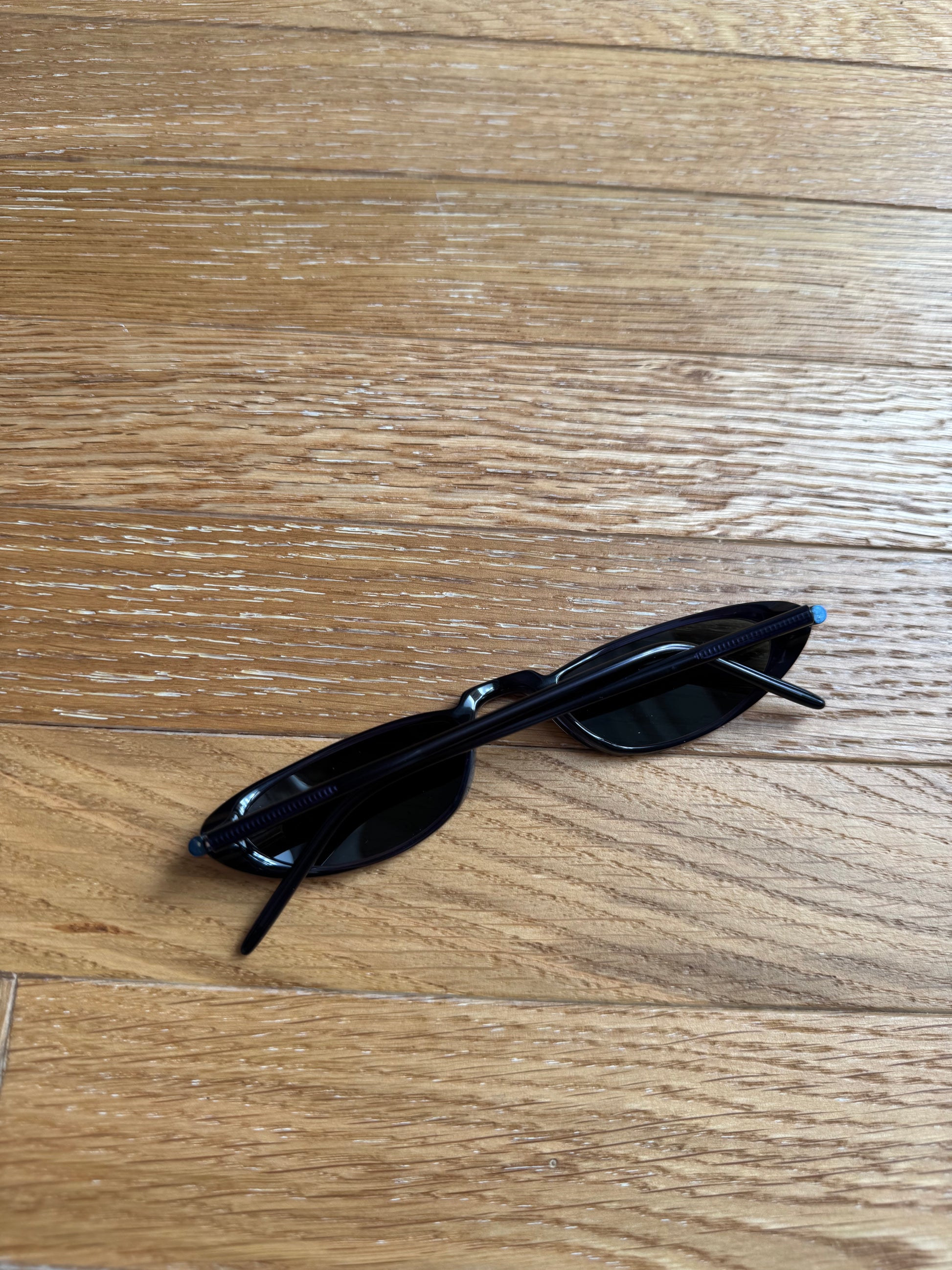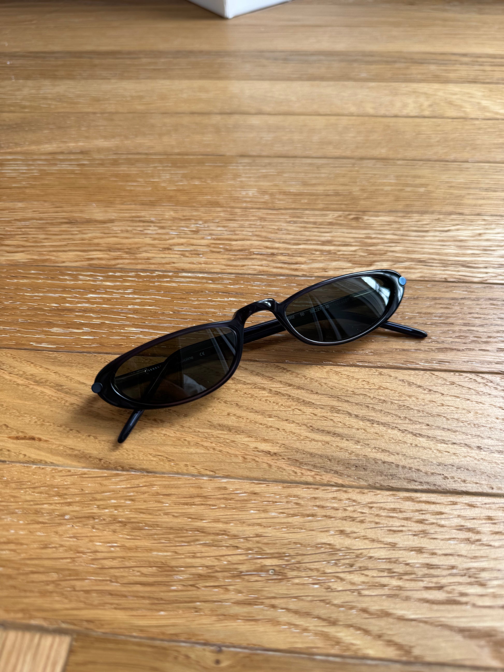 Occhiali da sole dalla forma rettangolare stretta che richiama uno stile retrò, in plastica nera lucida. Design pulito con aste sottili.