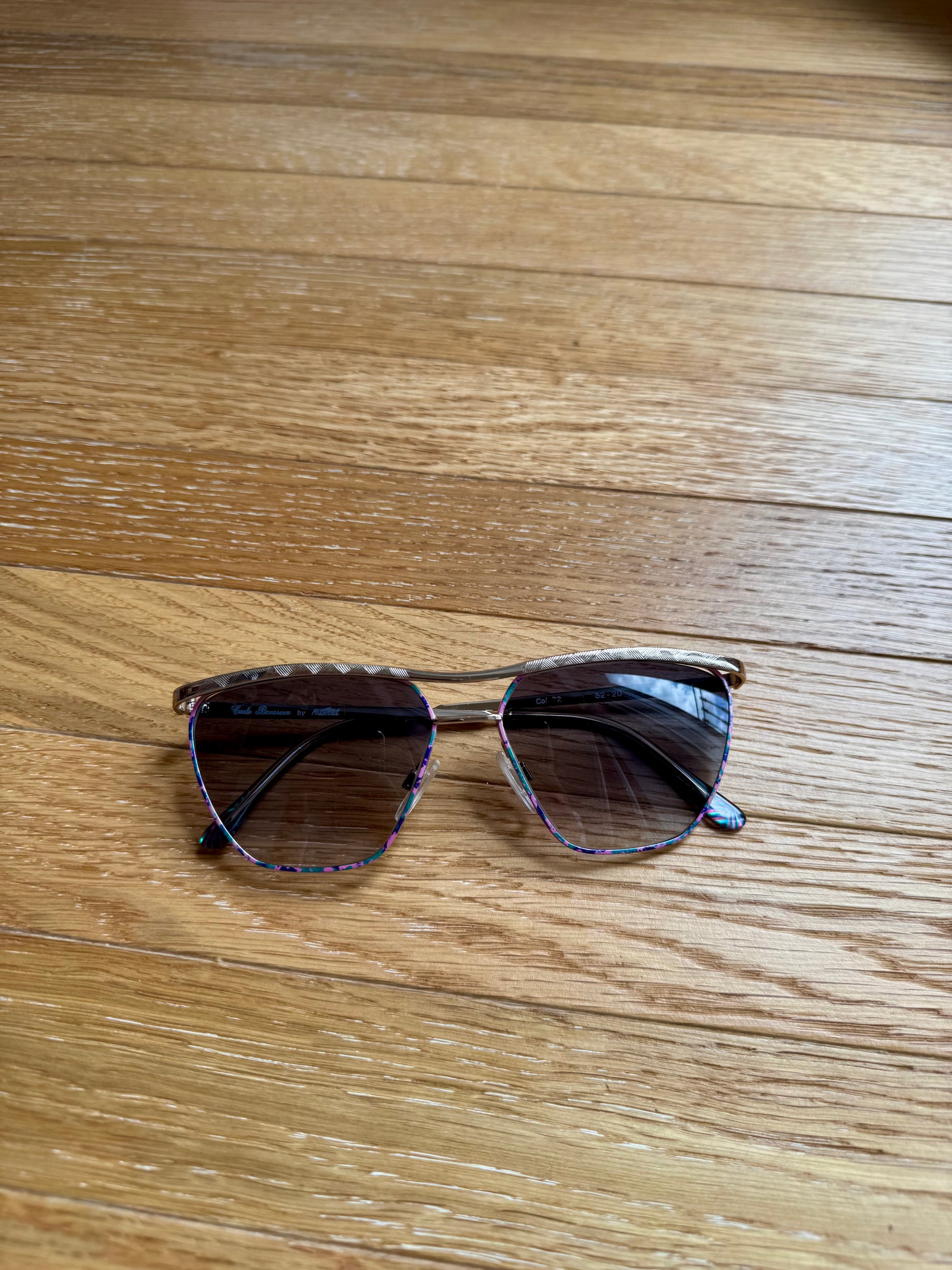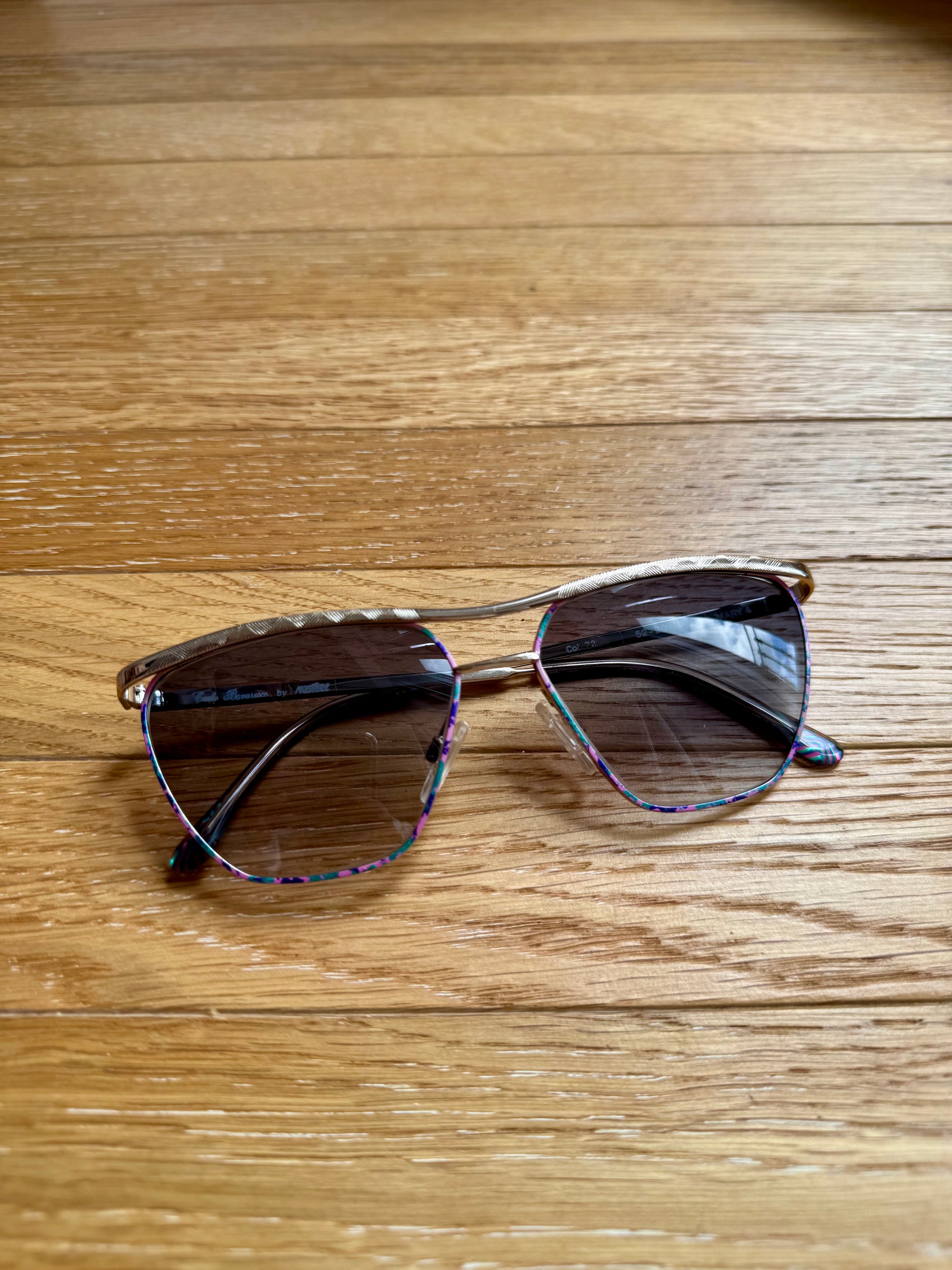 Occhiali da sole vintage dalla forma squadrata leggermente arrotondata, la montatura è formata da una parte superiore in metallo con effetto particolare e, parte inferiore circondata da una montatura multicolor. Le lenti in vetro hanno una leggera sfumatura grigia con effetto specchiato.