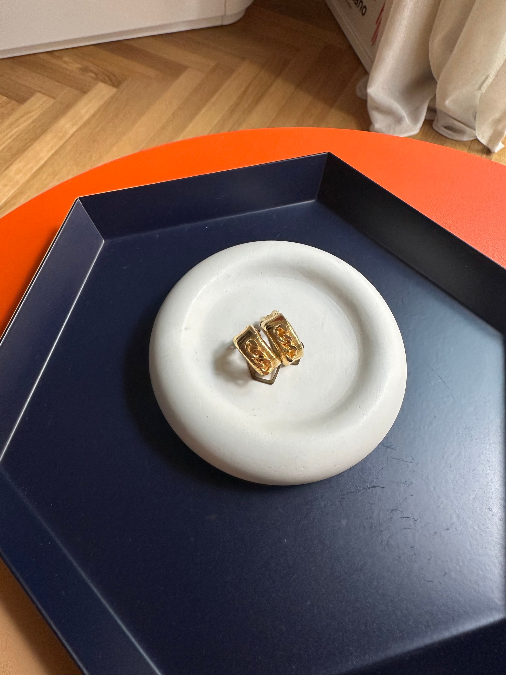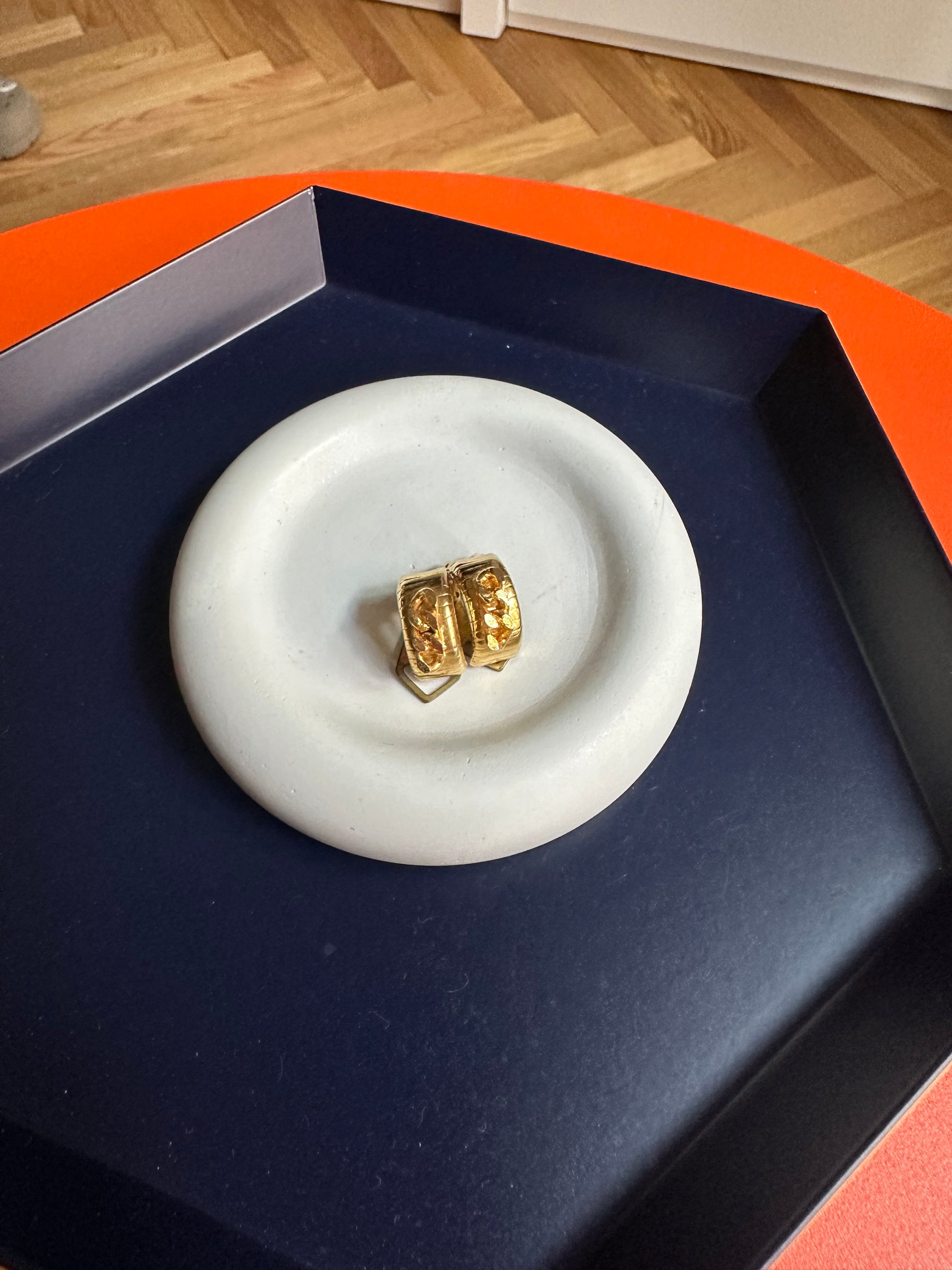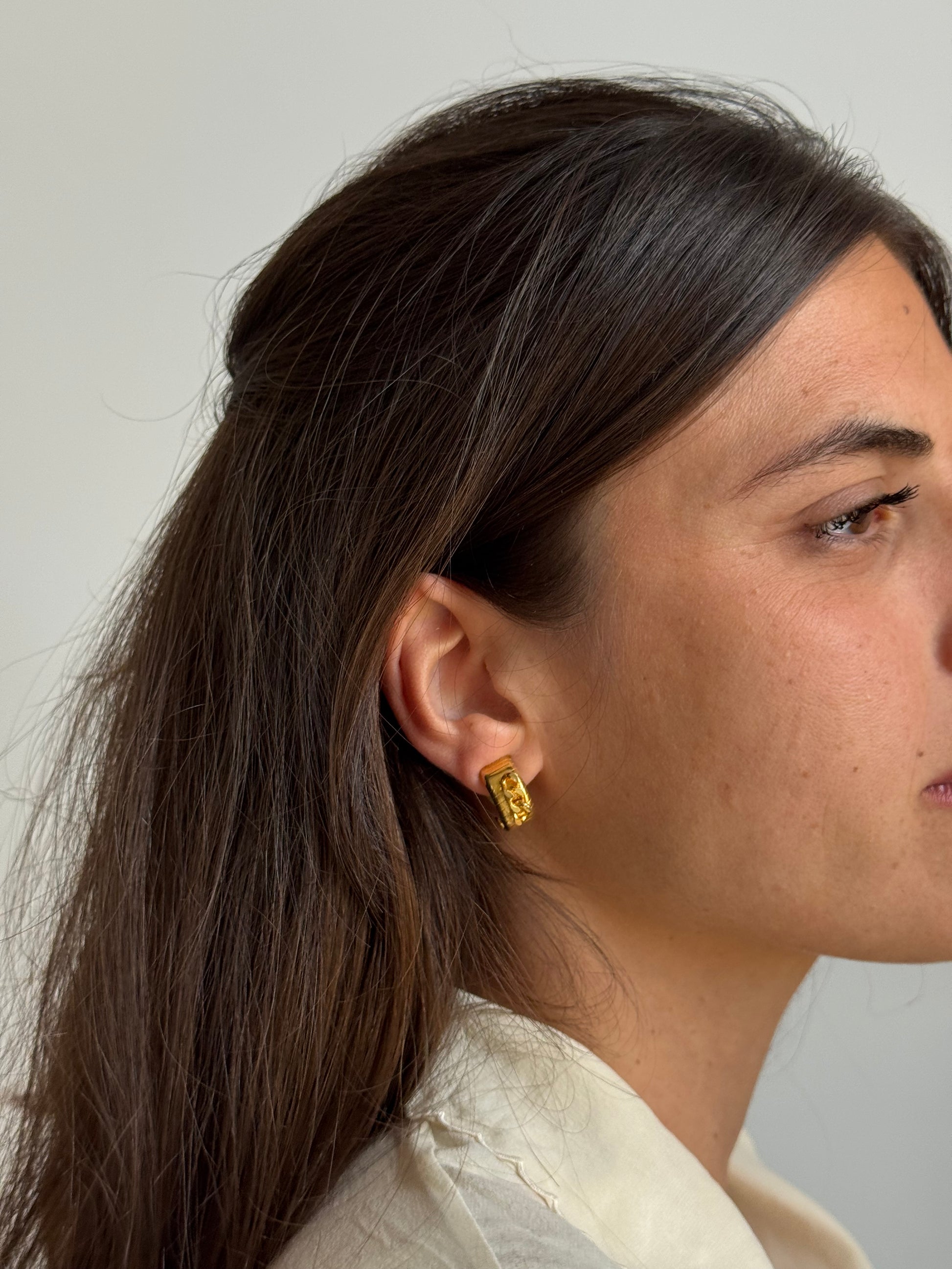 Orecchini con clip dorati con decorazioni a rilievo dalla forma leggermente bombata.
