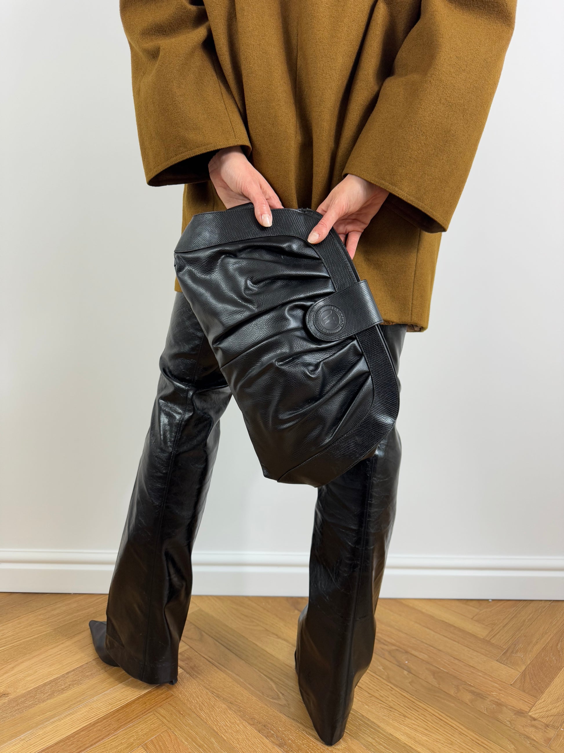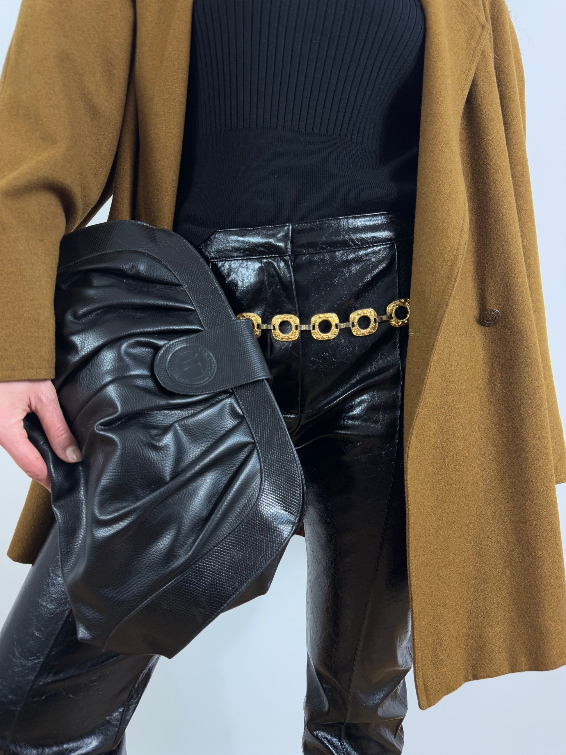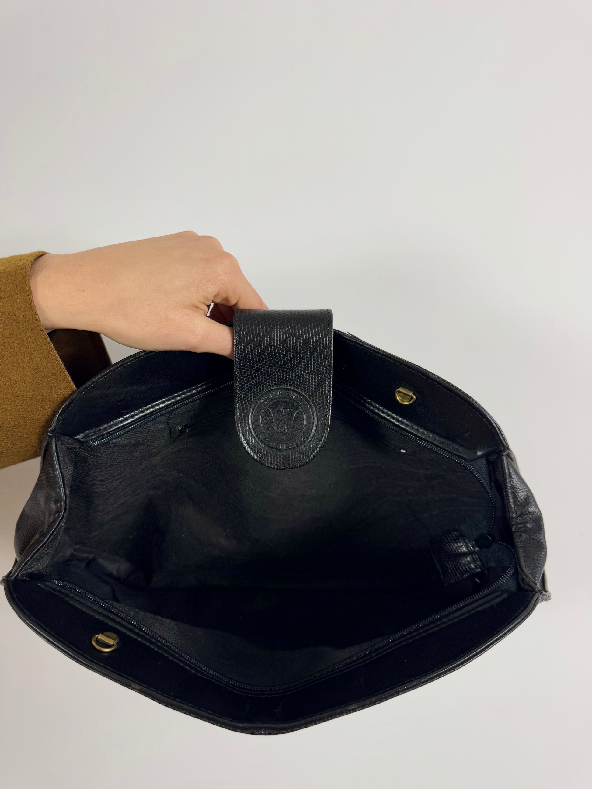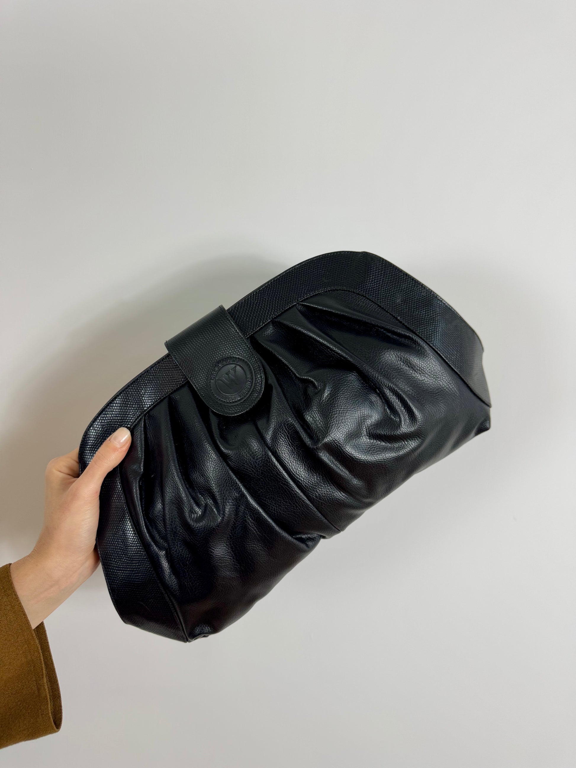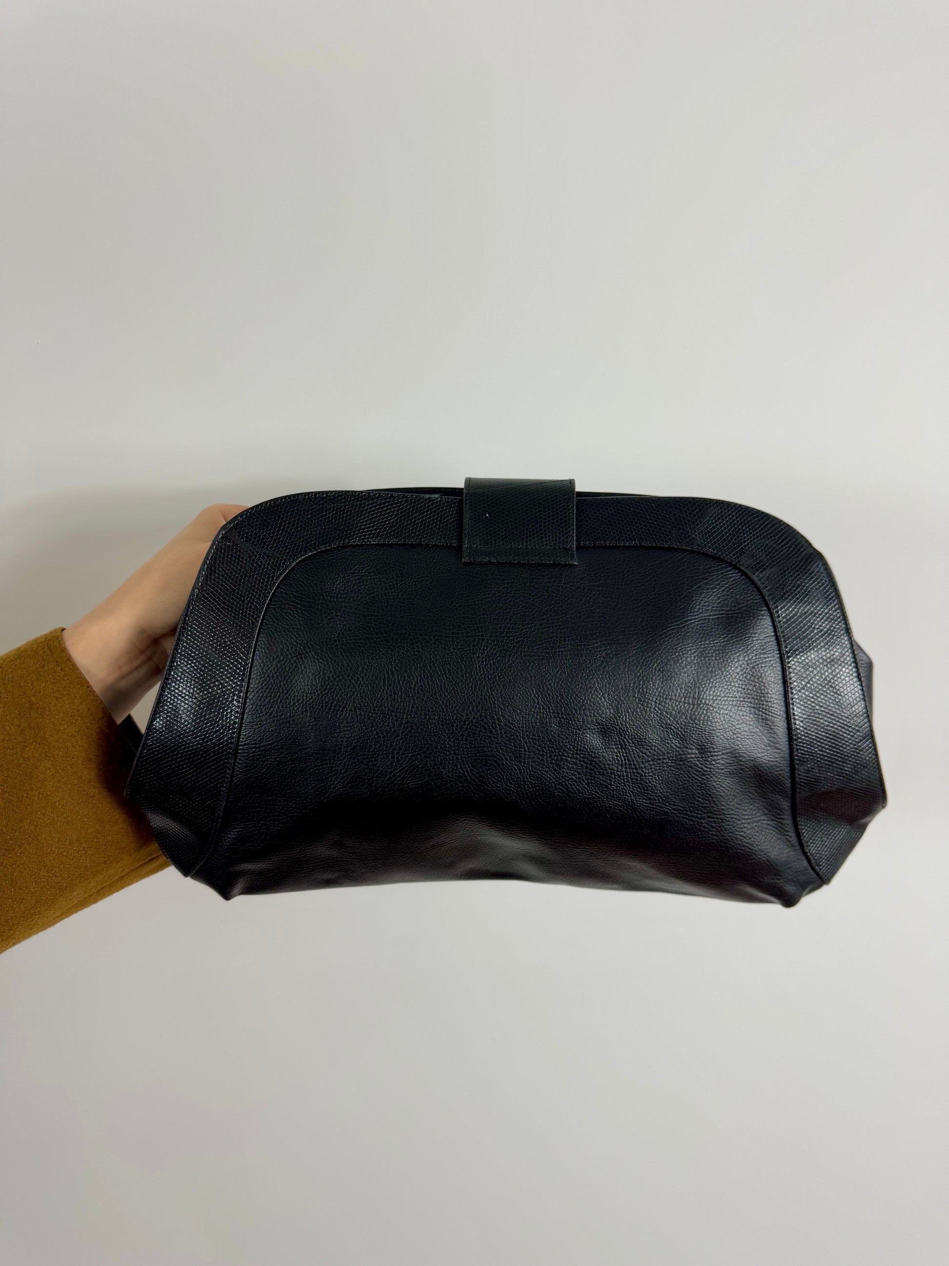 Clutch in vera pelle nera dalla forma rettangolare con angoli morbidi , leggermente bombata. Caratterizzata da due diverse texture: parte centrale in pelle liscia con effetto drappeggiato, bordo in pelle con effetto lucertola a contrasto. Chiusura con zip e bottone a pressione frontale. Riporta dei ganci interni ma manca la tracolla,