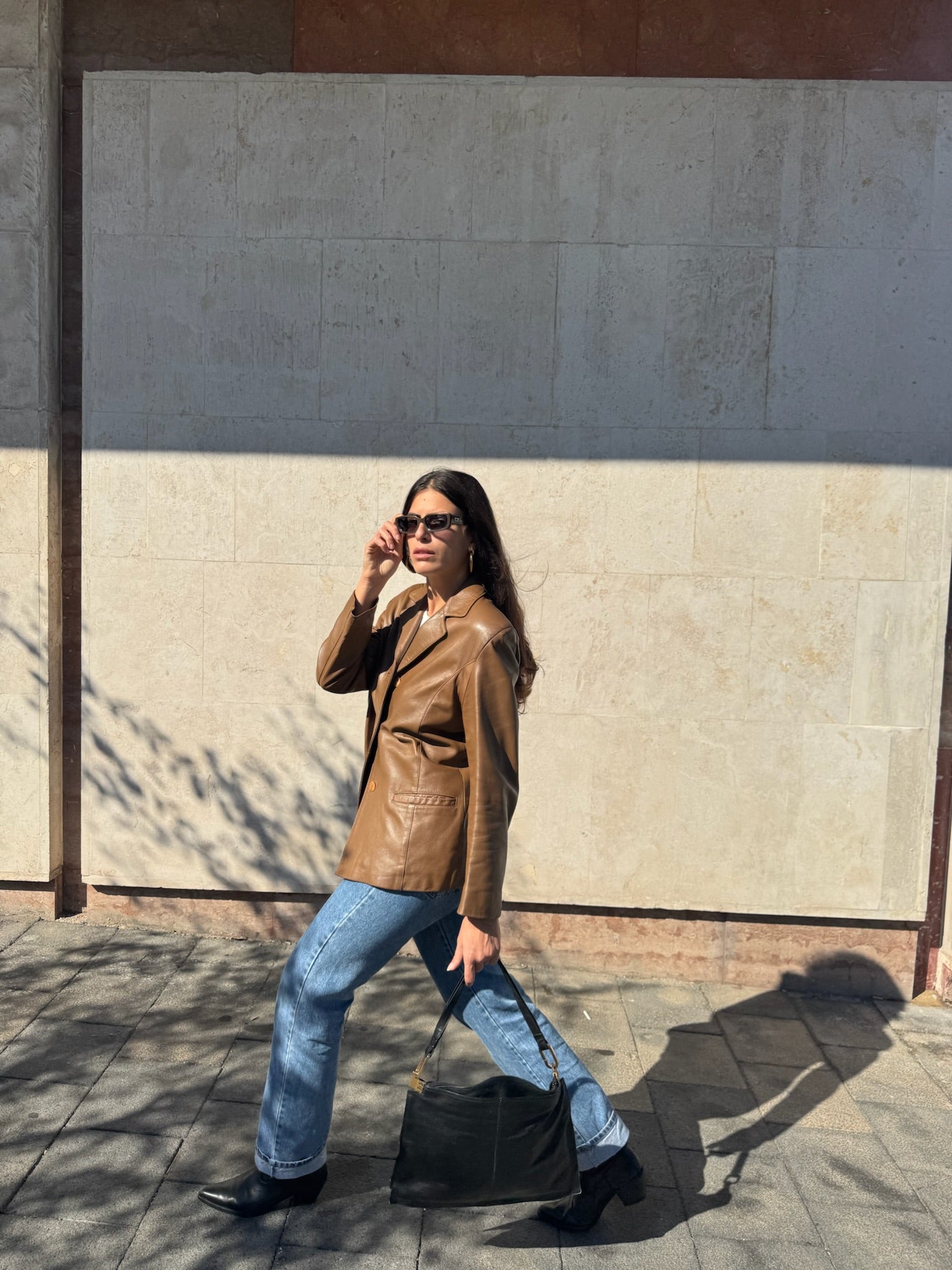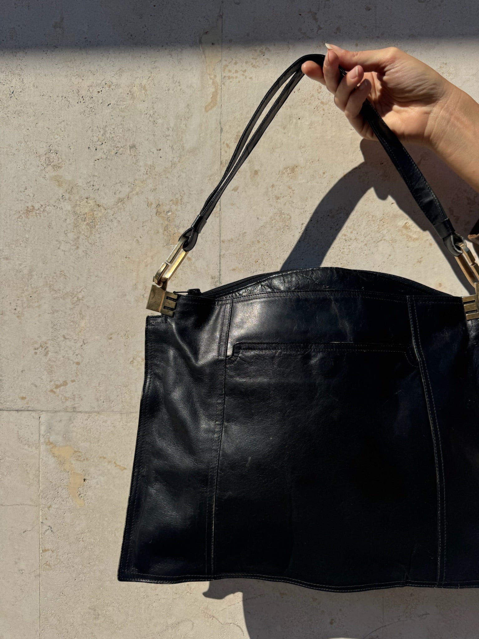 Borsa nera in vera pelle dalla forma leggermente squadrata, con dettagli dorati ai lati; comoda da indossare a spalla o da portare a mano. Internamente foderata in camoscio con tasca con zip.