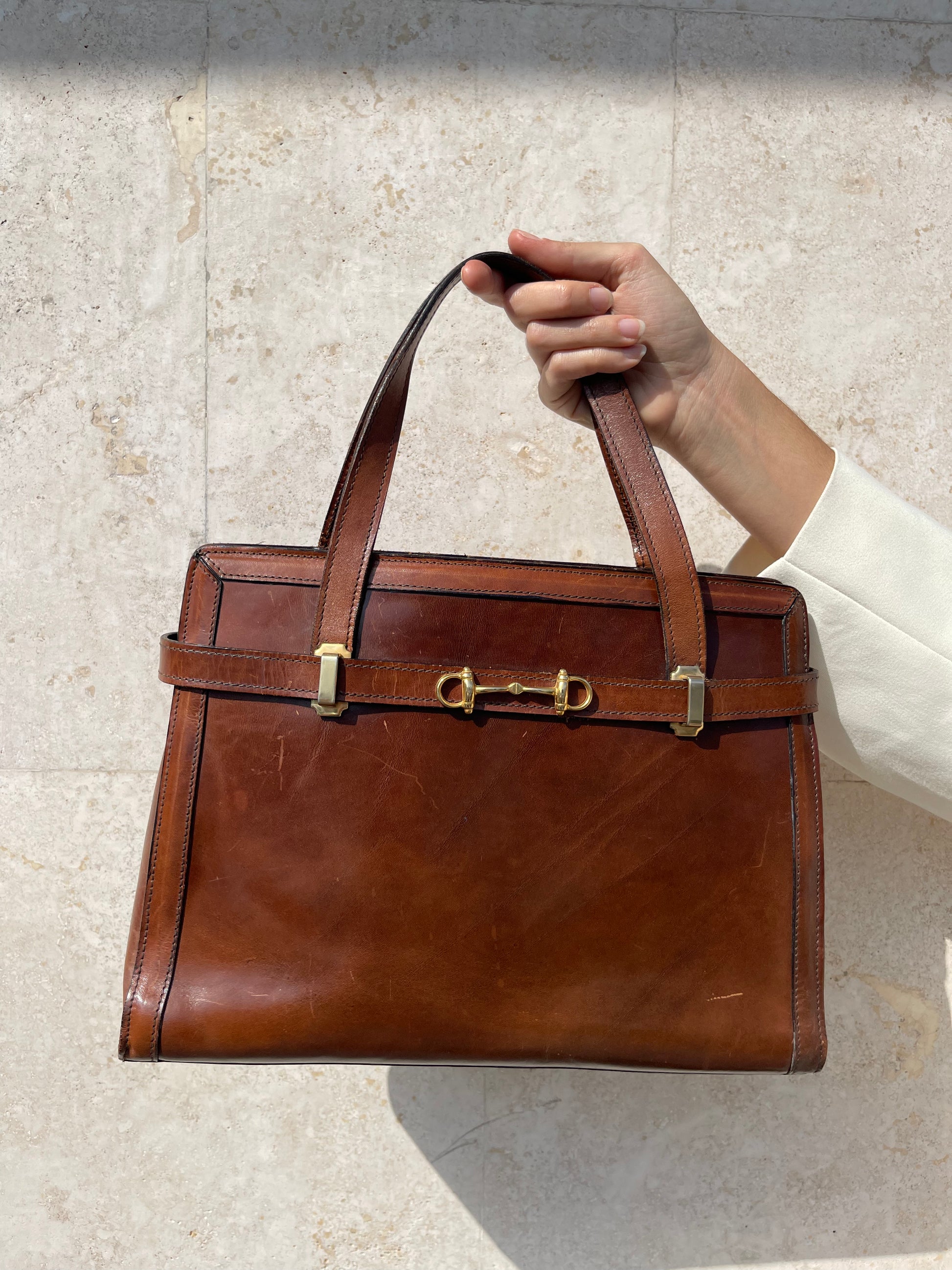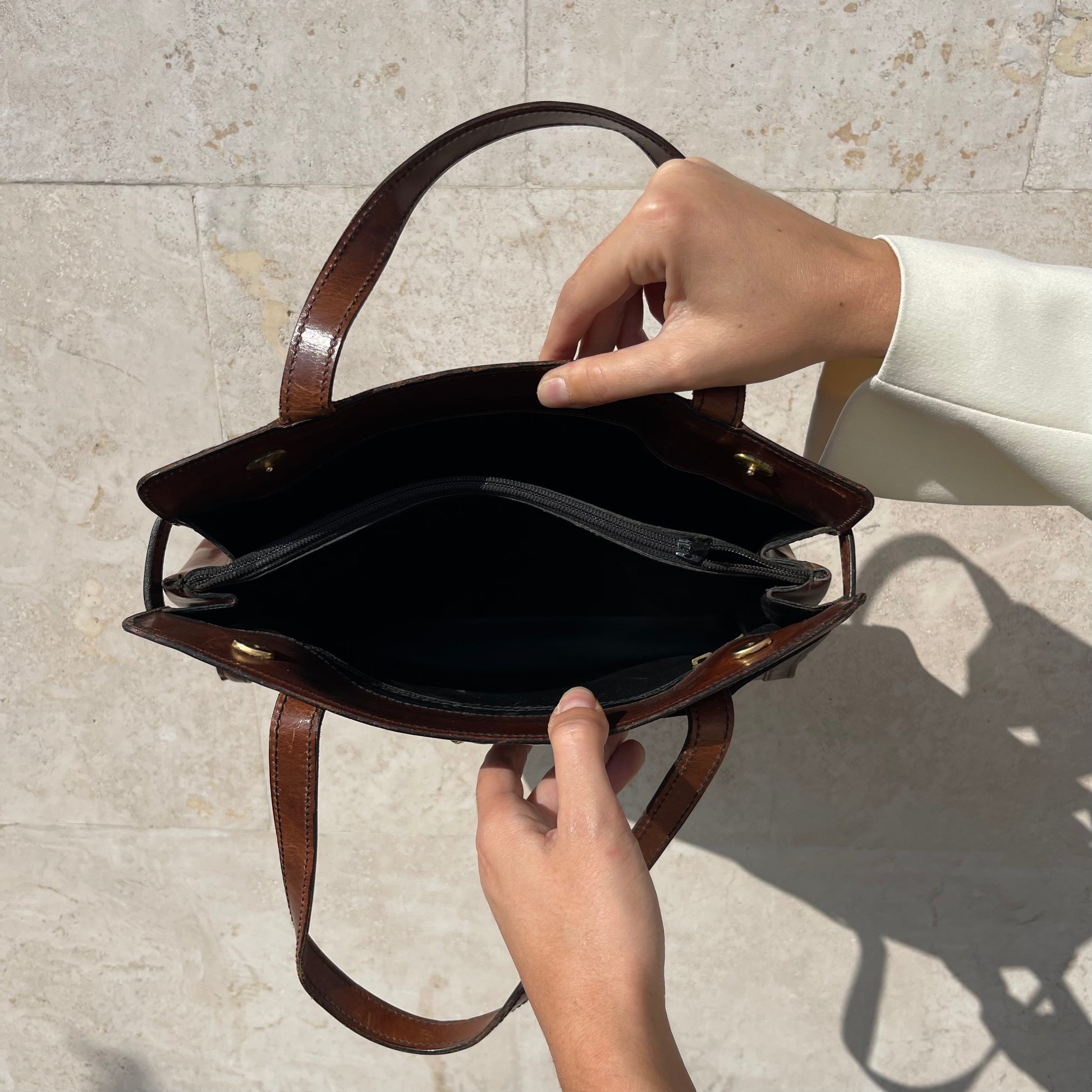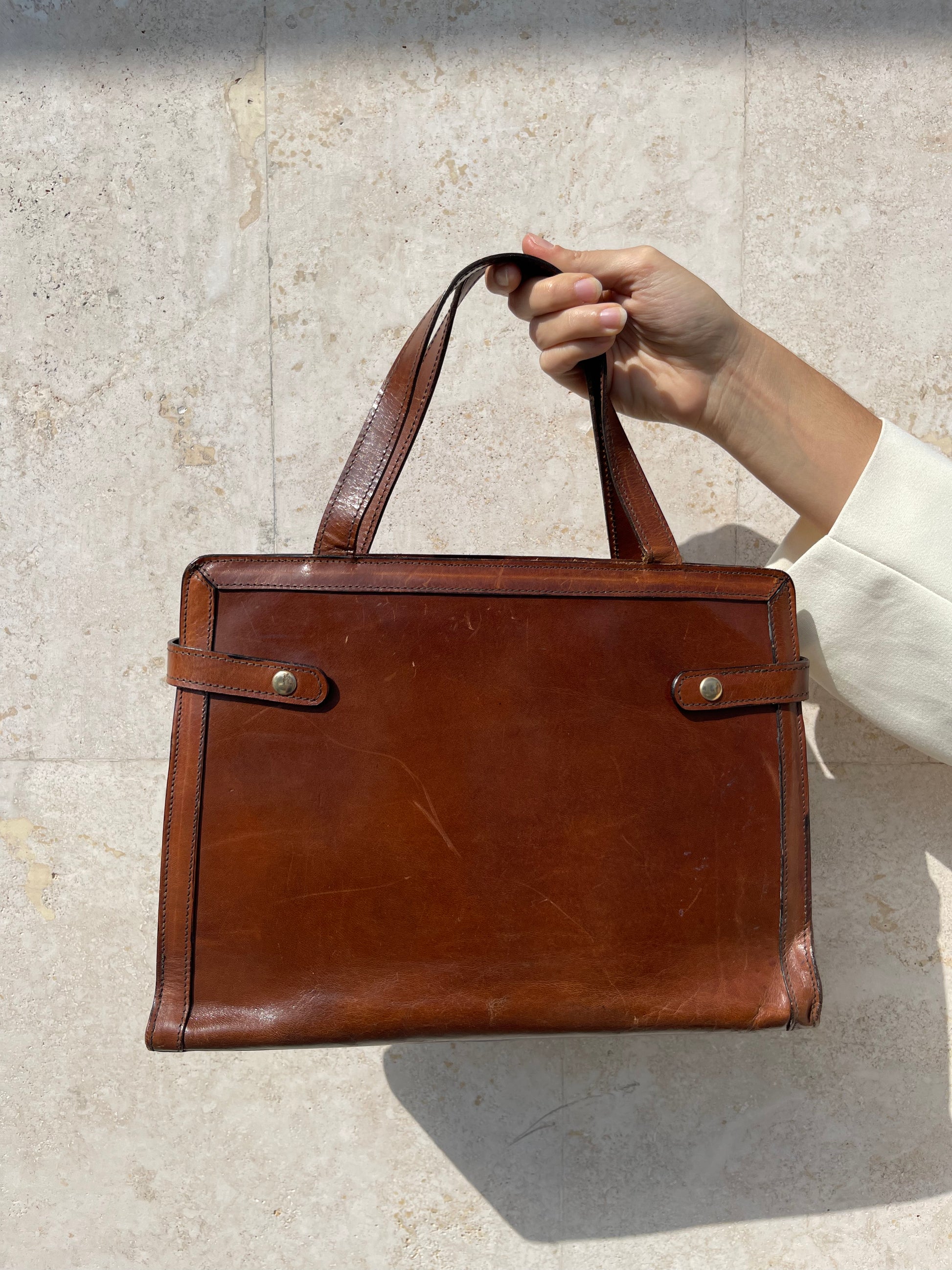 Borsa vintage in vera pelle marrone con doppi manici per portarla a mano.