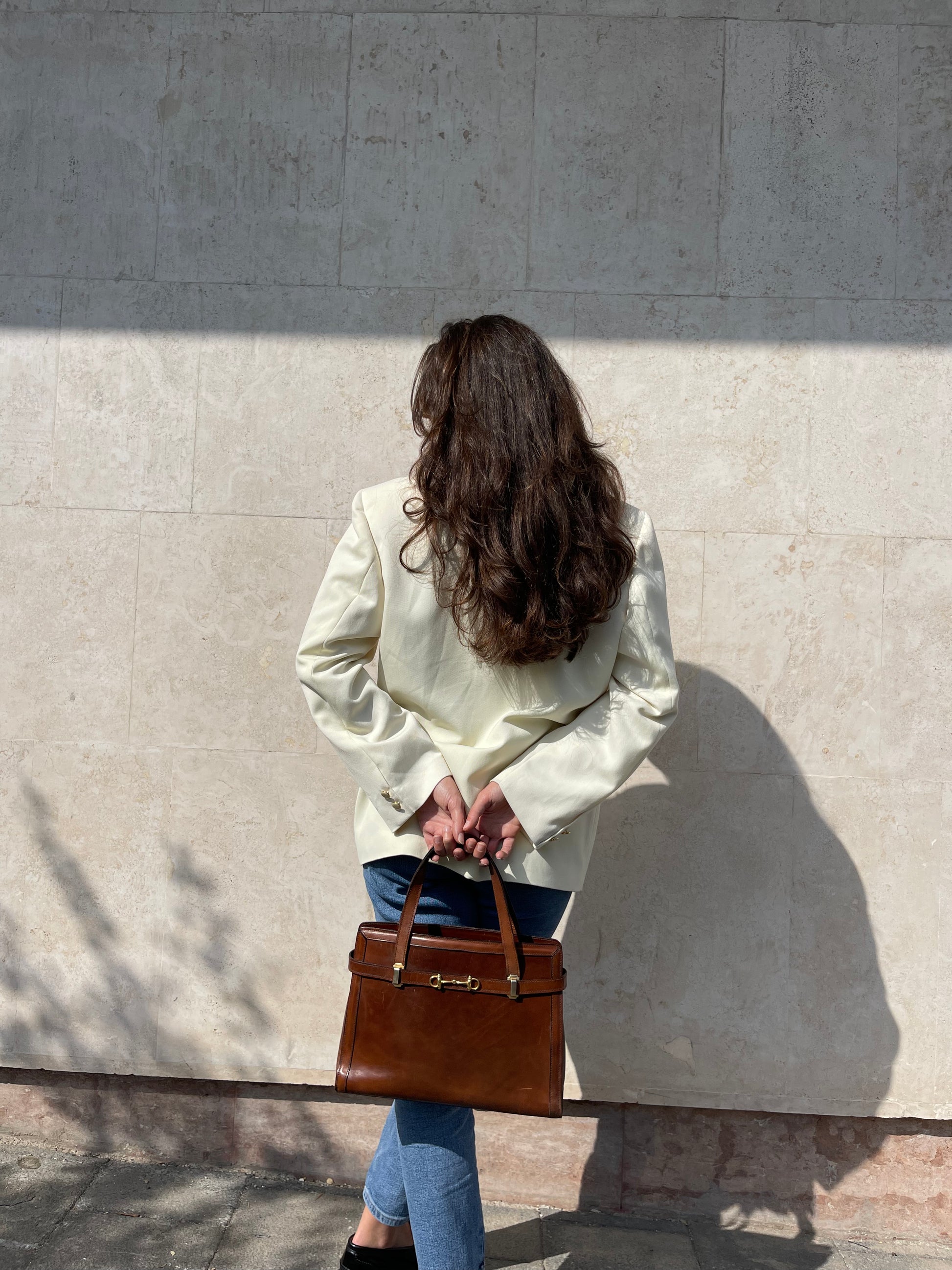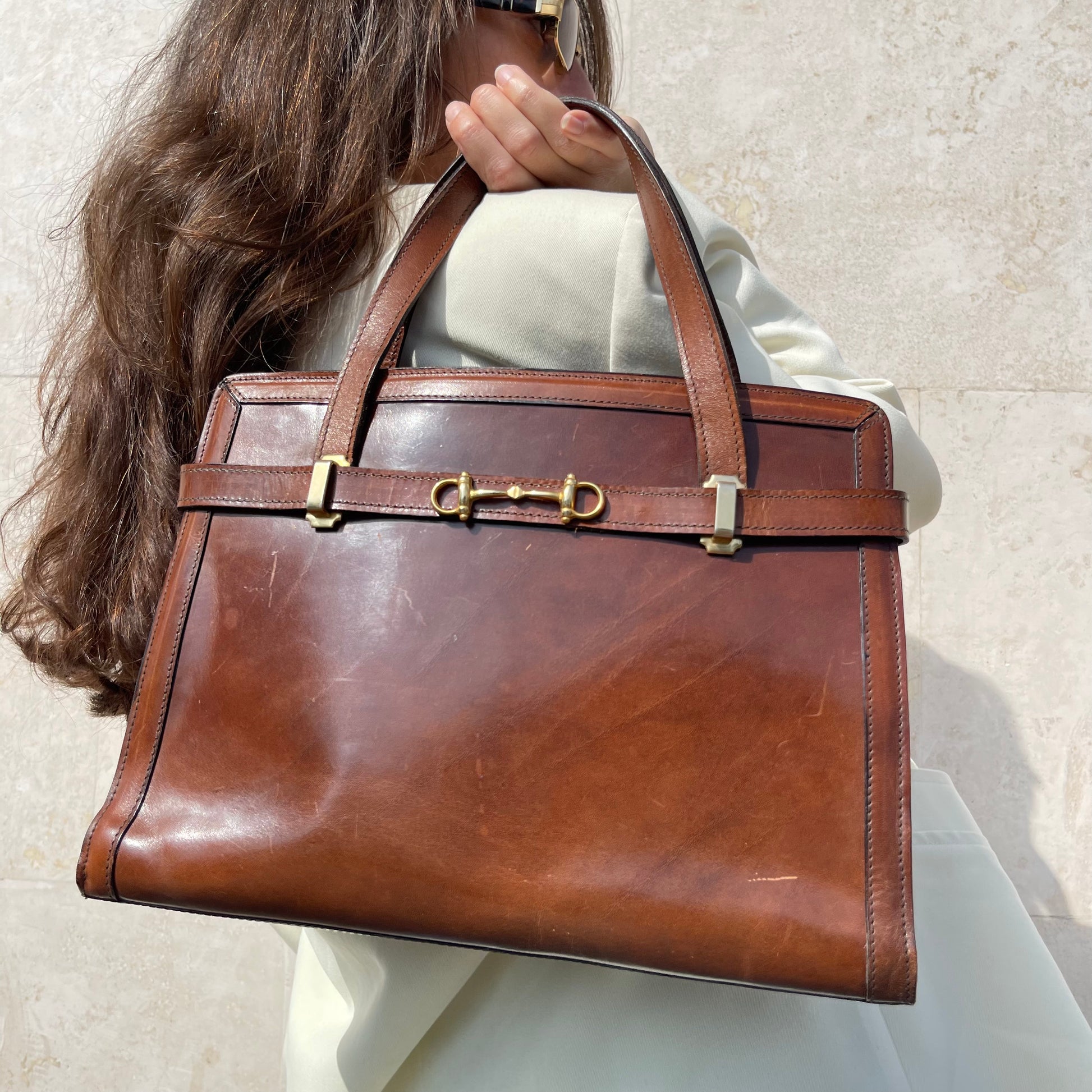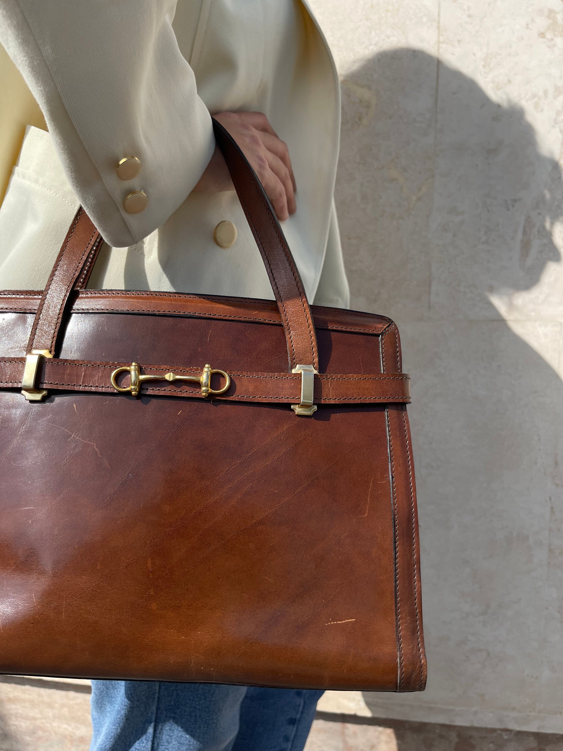 Borsa vintage in vera pelle marrone con doppi manici per portarla a mano.